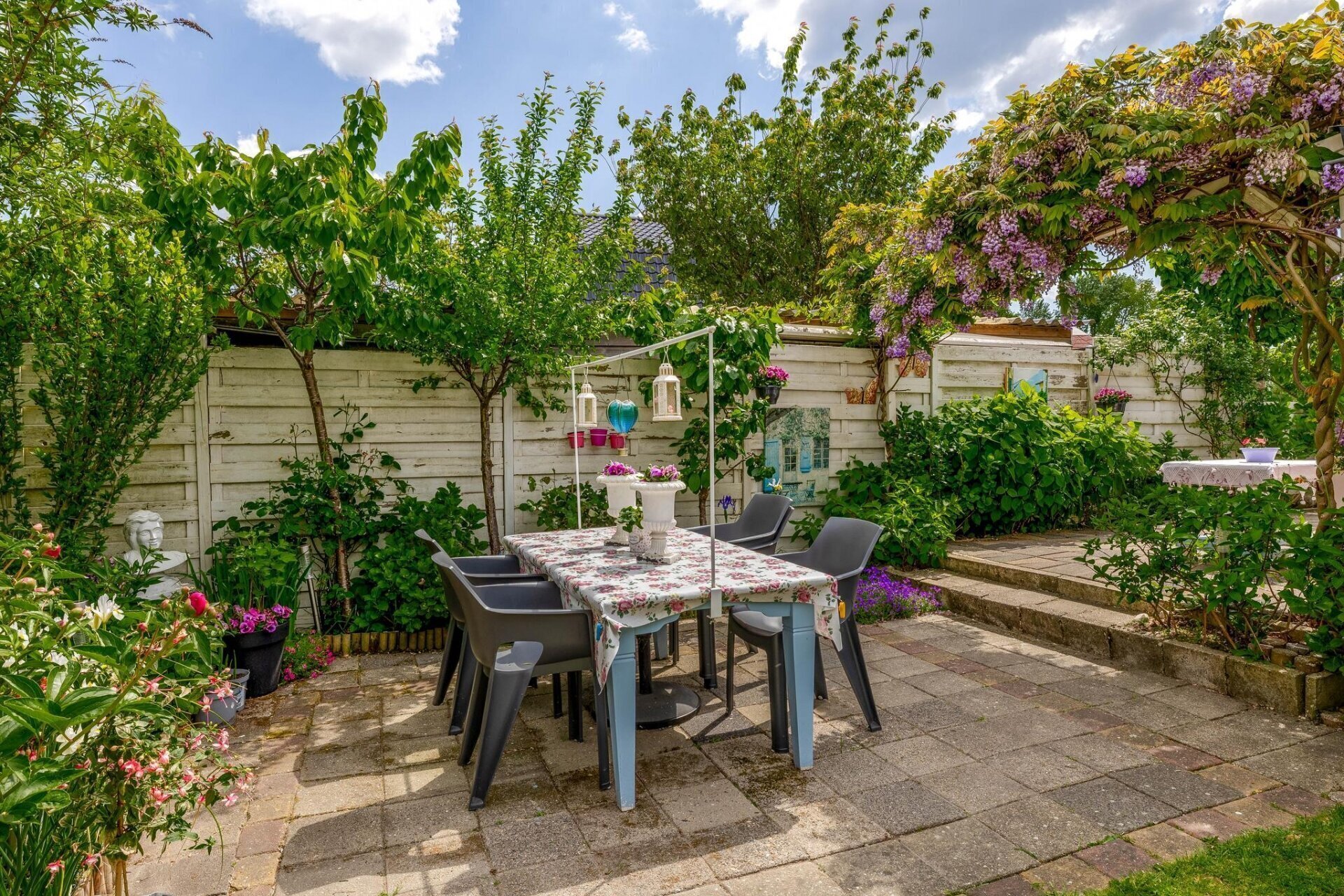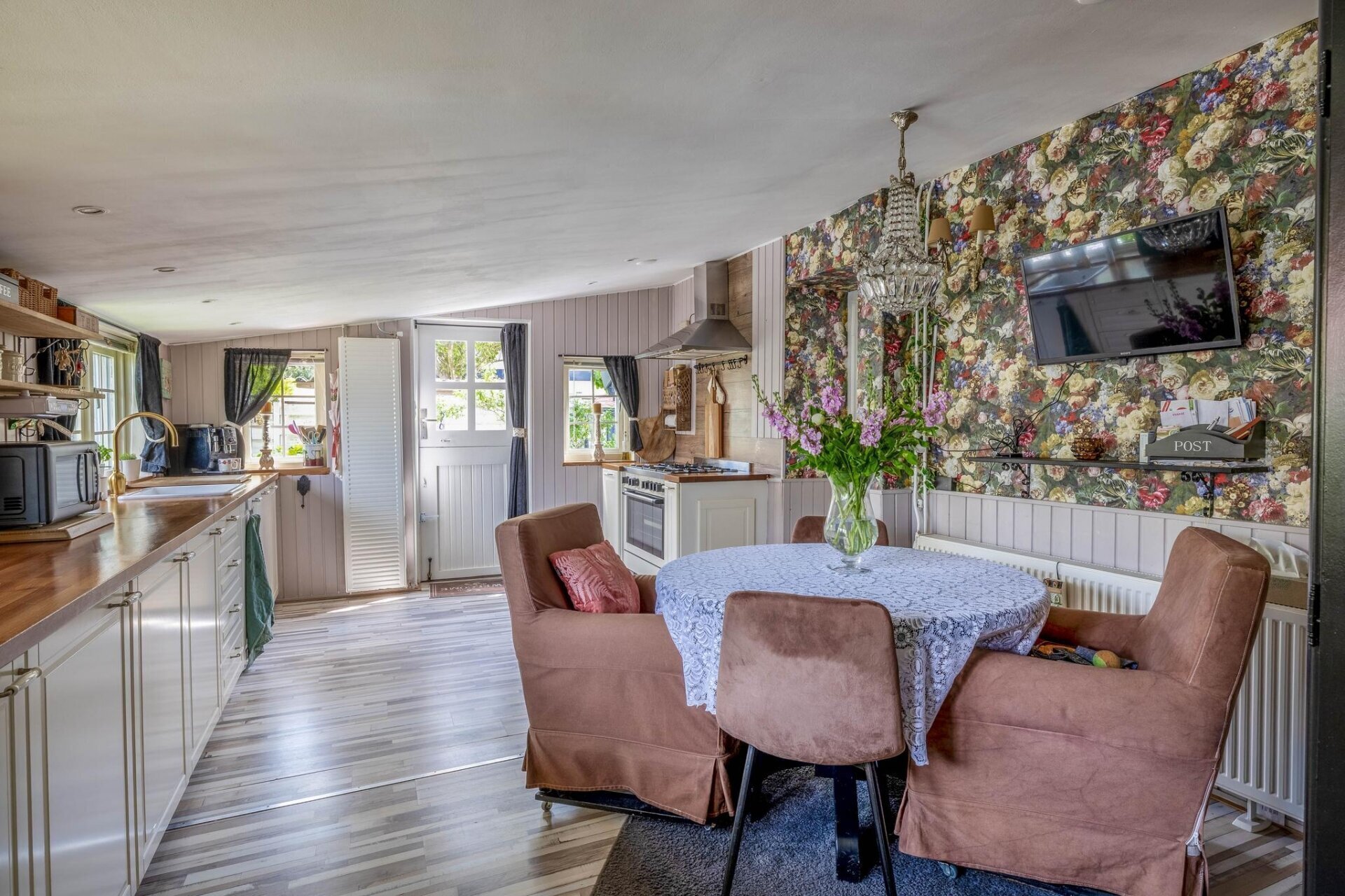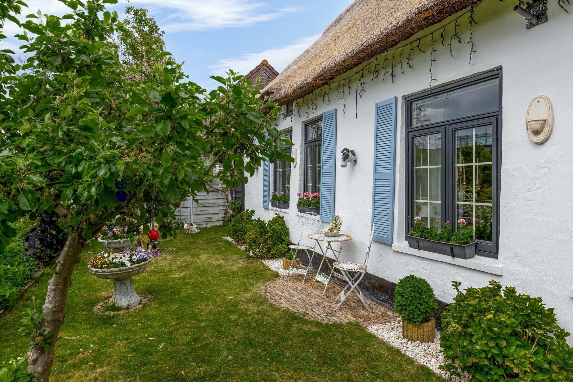 Buiten is minstens zo sfeervol als binnen. Rondom het huis ligt een verzorgde tuin met meerdere terrassen, waar je op elk moment van de dag een plekje in de zon of schaduw kunt kiezen. Dankzij de vrije ligging aan de rand van het dorp geniet je hier van rust, privacy en groen om je heen. Achterin de tuin staat een vrijstaande houten berging van ca. 10 m² – handig voor je fietsen, gereedschap of als werkruimte.