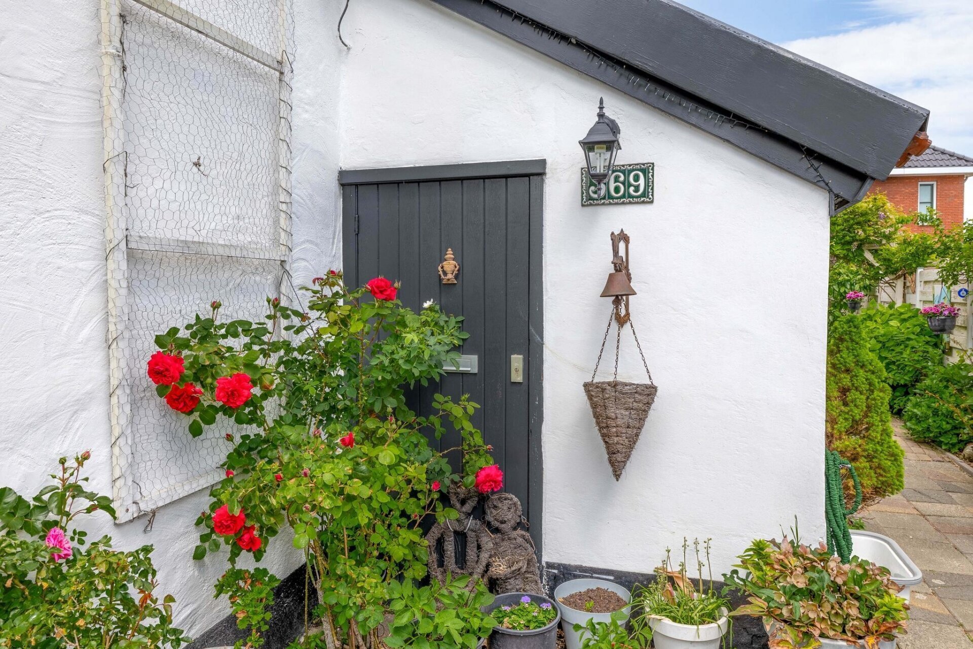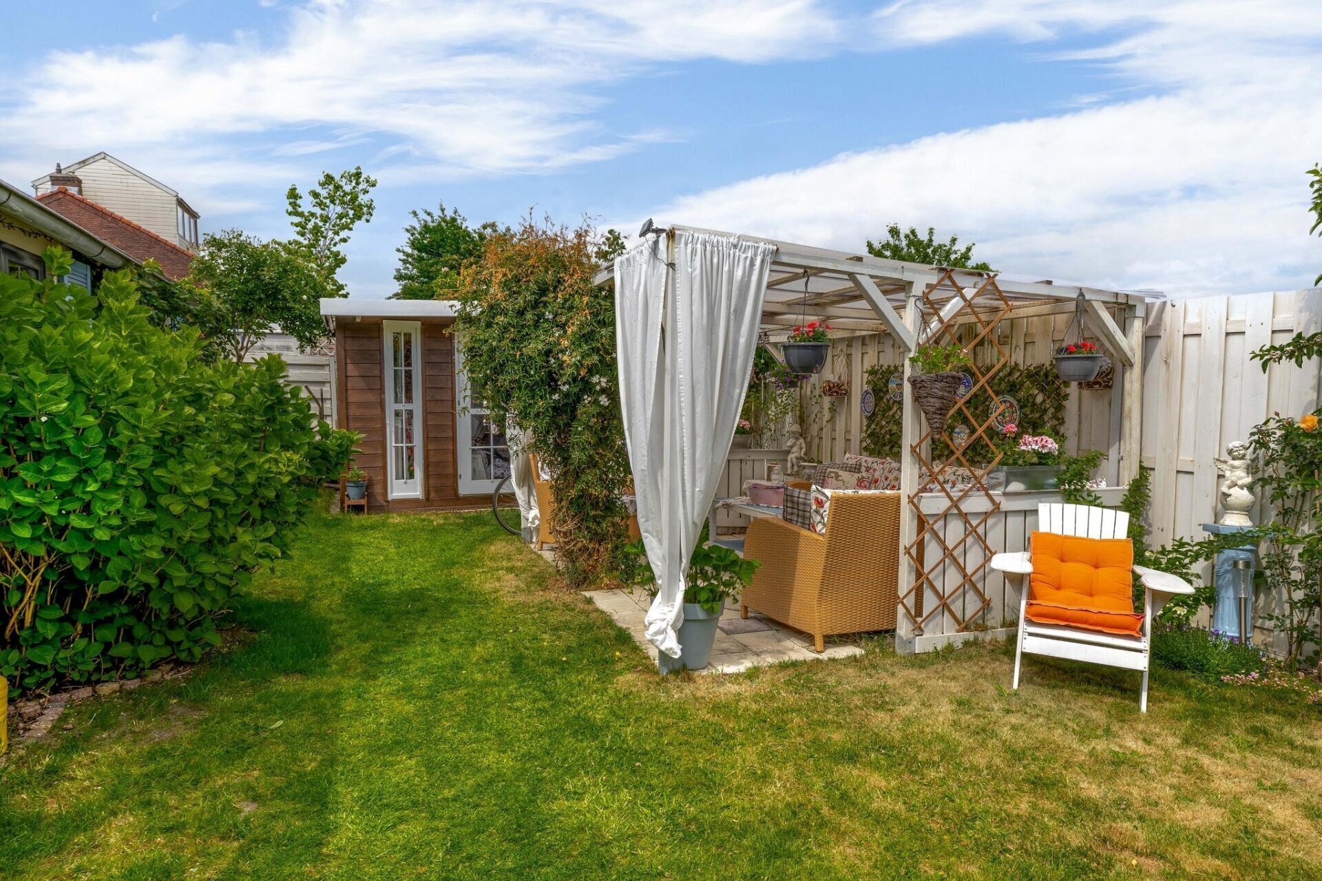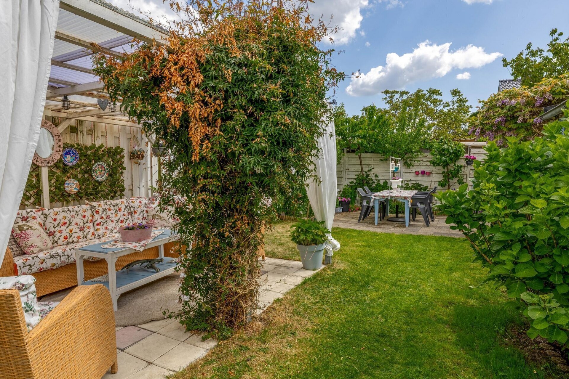 Buiten is minstens zo sfeervol als binnen. Rondom het huis ligt een verzorgde tuin met meerdere terrassen, waar je op elk moment van de dag een plekje in de zon of schaduw kunt kiezen. Dankzij de vrije ligging aan de rand van het dorp geniet je hier van rust, privacy en groen om je heen. Achterin de tuin staat een vrijstaande houten berging van ca. 10 m² – handig voor je fietsen, gereedschap of als werkruimte.