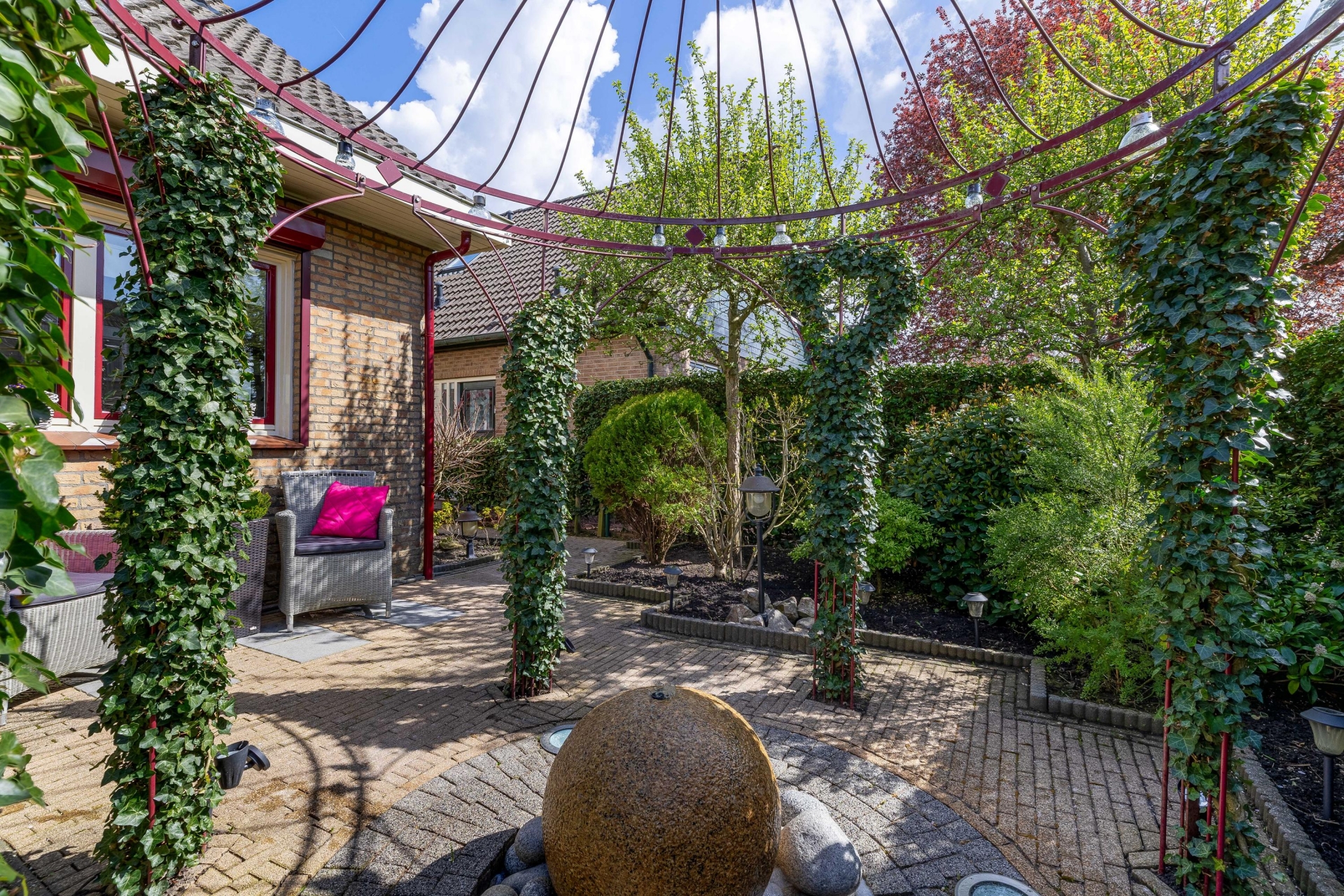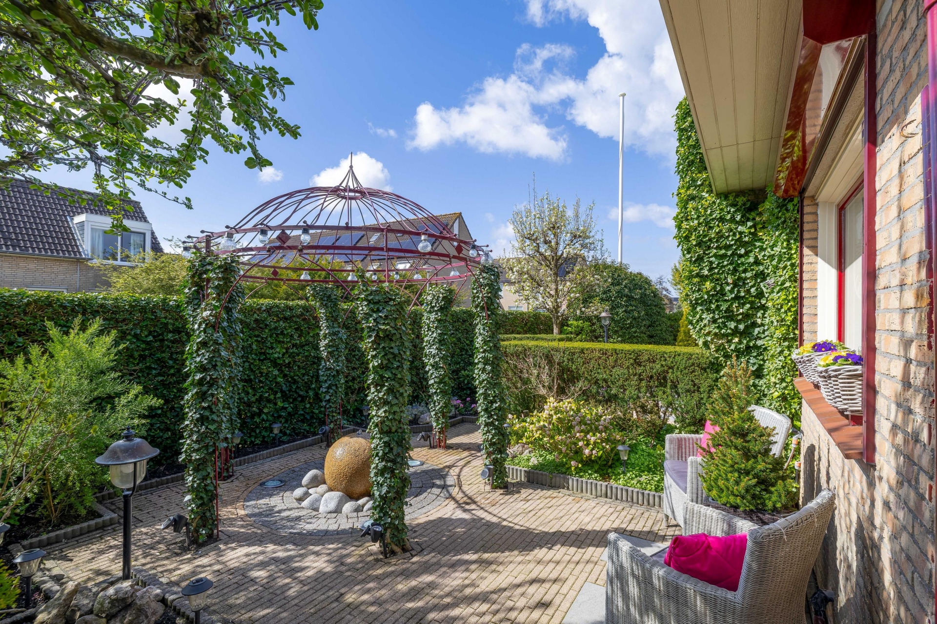 Rondom het huis ligt een fraai aangelegde tuin die met zorg is onderhouden. Er zijn meerdere plekken gecreëerd om te zitten, waardoor je op ieder moment van de dag een fijne plek hebt in de zon of schaduw.