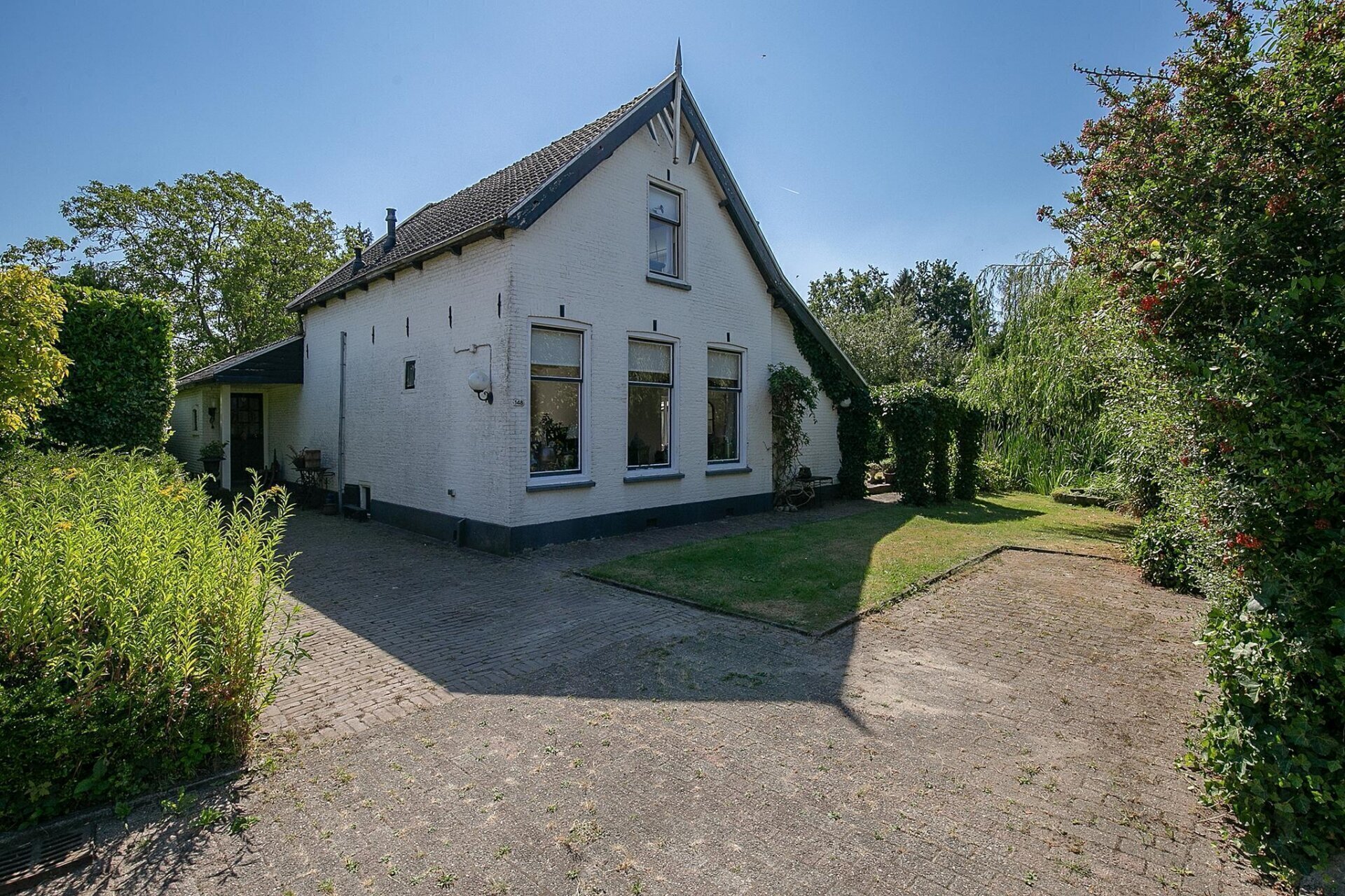 Een ruime oprit aan de voorzijde van de woning, waar u met gemak meerdere auto’s kunt parkeren.