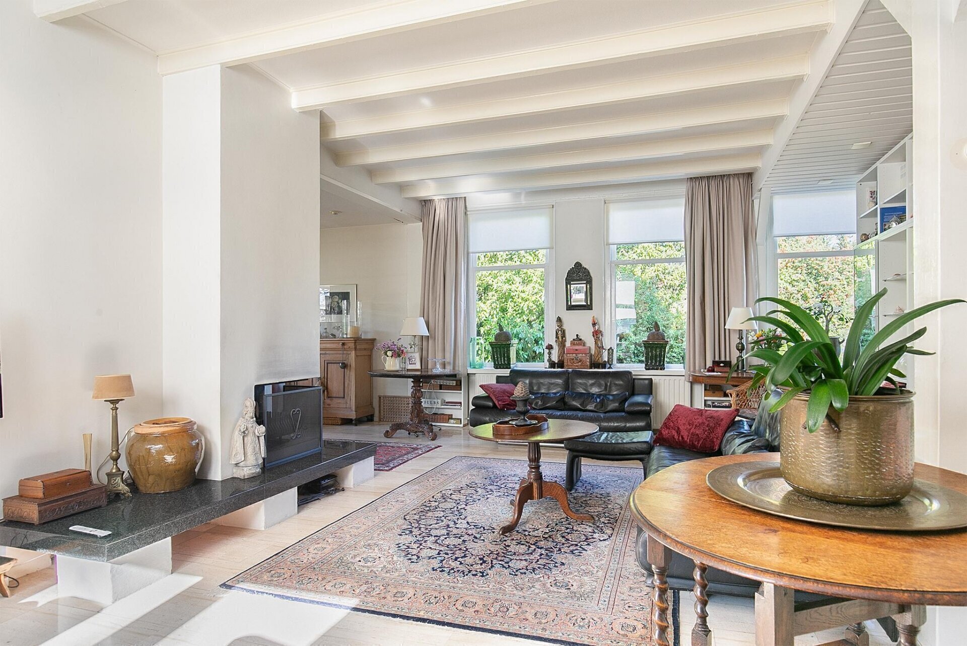 De hal geeft u toegang tot de ingang van de woonkamer, toiletruimte en een slaapkamer met badkamer op de begane grond. De gehele vloer op de begane grond is vervangen voor een betonnen vloer met vloerverwarming. De toiletruimte is volledig betegeld en voorzien van een hangcloset, fontein en radiator. De sfeervolle, royale L-vormige woonkamer heeft een mooie lichtinval en is voorzien van een marmeren vloer, openhaard, hoog balkenplafond en een halfopen keuken. Aan de tuinzijde van de woonkamer is de halfopen keuken gesitueerd, uitgevoerd in een hoekopstelling welke is afgewerkt een granieten werkblad. De keuken is voorzien een vaatwasser, keramische kookplaat, dubbele wasbak, afzuigkap, oven, inbouwkoelkast en voldoende bergruimte. Een tweetal schuifpuien geven u vanuit de keuken toegang naar de riante tuin rondom. Slaapkamer 1 op de begane grond is afgewerkt met een tegelvloer, grote raampartijen en hoog plafond. De badkamer is volledig betegeld en voorzien van een ligbad met glazen scherm, douchecabine, wastafelmeubel en spiegelkast. Aan de badkamer grenst de serre/tuinkamer, waar u kunt genieten van het uitzicht op de prachtige tuin.