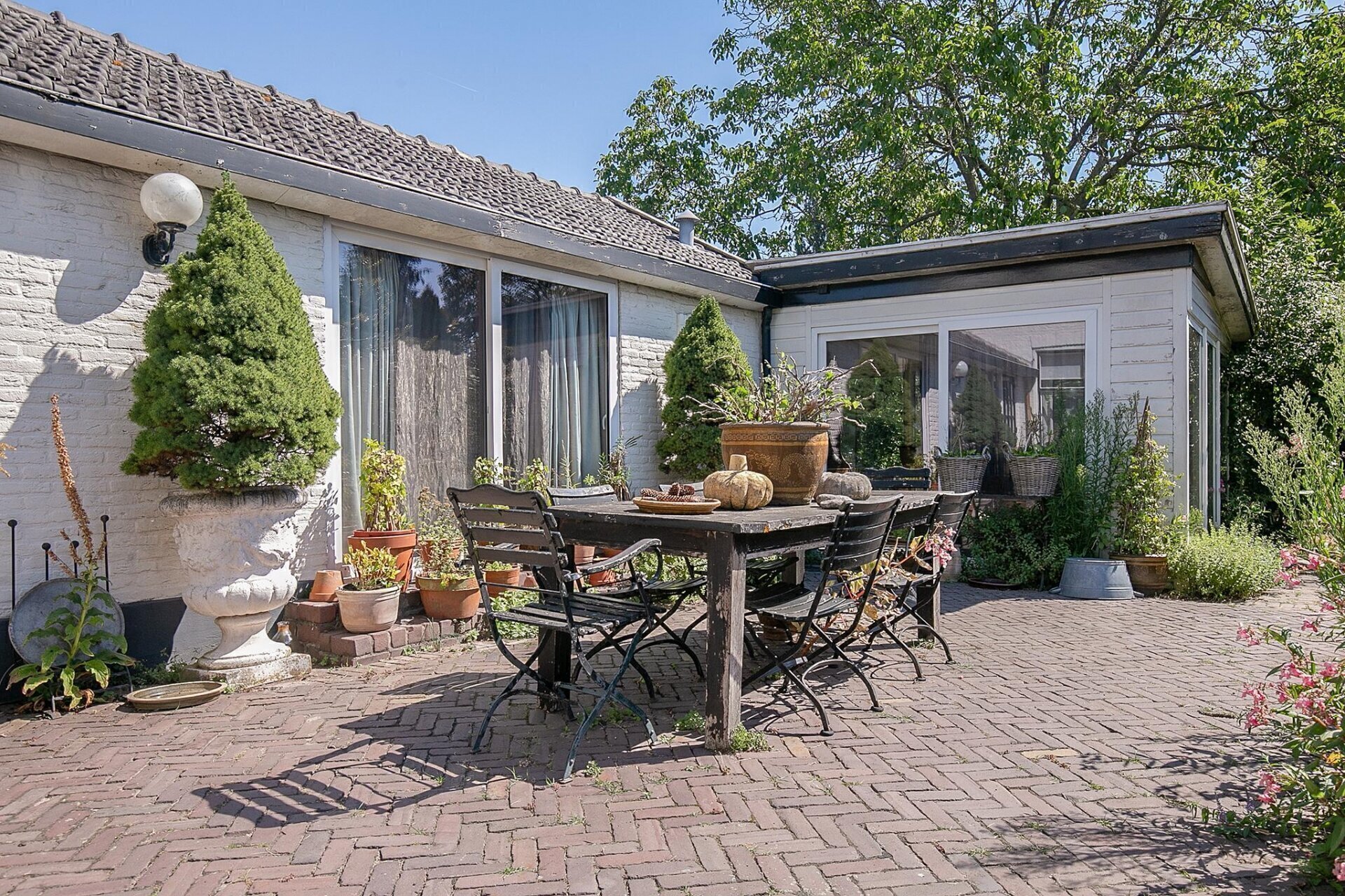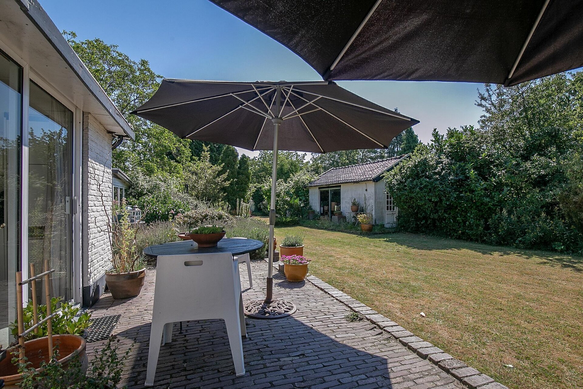 Een grote tuin zoals deze, biedt op ieder moment van de dag zon. De tuin is netjes onderhouden en er zijn diverse zitjes gecreëerd, zodat u gedurende de dag altijd een plekje in de zon of schaduw kunt opzoeken. Mocht u woon-werken willen combineren, de 2 grote schuren die gesitueerd zijn op de achterzijde van het perceel zijn zeer geschikt als werkplek. De uitrit aan de achterzijde van het perceel geeft u de mogelijkheid werk en privé toch gescheiden te houden.