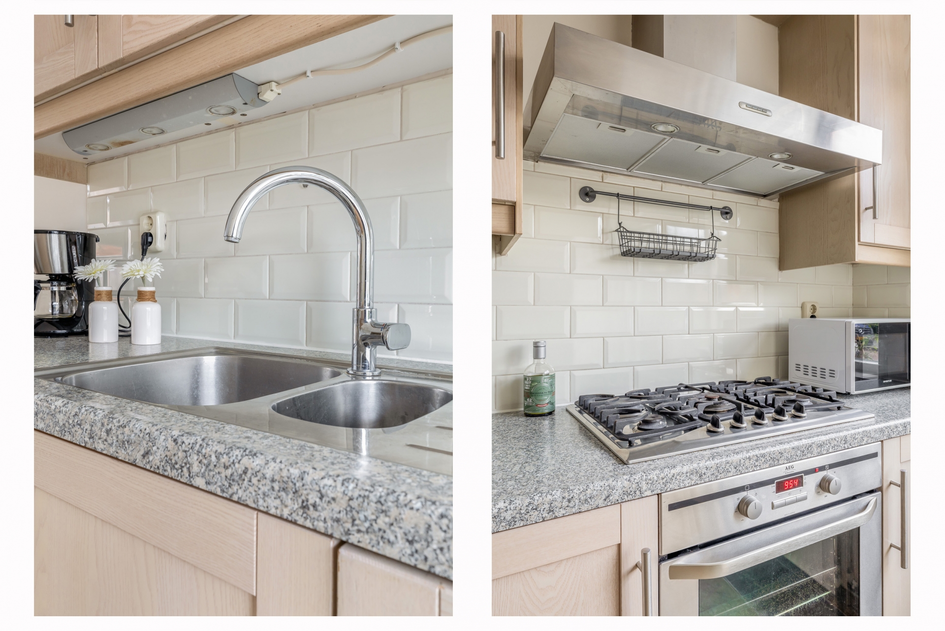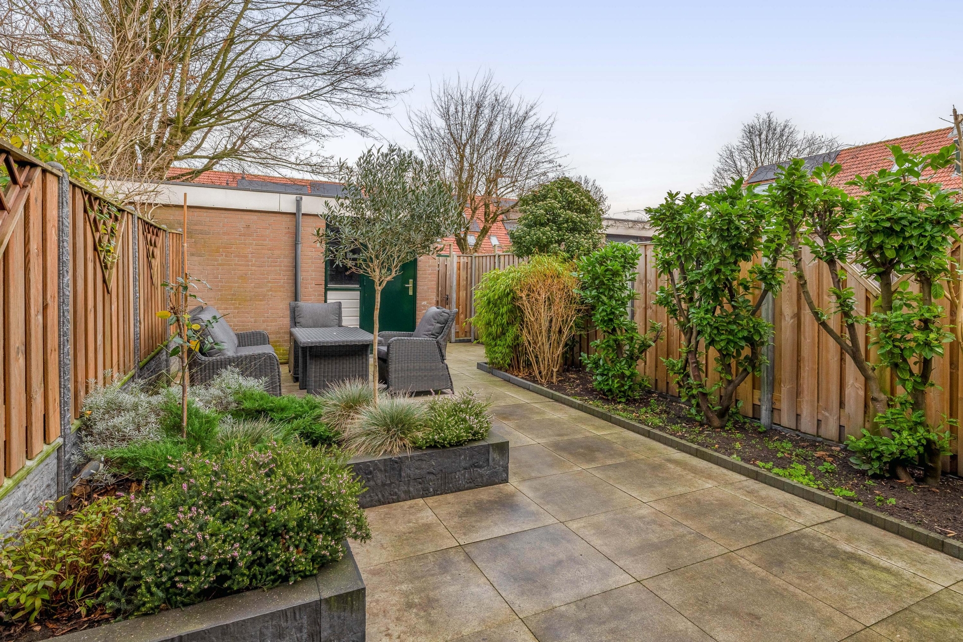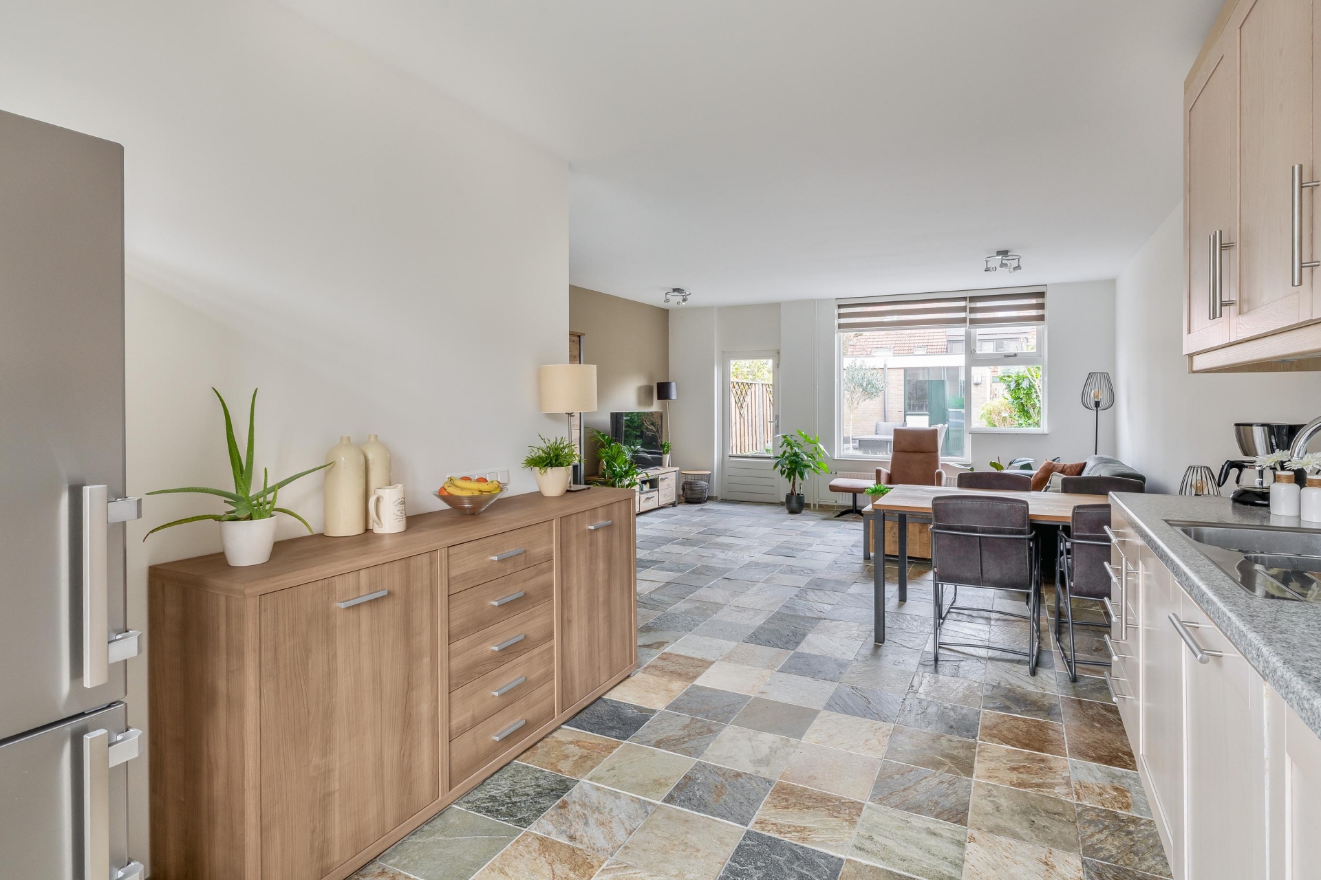 Entree woning met een lichte hal met meterkast (vernieuwd) en een licht betegeld toilet met hangend closet en fonteintje. Nette woonkamer met een trapkast, toegang tot de achtertuin en een halfopen keuken aan de voorzijde van de woning met diverse inbouwapparatuur waaronder een 5-pits gaskookplaat, afzuigkap, oven en vaatwasser. De achtertuin is uitgevoerd met een stenen berging met elektra en achterom. De gehele begane grond is voorzien van een natuurstenen vloer.