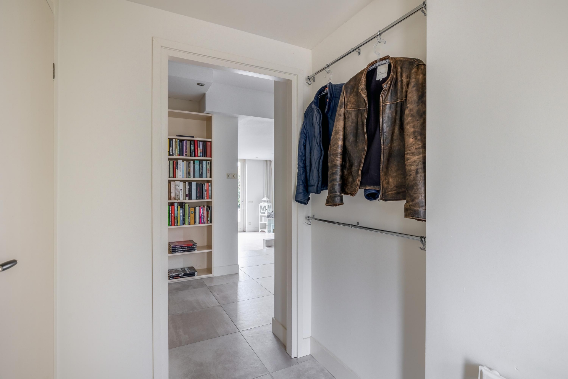 Overloop met toegang tot de ruime slaapkamer aan de voorzijde. In het midden van de woning bevindt zich de moderne badkamer, uitgerust met een inloopdouche, vrijhangend toilet en dubbel wastafelmeubel. Dankzij het raam geniet de badkamer van natuurlijke ventilatie en daglicht. Aan de achterzijde liggen nog twee slaapkamers, beide met toegang tot het zonnige balkon.