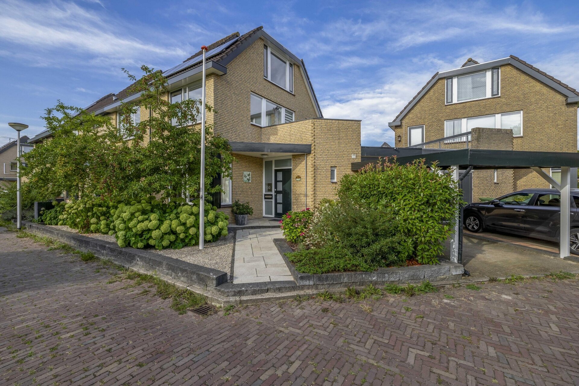 De achtertuin ligt op het zuidwesten, waardoor je hier heerlijk van de zon kunt genieten. Er is voldoende ruimte voor een grote eettafel, een loungehoek én speelruimte voor kinderen. Aan de voorzijde van het huis heb je een eigen oprit met carport én een aangebouwde garage, ideaal voor fietsen, gereedschap of gewoon extra opslag, hobby- of werkruimte.