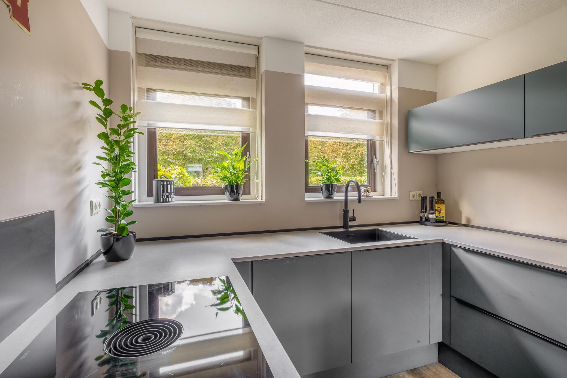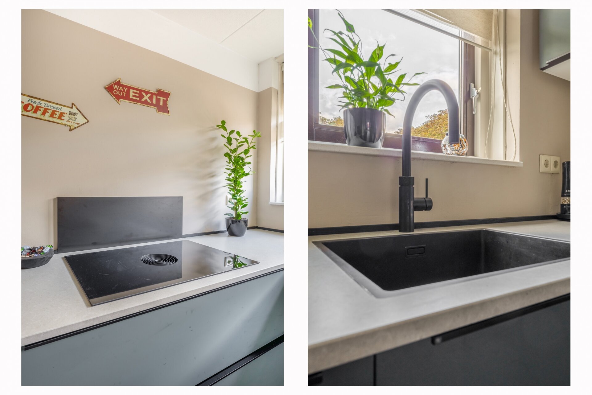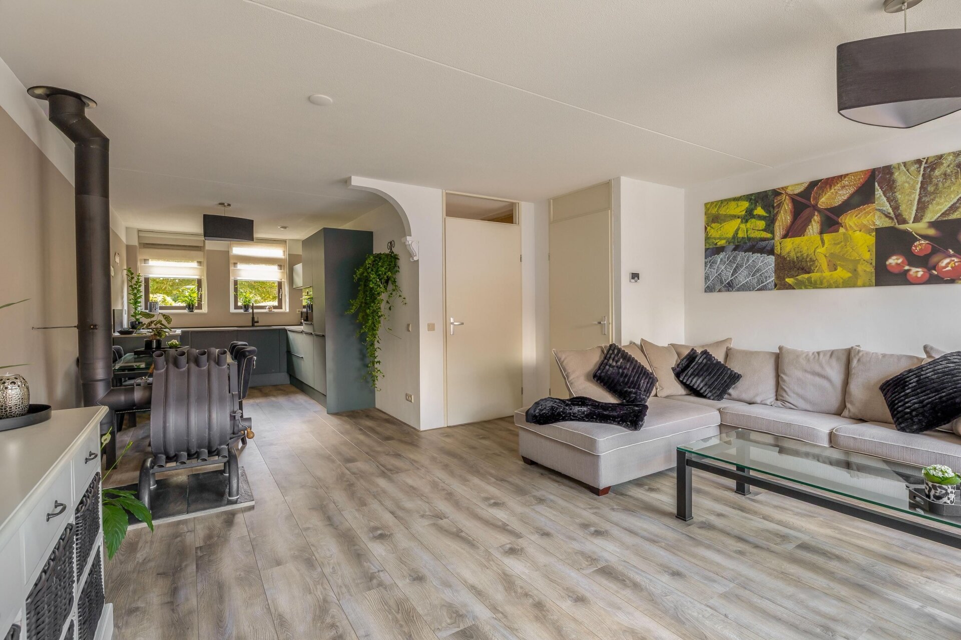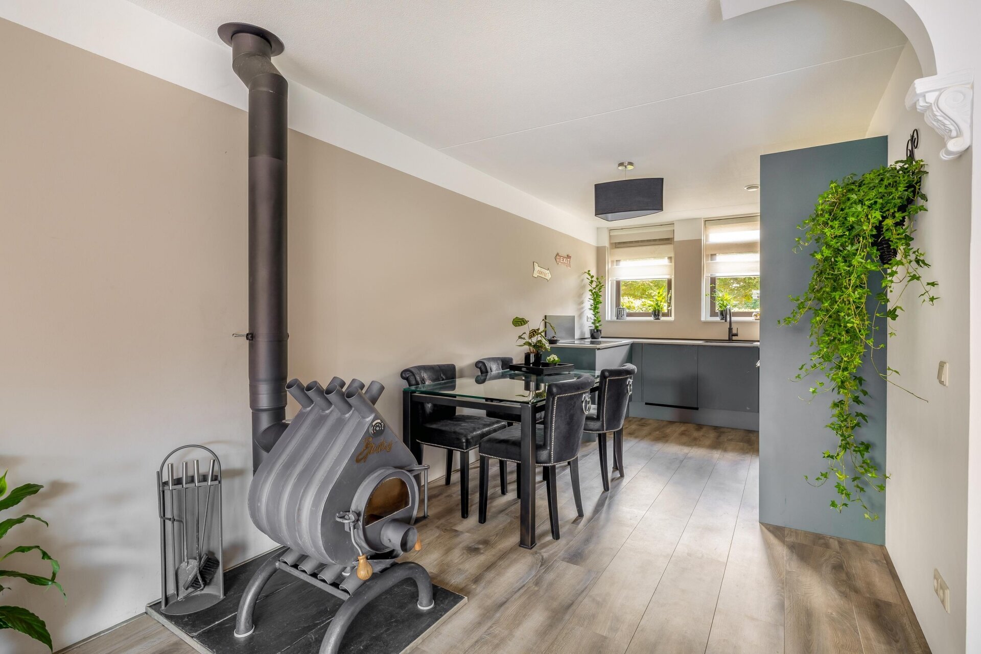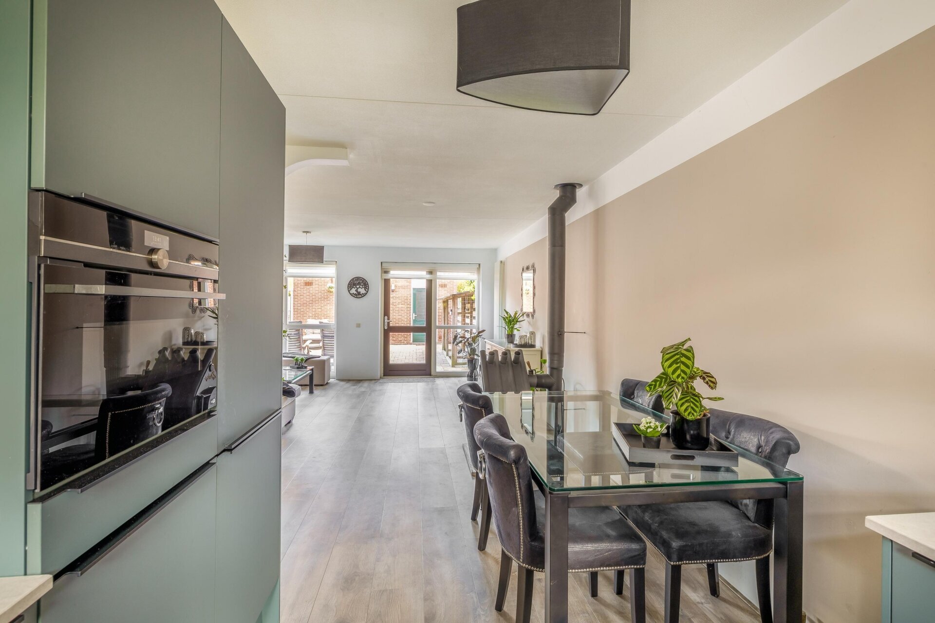 Bij binnenkomst op de begane grond valt direct de open indeling op. De moderne keuken aan de voorzijde is uitgevoerd in een stijlvolle kleurstelling en uitgerust met alle gewenste en moderne inbouwapparatuur. Denk hierbij aan een inductie kookplaat met geïntrigeerde afzuiging, combi-oven, vaatwasser, koelkast, vriezer en een Quooker. Door de ligging aan de straatzijde heb je hier prettig lichtinval, terwijl je aan de achterzijde heerlijk in alle rust kunt zitten. De woonkamer is sfeervol ingericht met onder andere een houtkachel en een fraaie laminaatvloer (2024). De grote raampartijen verbinden de leefruimte direct met de diepe achtertuin.