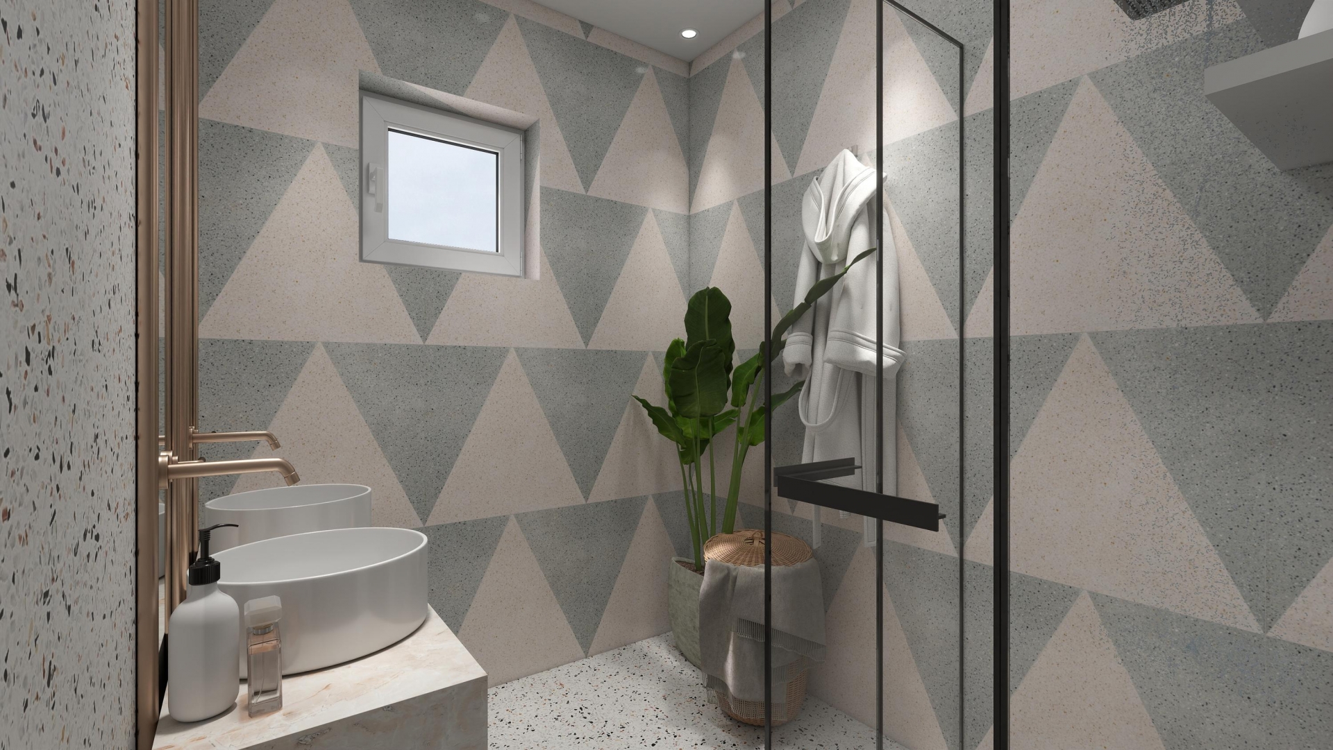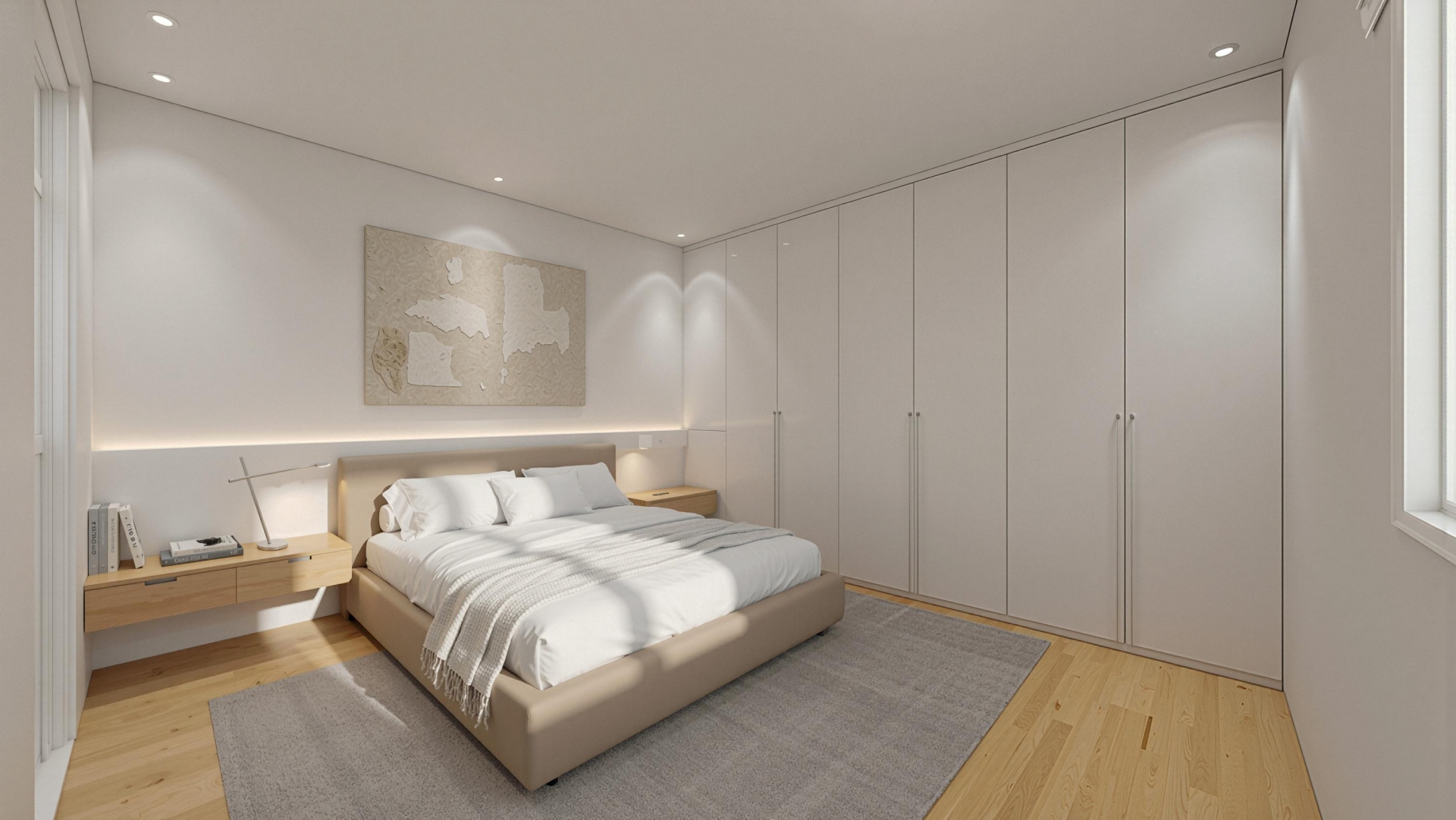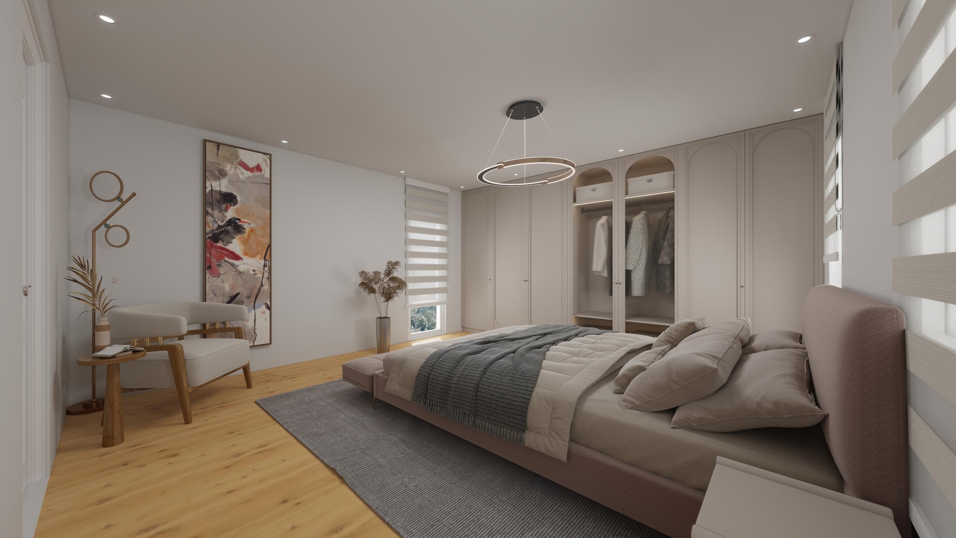 De master bedroom bevindt zich aan de voorzijde van het huis. In de artist impression is deze ruimte sfeervol ingericht met een royale garderobekast, neutrale kleuren en warme materialen — een fijne en rustige plek om je dag te beginnen of juist af te sluiten. De badkamer is eveneens in beeld gebracht via een artist impression en laat een moderne afwerking zien met inloopdouche, dubbele waskommen en terrazzo accenten.