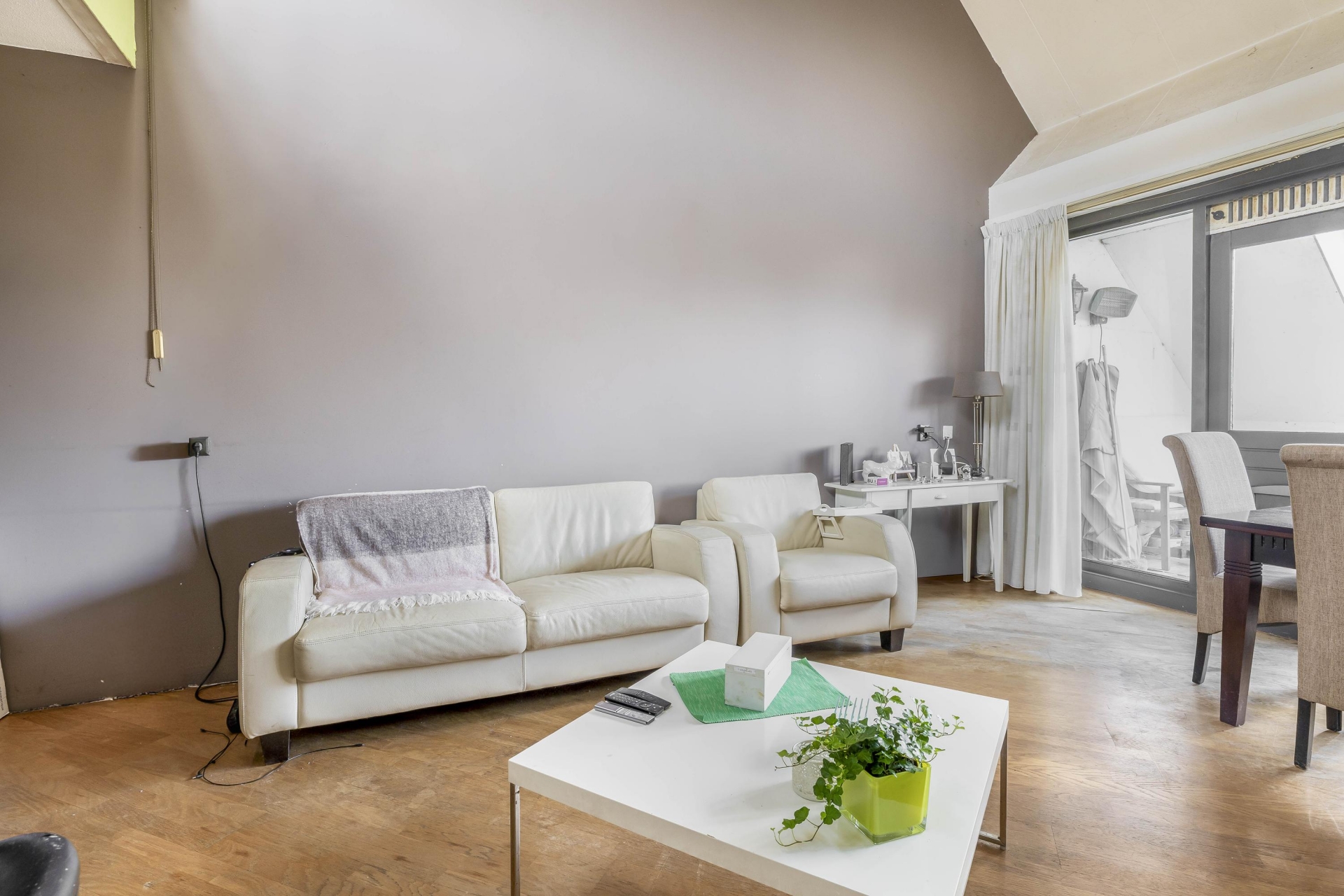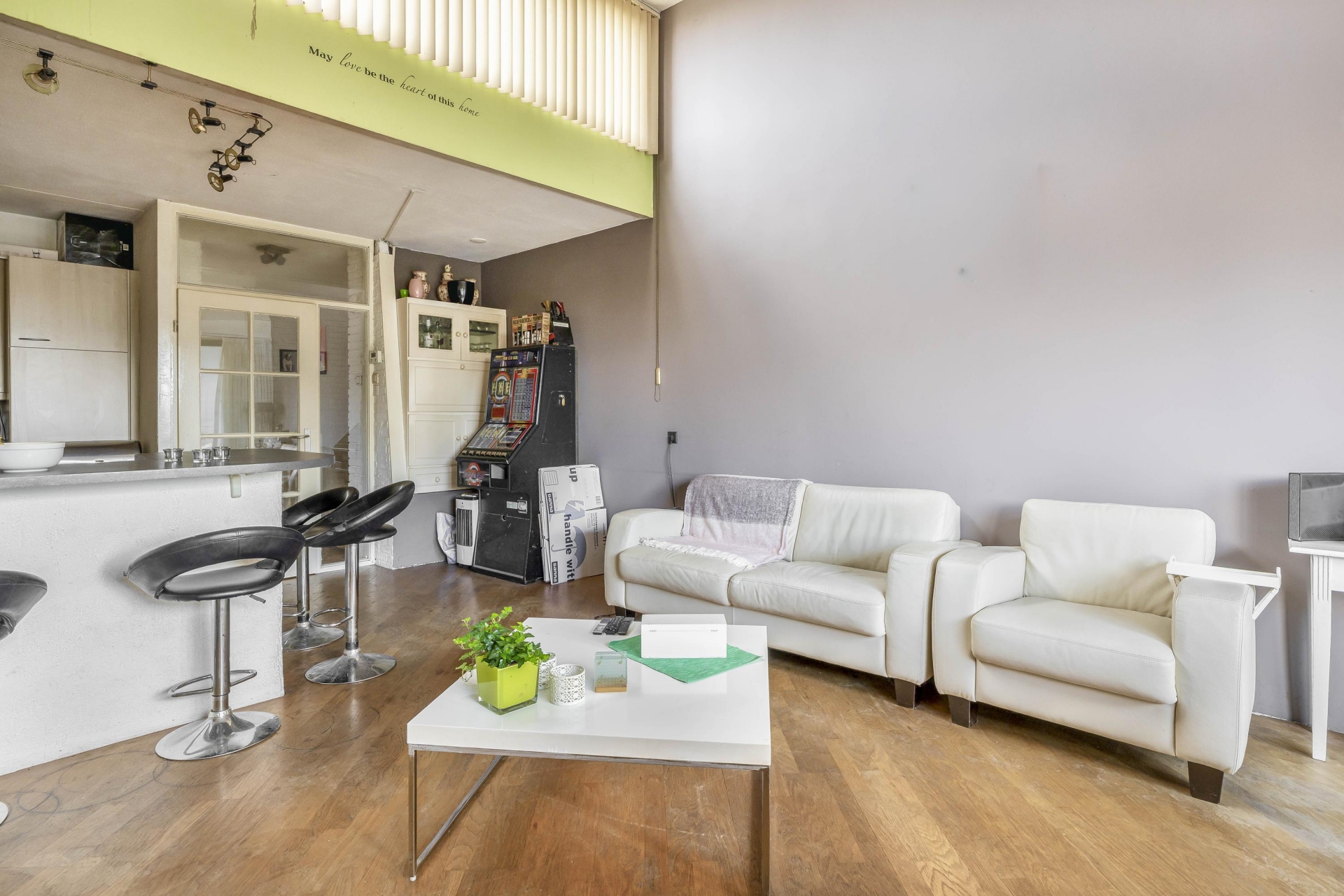 Een verdieping hoger is de woonkamer met hoog plafond en grote raampartijen te vinden. De keuken is functioneel opgezet in een hoekopstelling met veel kastruimte en inbouwapparatuur. De bar tussen keuken en woonkamer maakt het extra gezellig: ideaal voor een snel ontbijt of een drankje met vrienden. De ruimte is voorzien van een houten vloer en een neutrale afwerking die je eenvoudig naar je eigen smaak kunt stylen. Ook een openhaard ontbreekt niet: een sfeervolle toevoeging die voor extra warmte zorgt in de wintermaanden.