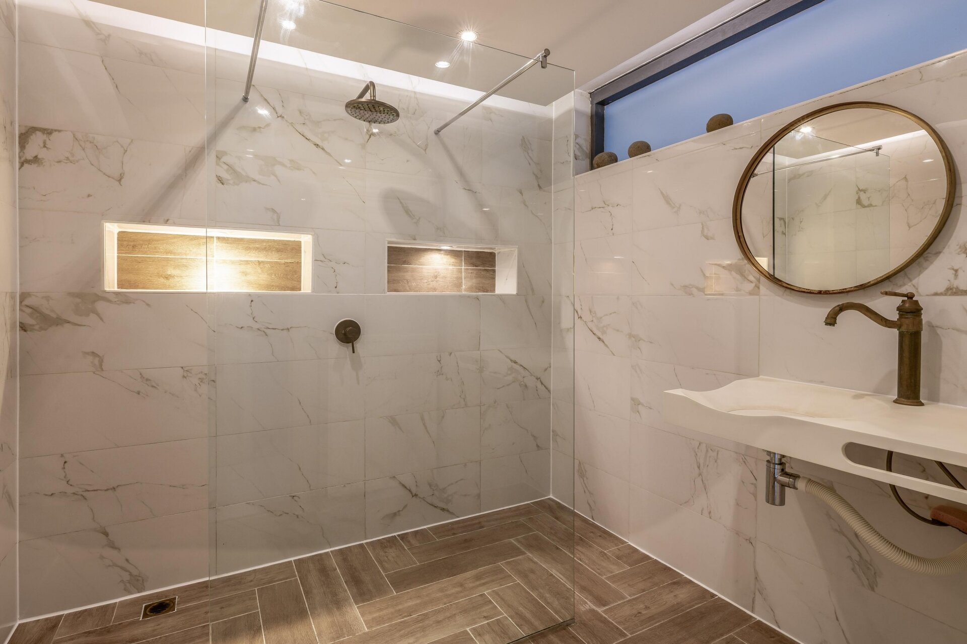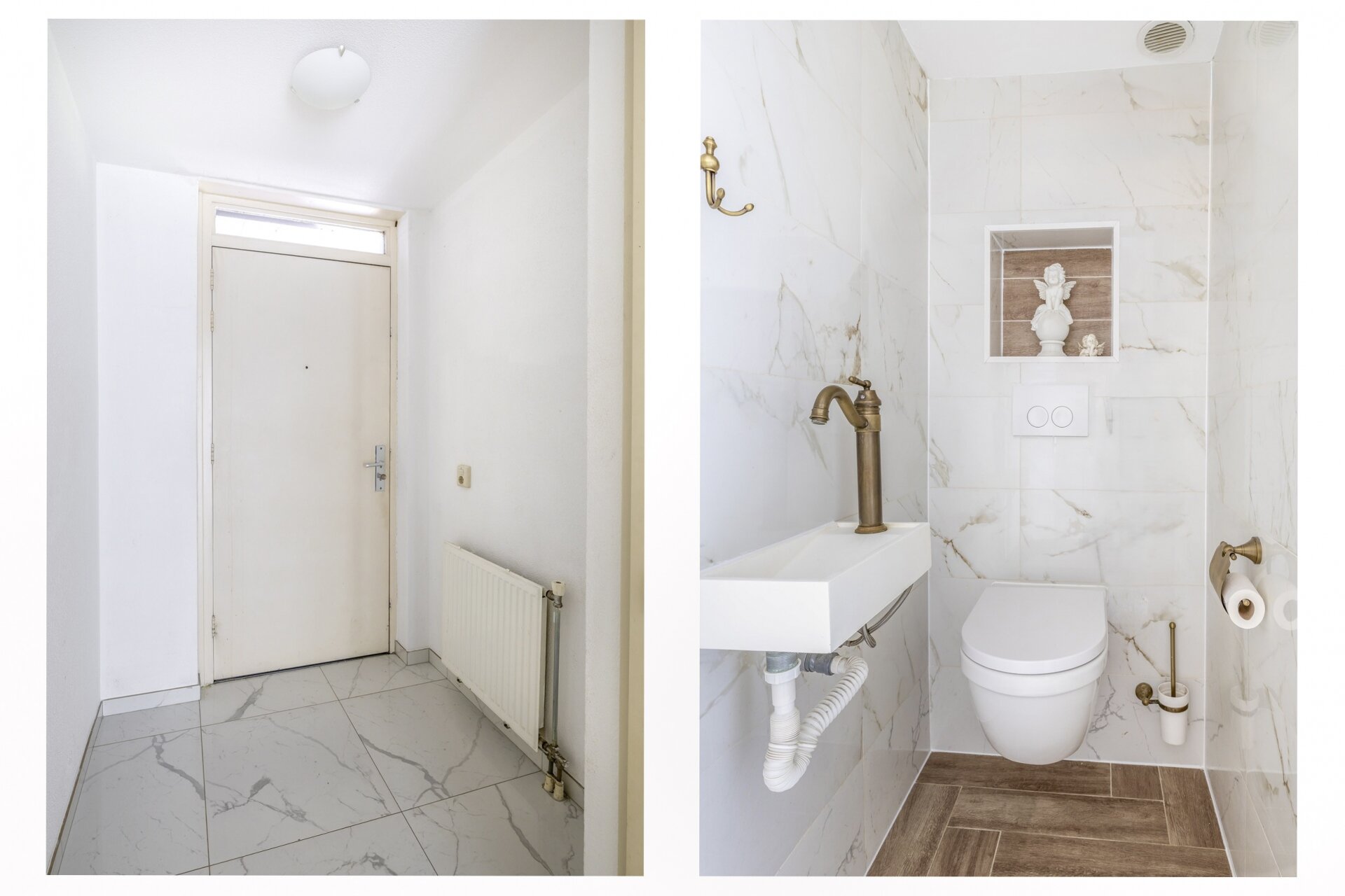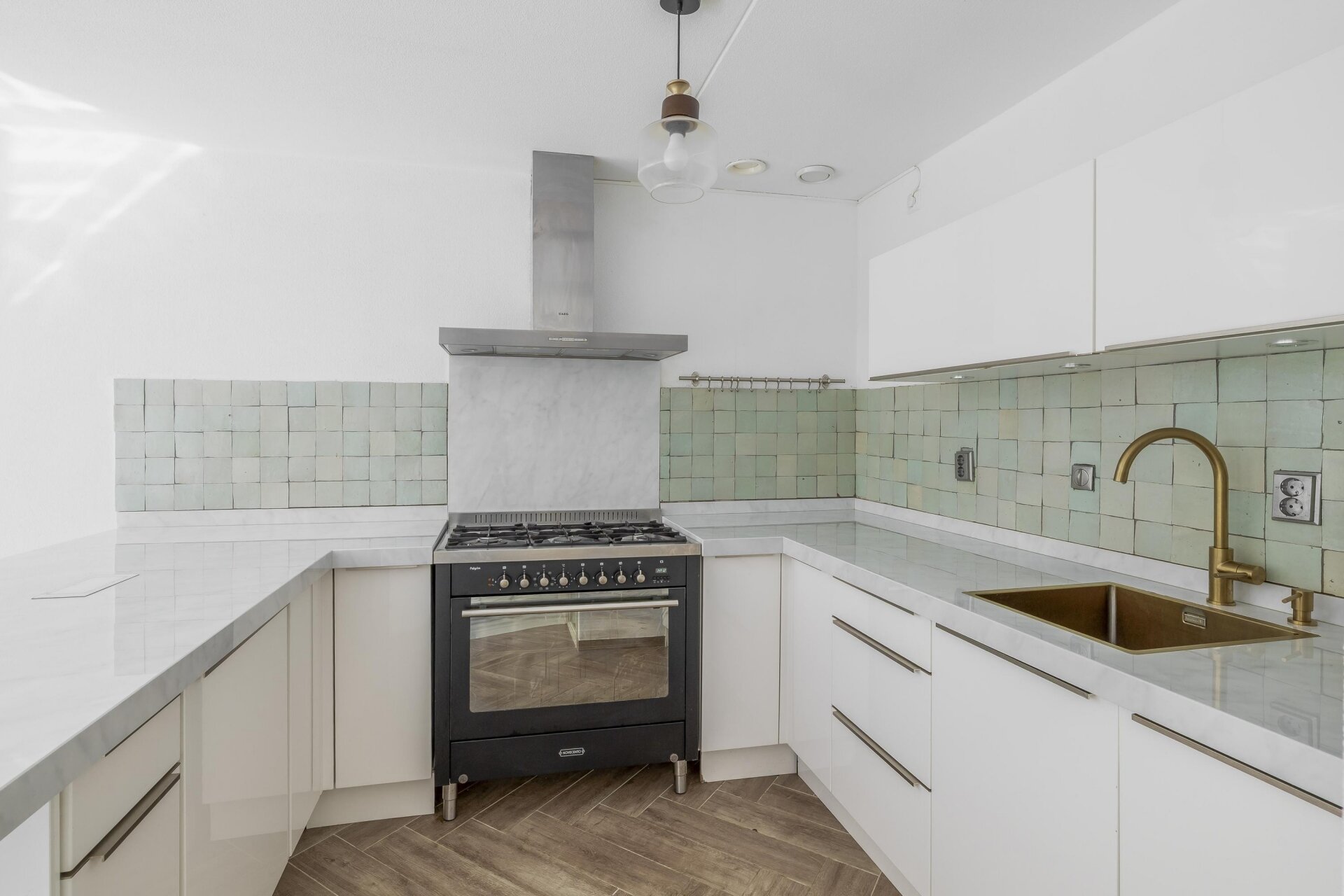De open keuken is een blikvanger in deze woning. Gemaakt op maat en voorzien van een marmer werkblad, 6-pits fornuis, RVS recirculatiekap, vaatwasser en koelkast: een keuken waar koken echt een feestje wordt. Of je nu alleen woont of graag gasten over de vloer hebt, deze keuken sluit naadloos aan op je wensen. De praktische indeling en afwerking in wit maken het geheel tijdloos en strak.
