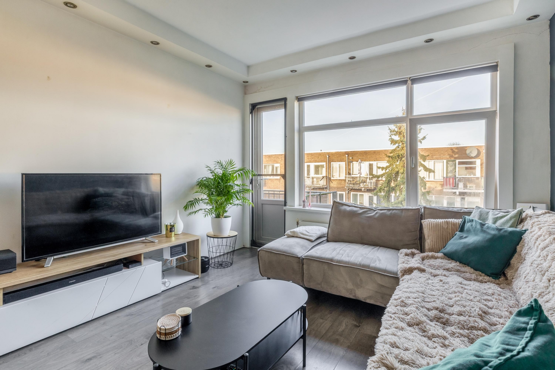 De woonkamer is een gezellige leefruimte met genoeg plek voor een comfortabele zithoek en eettafel. Dankzij het vrije zicht aan de voorzijde en de grote raampartijen voelt de ruimte open en licht aan. Via de woonkamer stap je het balkon op, dat op het westen ligt: perfect voor een borrel in de avondzon.