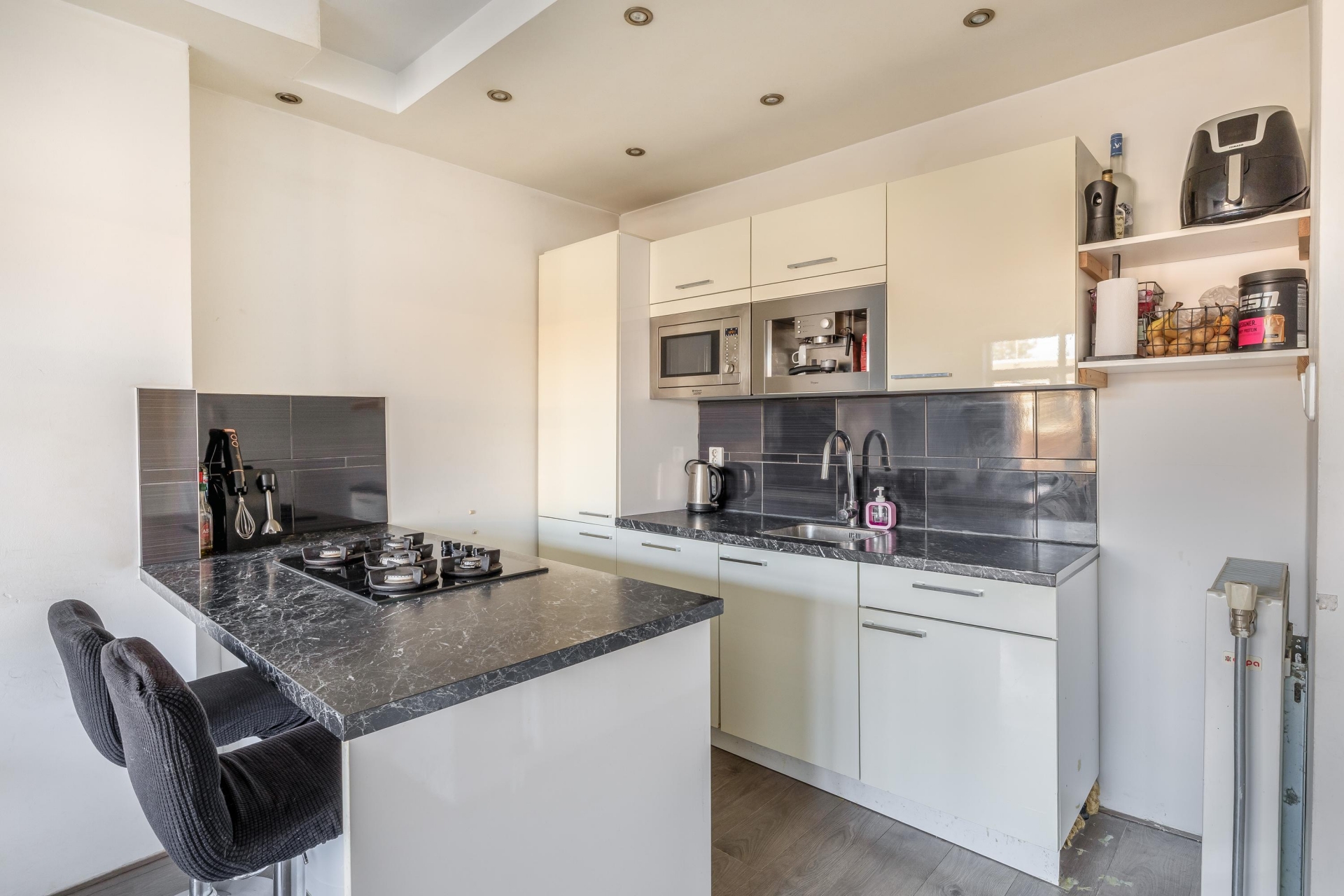 De open keuken sluit naadloos aan op het woongedeelte en is uitgevoerd in een neutrale kleurstelling met een zwart werkblad. Er is gekozen voor een praktische indeling met voldoende werkruimte en kastruimte. Verder beschik je over een 5-pits gaskookplaat, ingebouwde magnetron én oven, koel-vriescombinatie (2024) en vaatwasser. De bar met zitgedeelte maakt het af: ideaal voor een kop koffie in de ochtend of een drankje met bezoek.