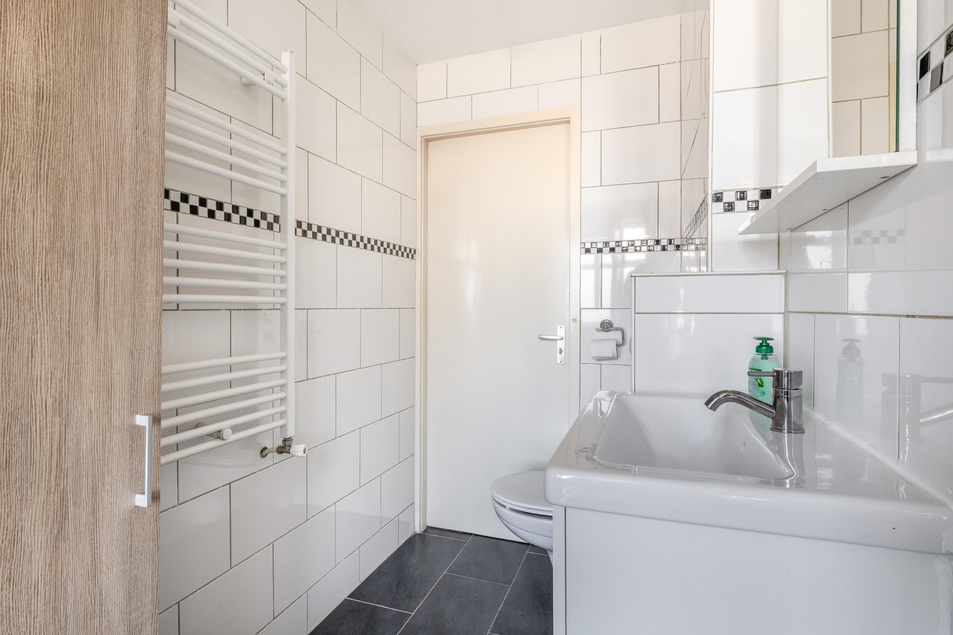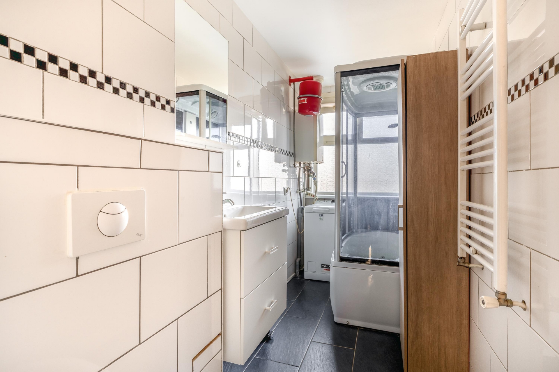 De badkamer is verrassend ruim en netjes uitgevoerd. Er is gekozen voor een moderne afwerking met lichte betegeling, een douchecel, wastafelmeubel, toilet en aansluitingen voor wasmachine en opstelplaats voor de CV-ketel.