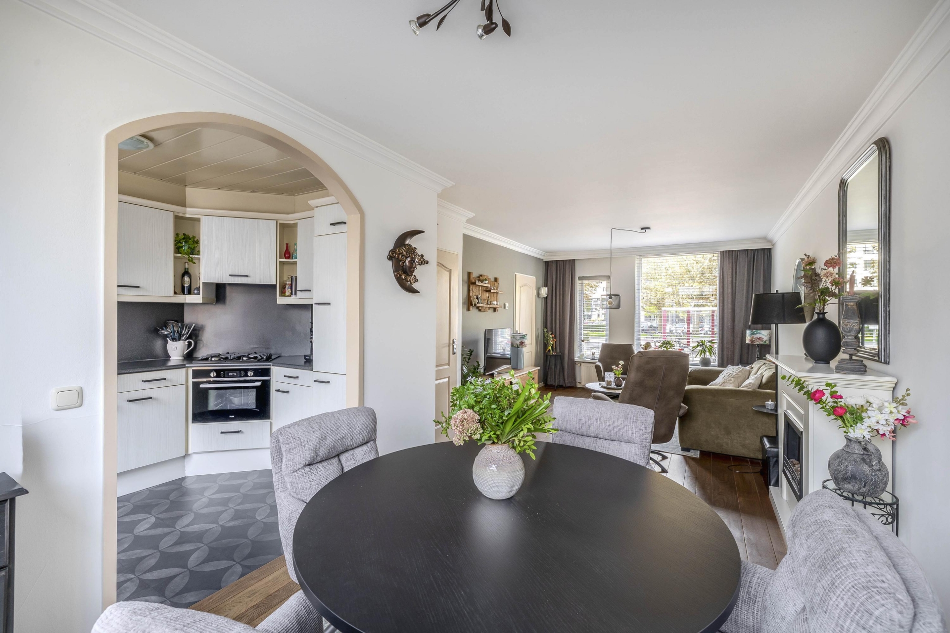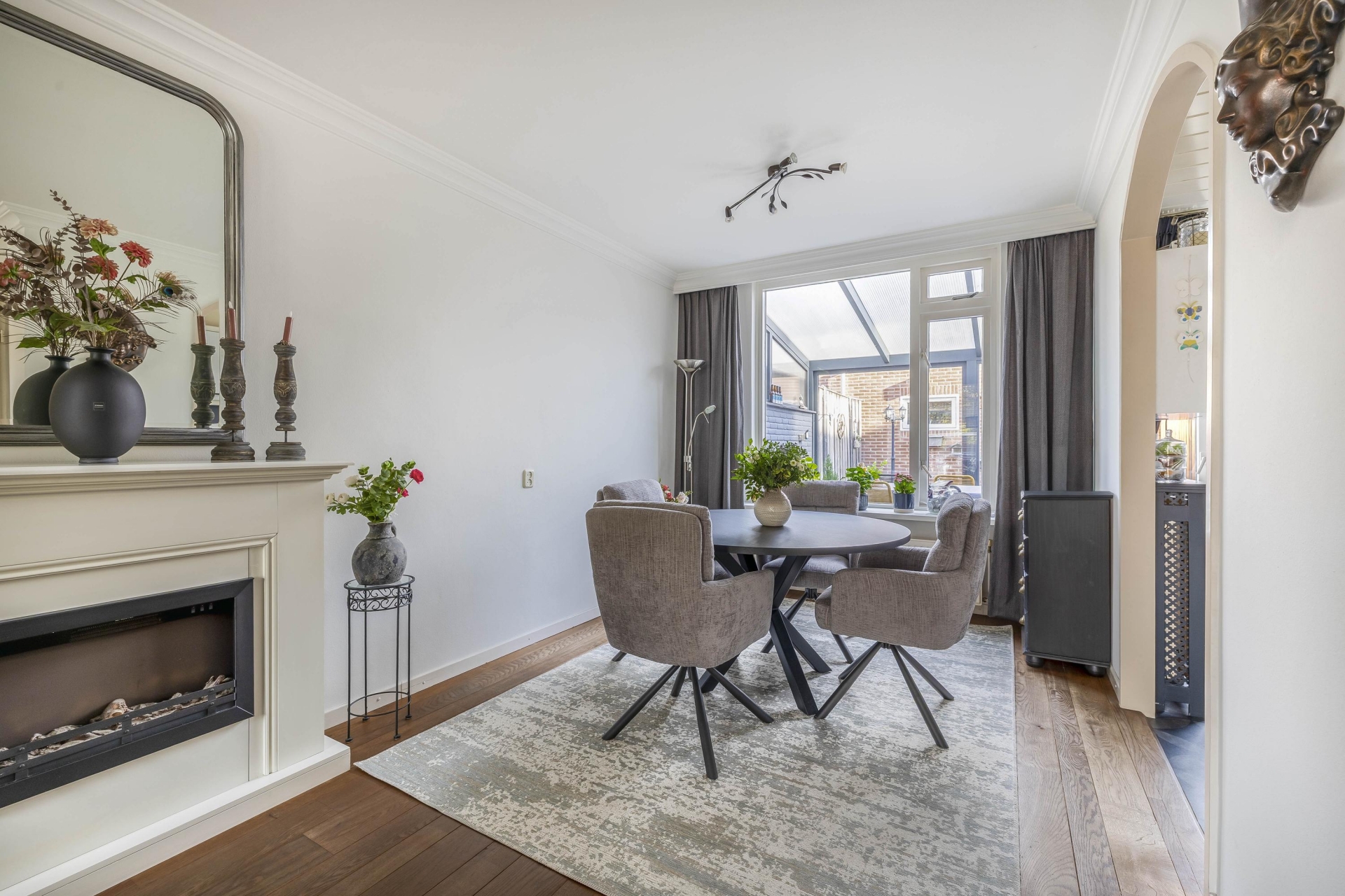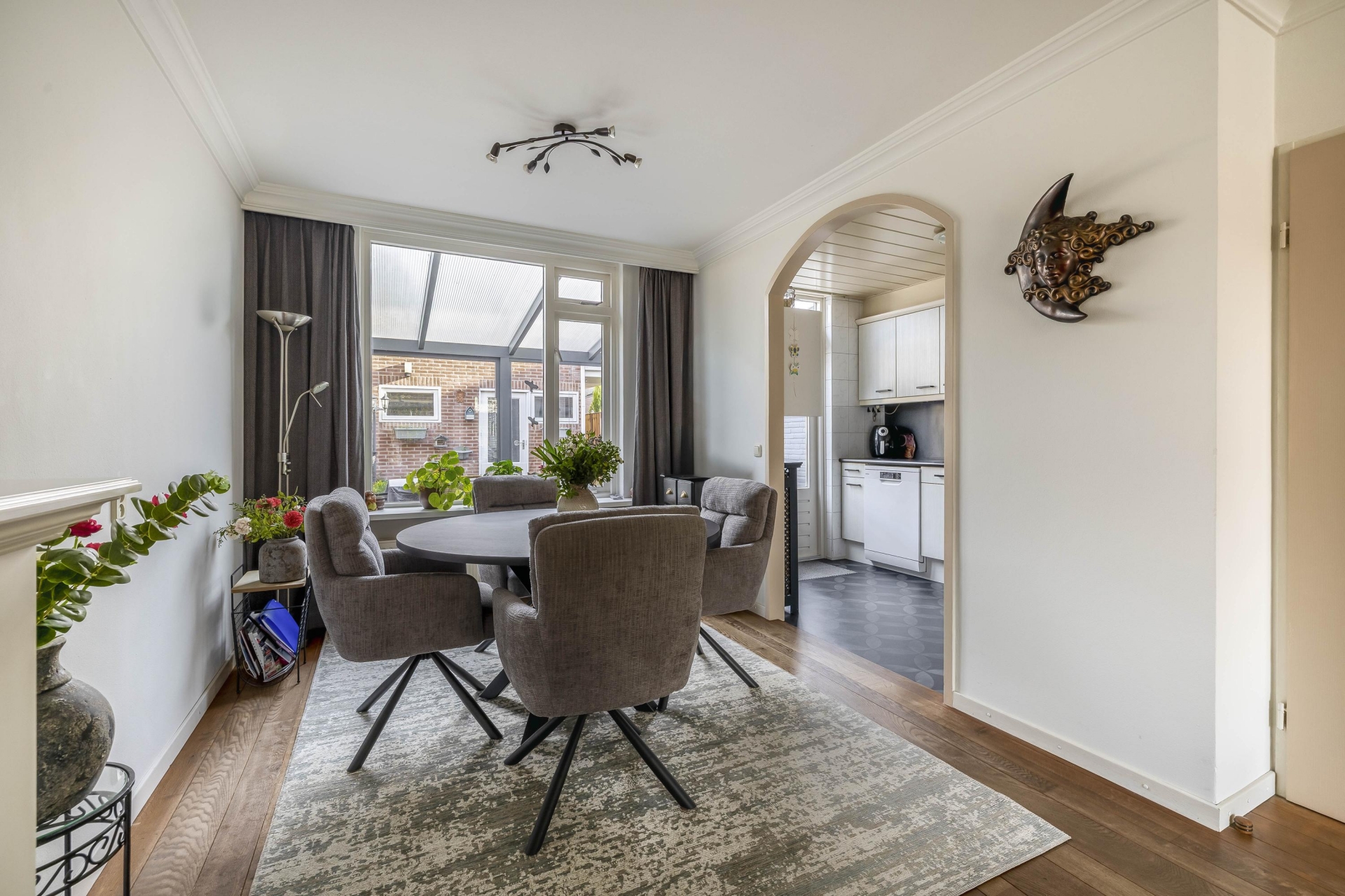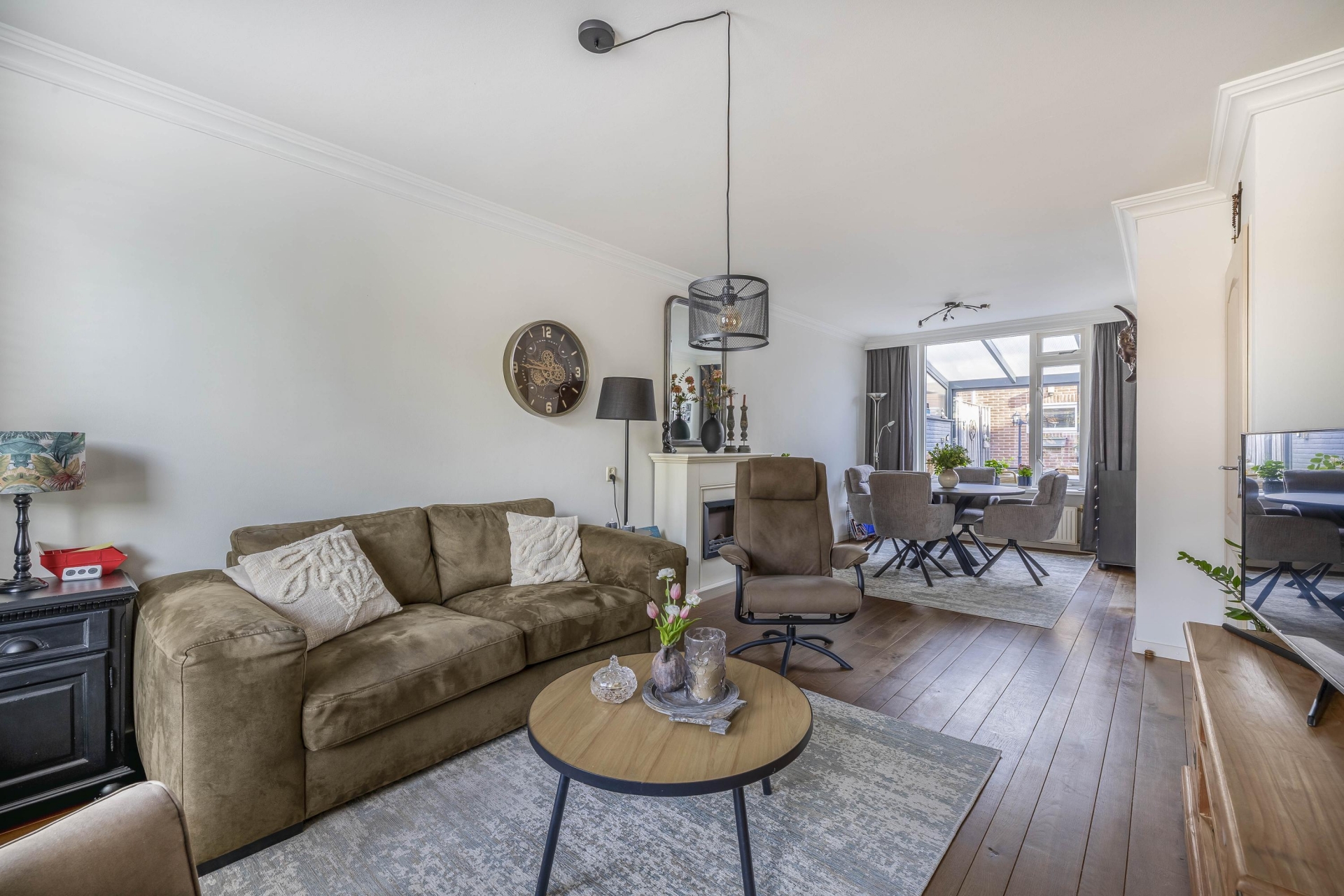 Aan de achterzijde is plek voor een royale eethoek, met direct zicht op de serre en de tuin. De verbinding tussen binnen en buiten is hier echt goed gevonden. De afwerking is netjes en neutraal, waardoor je hier eenvoudig je eigen stijl aan kunt geven. De woonkamer biedt genoeg ruimte voor een comfortabele zithoek én een grote eettafel, ideaal voor etentjes of gewoon een ontspannen avond thuis.