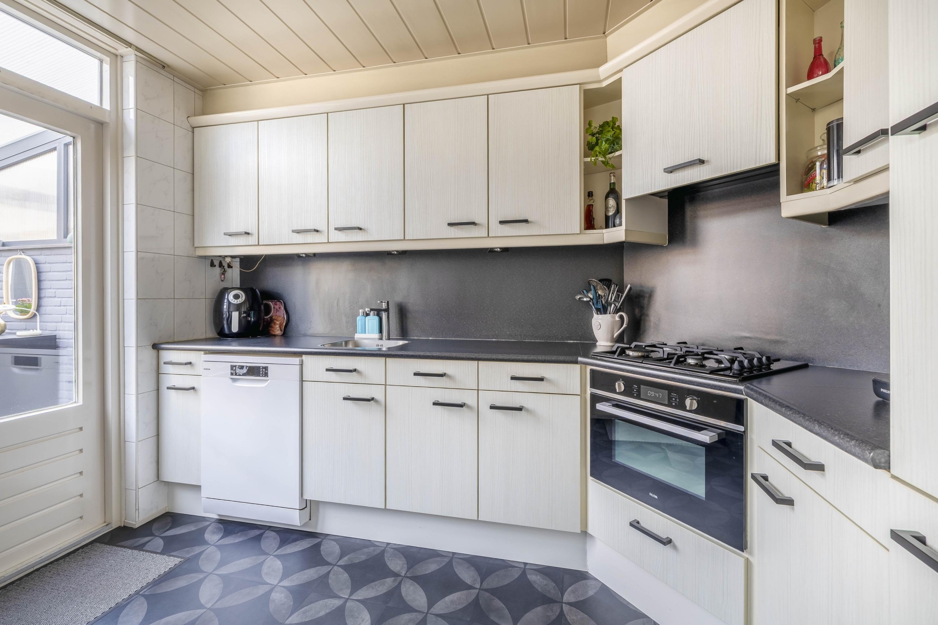 De keuken ligt aan de achterzijde van het huis en is praktisch ingericht met voldoende werk- en opbergruimte. Alles wat je nodig hebt is aanwezig en functioneel opgesteld, waardoor je hier prettig kunt koken.