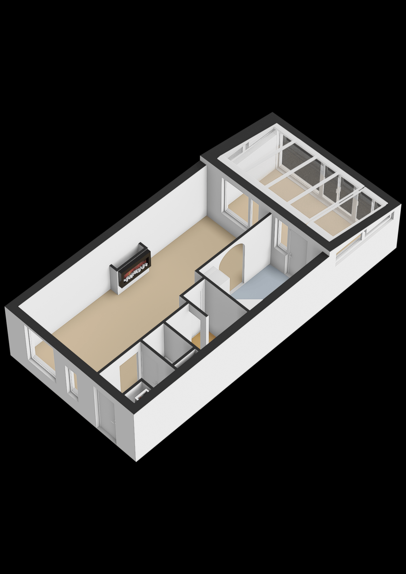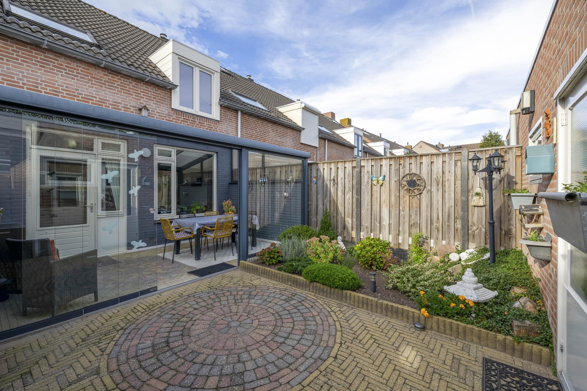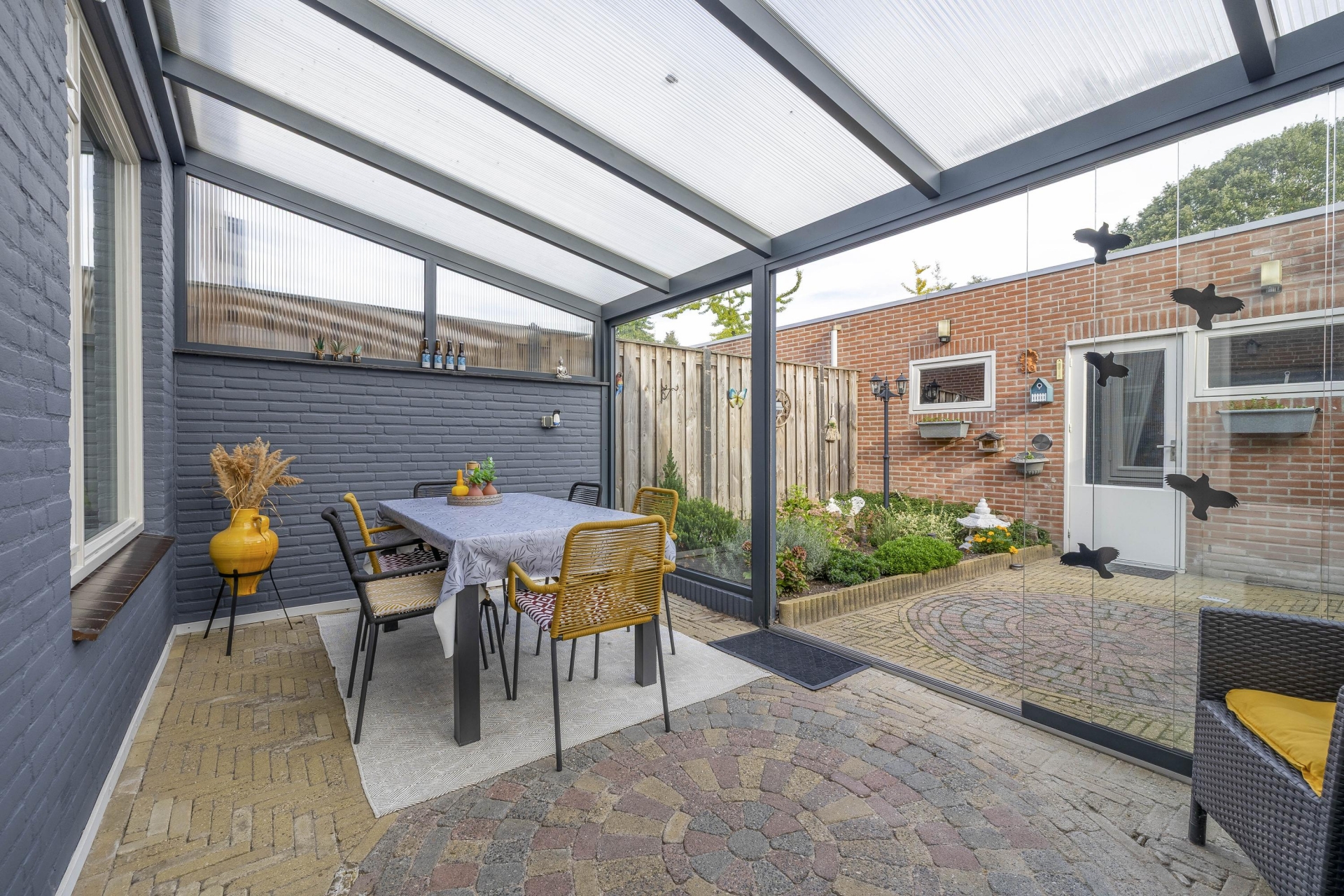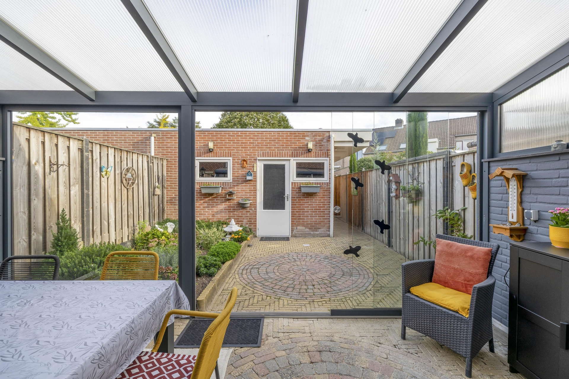Aansluitend vind je de glazen serre, een van de sterke punten van dit huis. Dit is echt een verlengstuk van je leefruimte. Of je hier nu een extra zitplek maakt, een speelruimte voor de kinderen of een plek om te borrelen met vrienden, het kan allemaal. Dankzij de glazen wanden en het dak geniet je hier al vroeg in het jaar van het buitengevoel, terwijl je beschut zit.