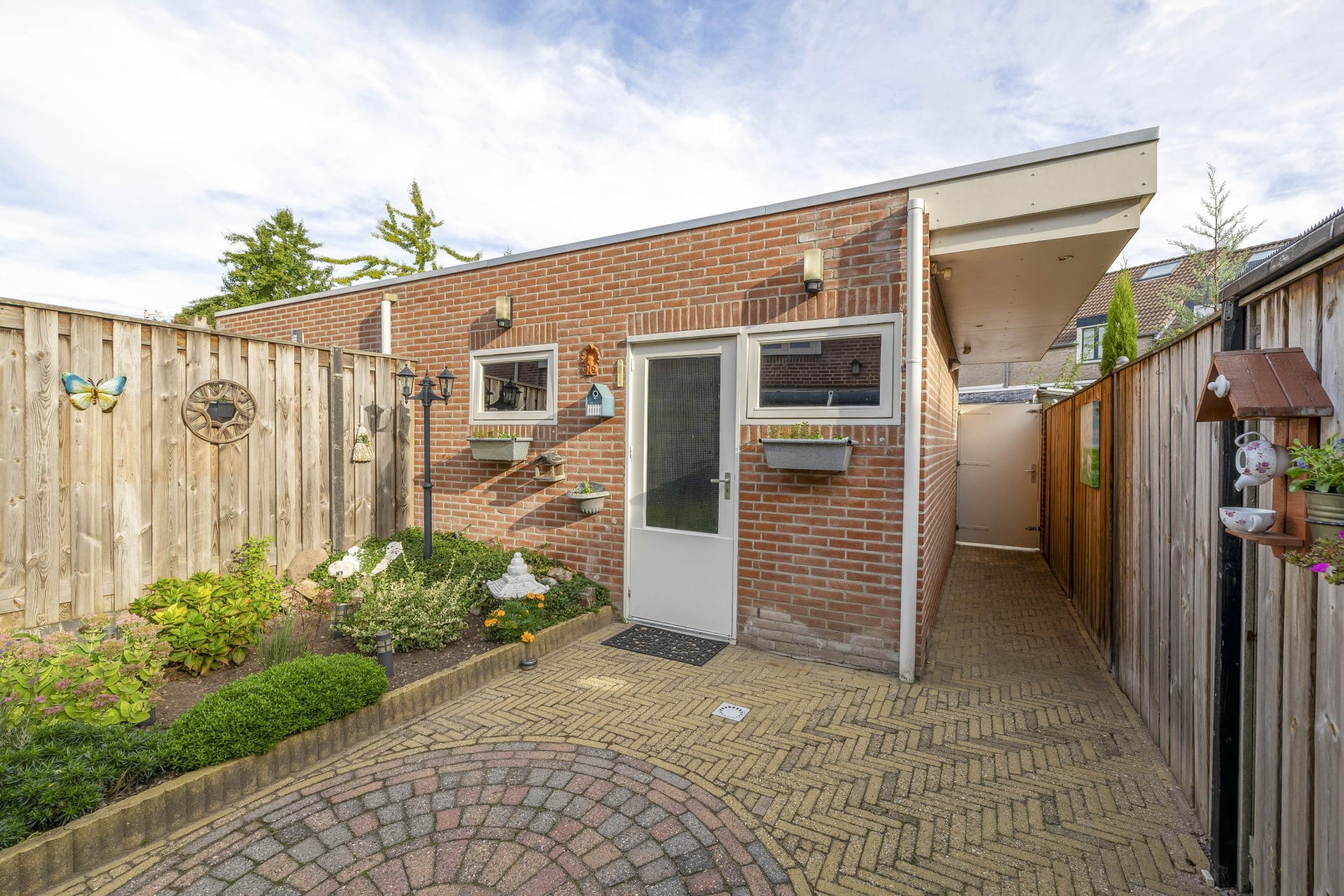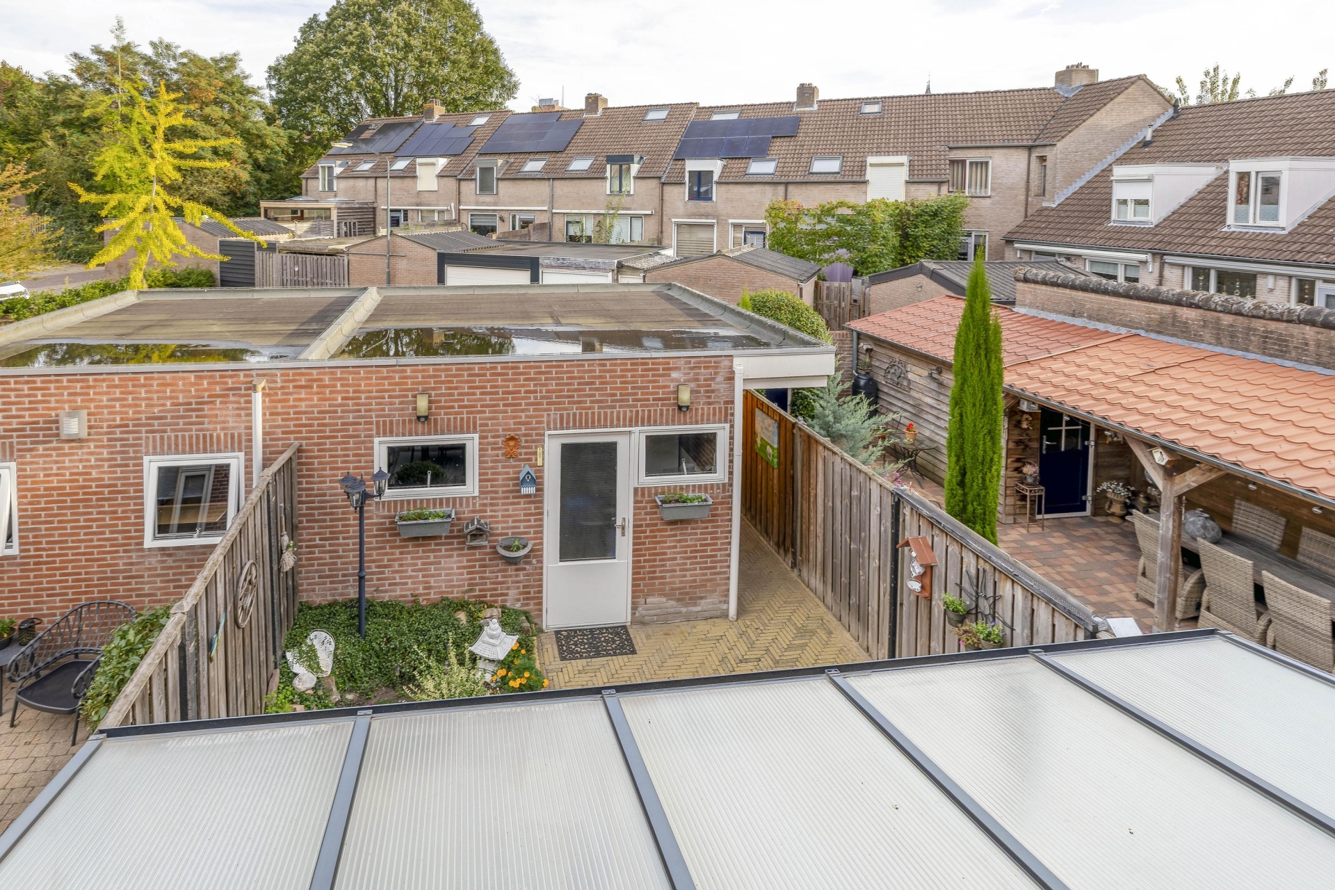 Vanuit de serre loop je zo de achtertuin in. De tuin is verzorgd aangelegd en biedt voldoende ruimte om buiten te zitten. Achterin vind je de vrijstaande garage, voorzien van een elektrische deur. Ideaal voor het stallen van een auto, fietsen of als extra bergruimte.
