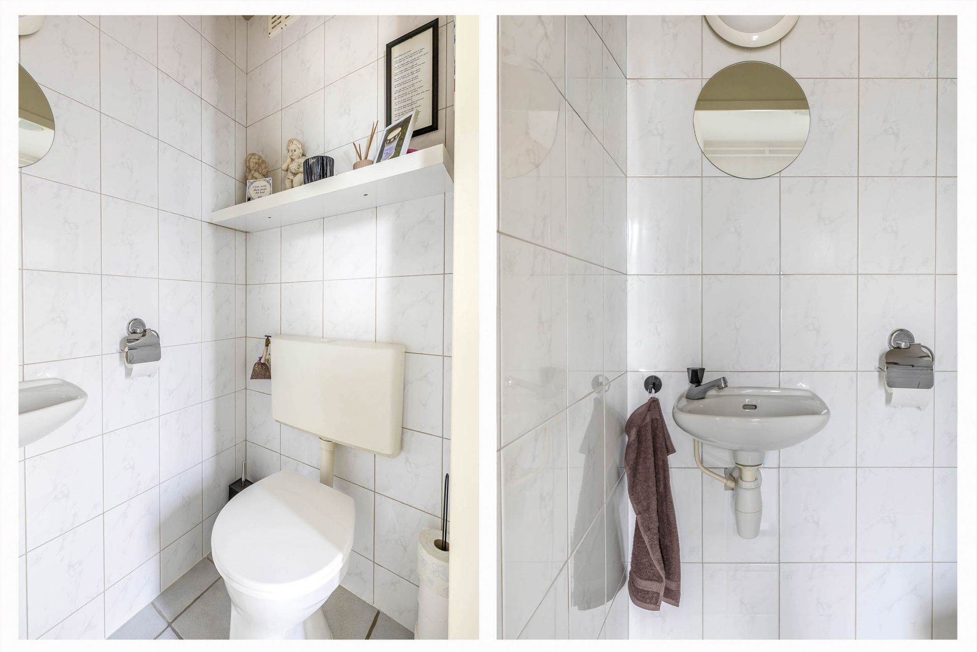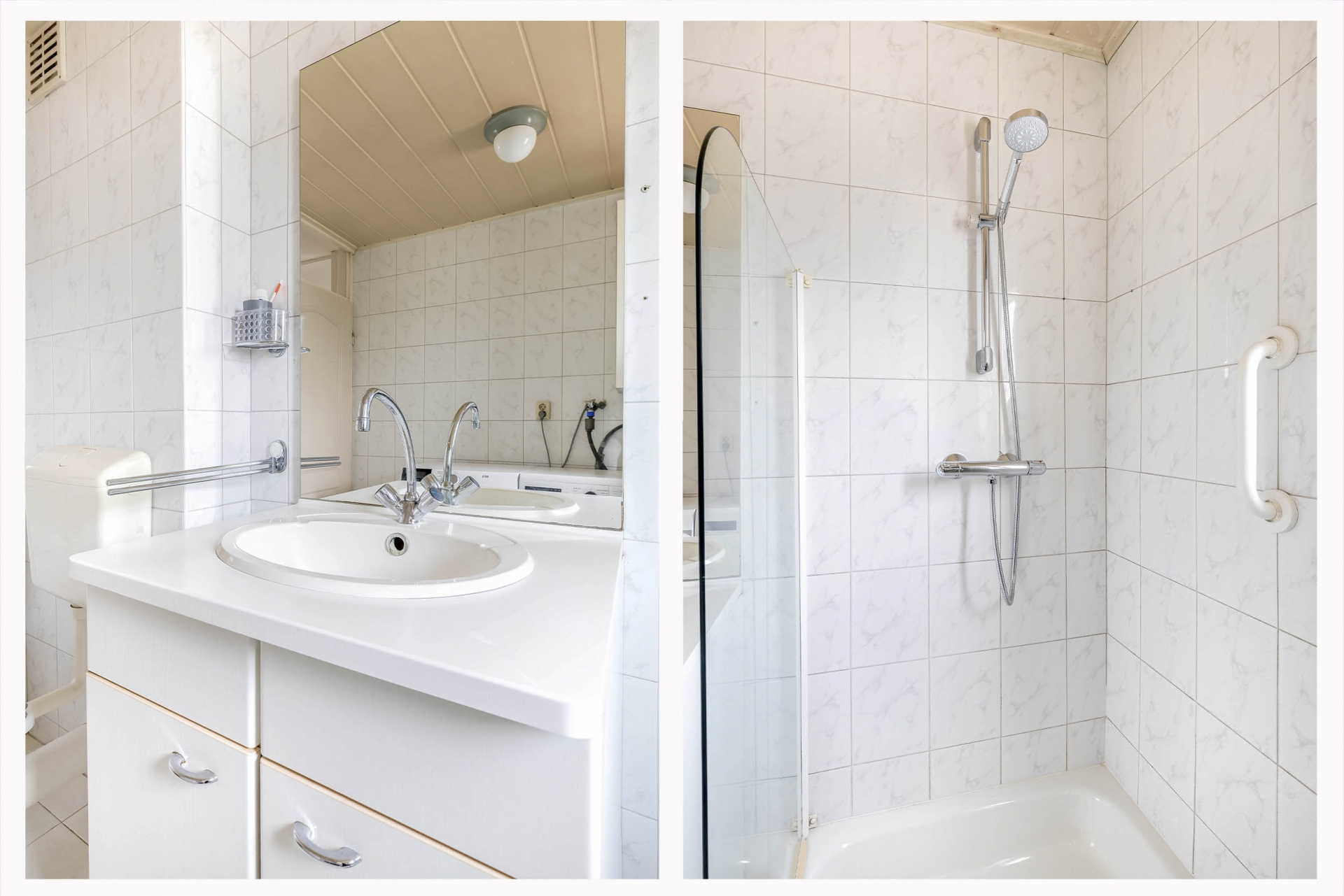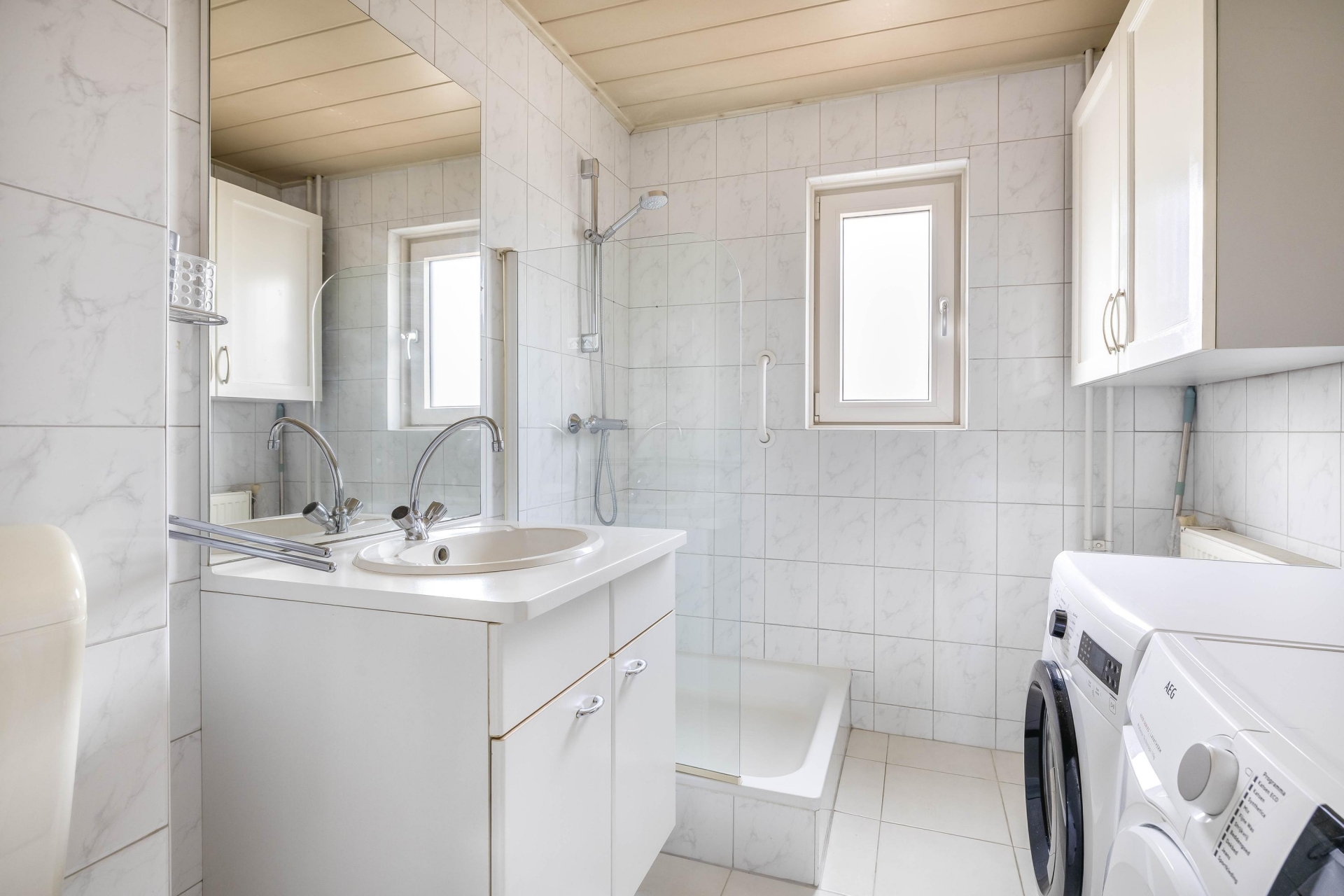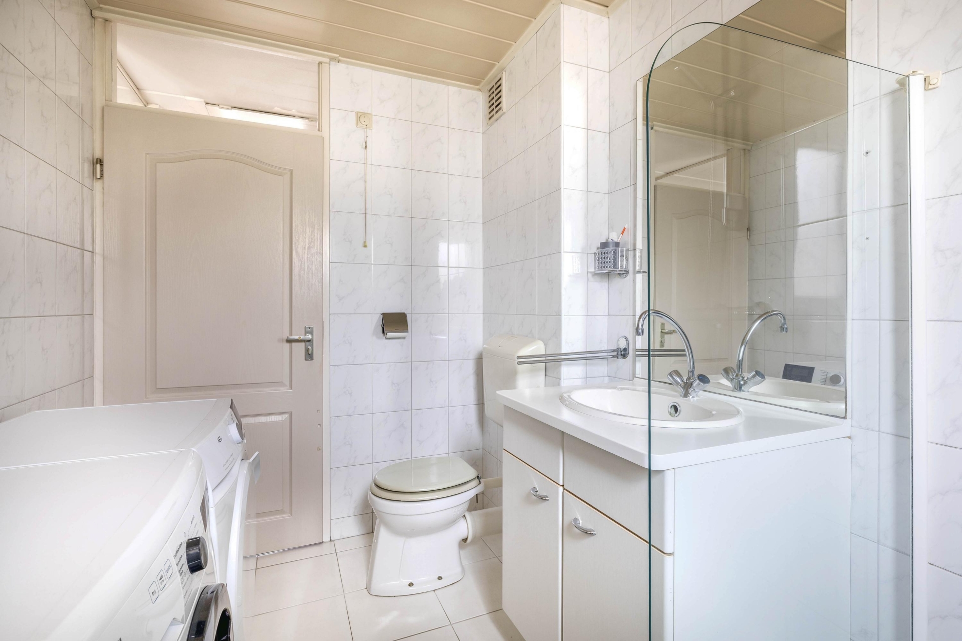 De badkamer is praktisch ingericht en voorzien van een douche, wastafel, toilet en aansluitingen voor de wasapparatuur. Alles wat je nodig hebt is aanwezig en netjes onderhouden.