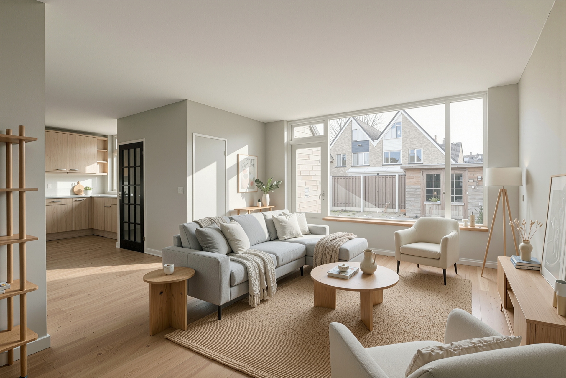 De indeling van dit huis is net even anders dan standaard, wat zorgt voor een prettige dynamiek in de leefruimtes. Aan de rechterzijde bevindt zich de fijne woonkeuken. De woonkamer ligt aan de voorzijde en is heerlijk licht dankzij de grote raampartijen. De ruimtes zijn van elkaar gescheiden, waardoor je duidelijke zones hebt voor koken, eten en ontspannen. De keuken zelf is toe aan vervanging, maar deze ruimte van 14m2 bied volop mogelijkheden. Bekijk ook de bijgevoegde artist impression beelden.