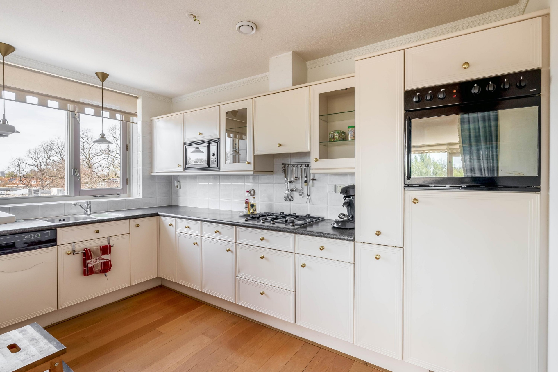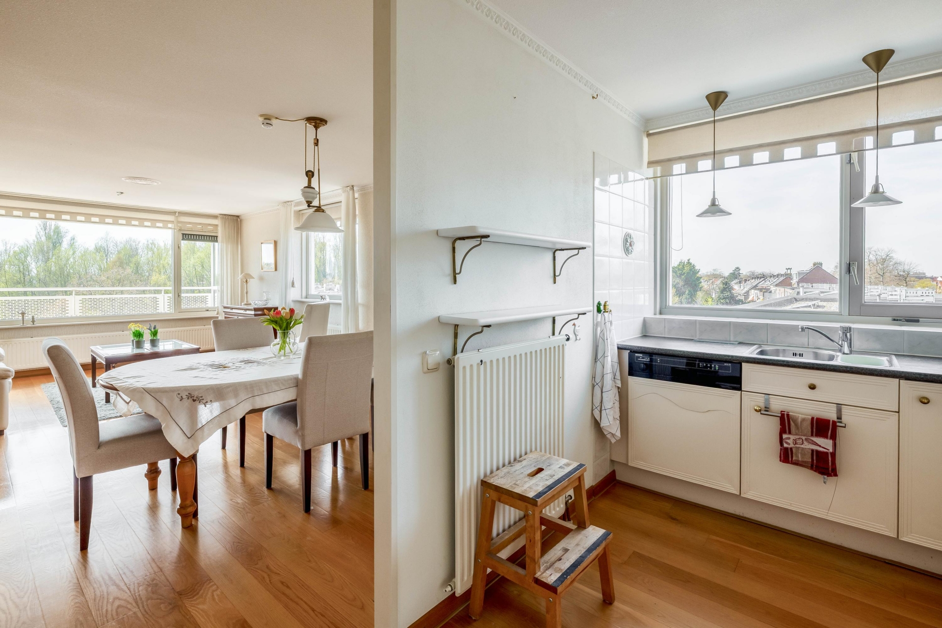 Zodra je de woonkamer binnenstapt valt het direct op: de grote raampartijen en het vrije uitzicht. Vanuit de zithoek kijk je uit over het water en het groen, wat zorgt voor een rustig en open gevoel. Dankzij de hoekligging profiteer je hier van extra lichtinval gedurende de hele dag. De woonkamer is royaal opgezet en biedt voldoende ruimte voor een comfortabele zit- en eethoek. Vanuit de woonkamer heb je direct toegang tot het balkon, waardoor binnen en buiten op een natuurlijke manier in elkaar overlopen.