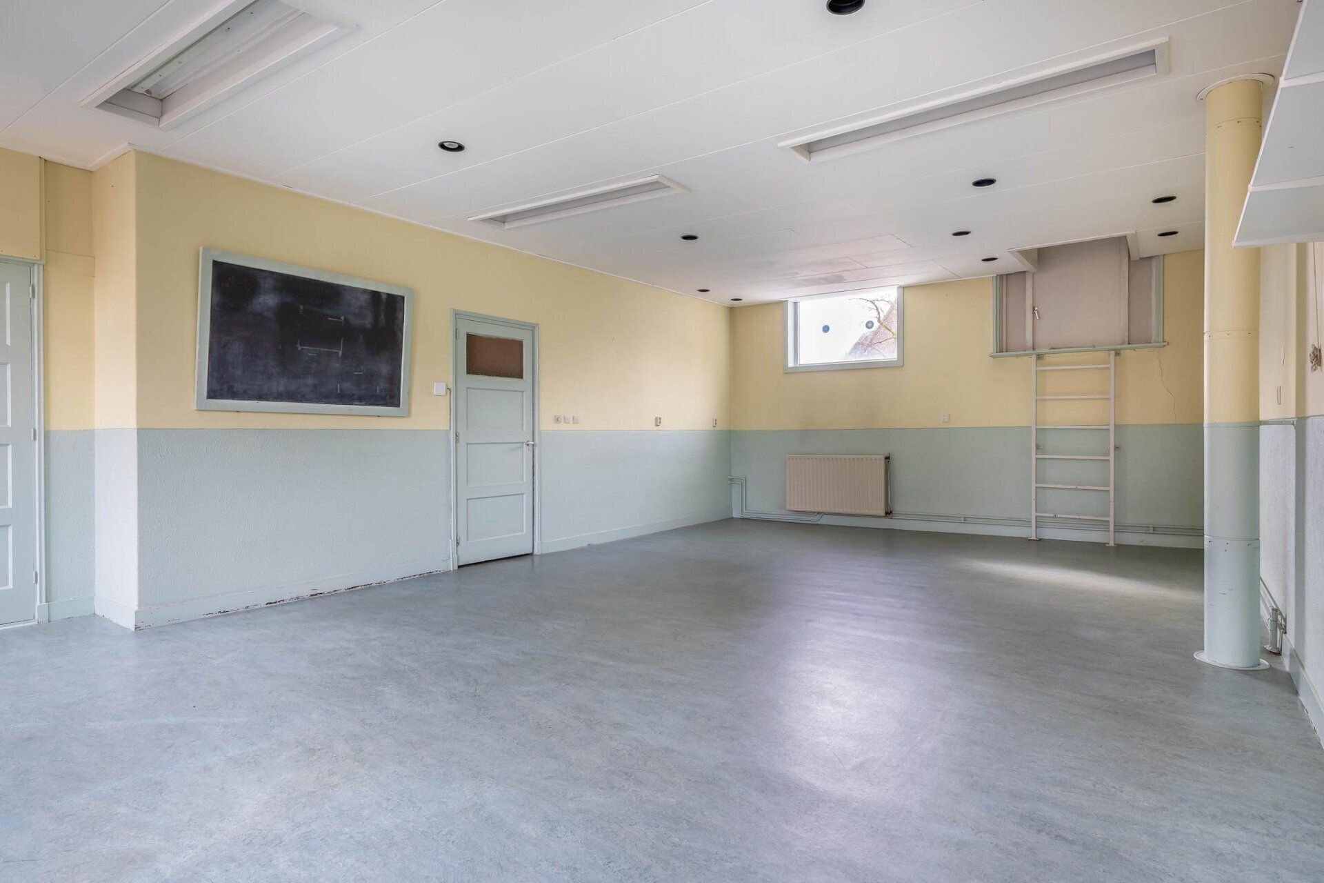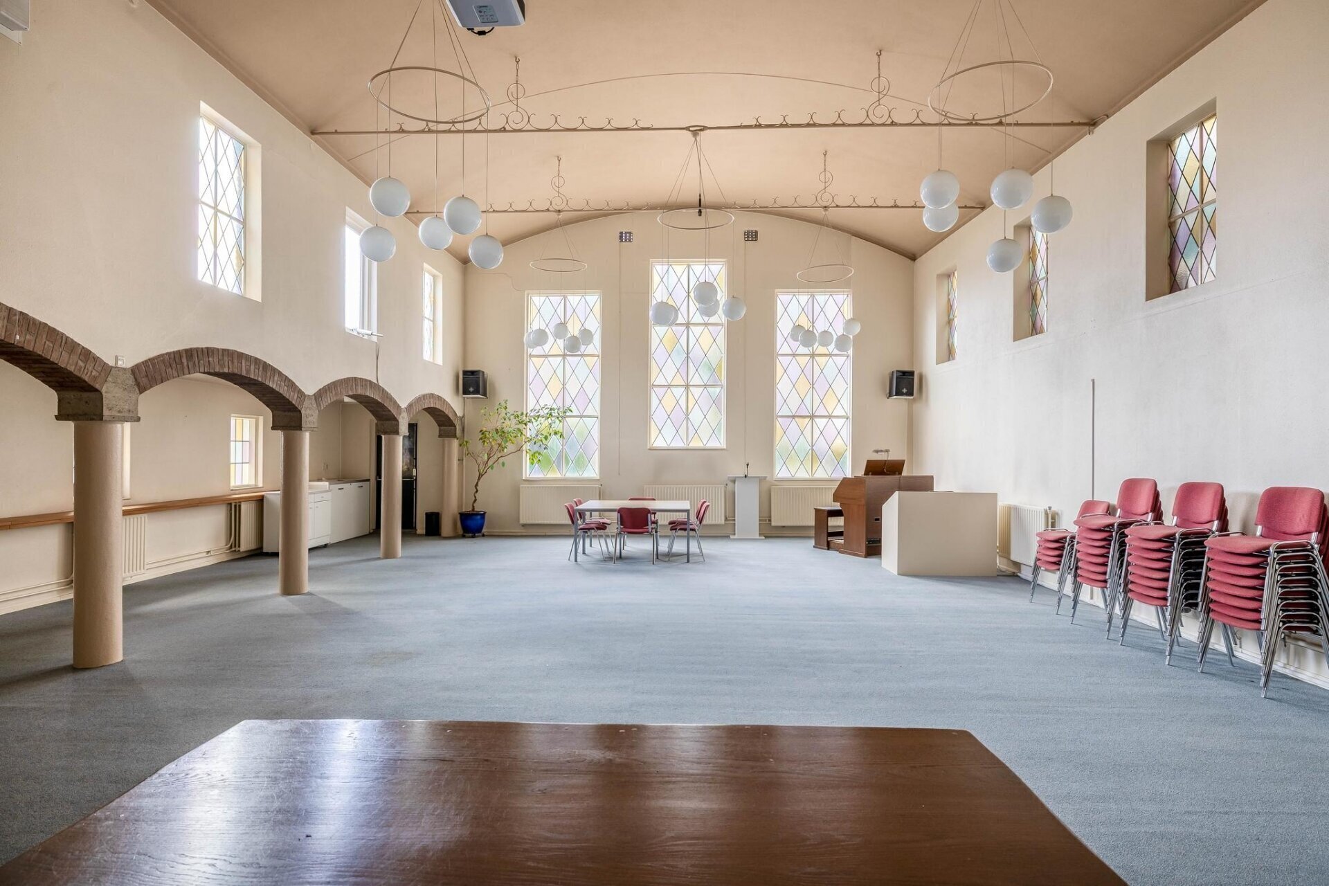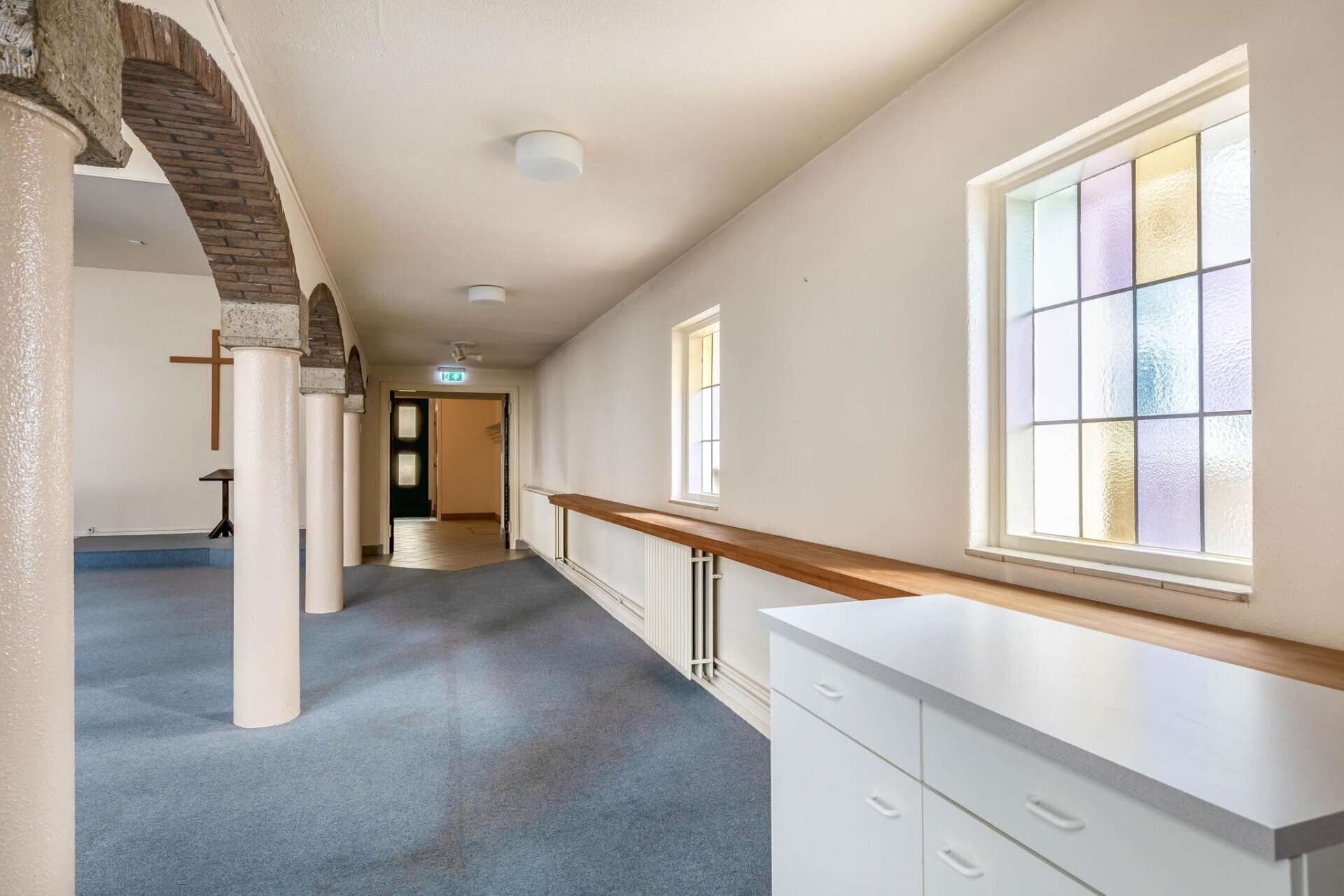 De achterzijde van het pand is uitgebouwd in 1955 waarbij een imposante ruimte gecreëerd is, gekenmerkt door hoge plafonds en authentieke details zoals glas-in-lood-elementen.