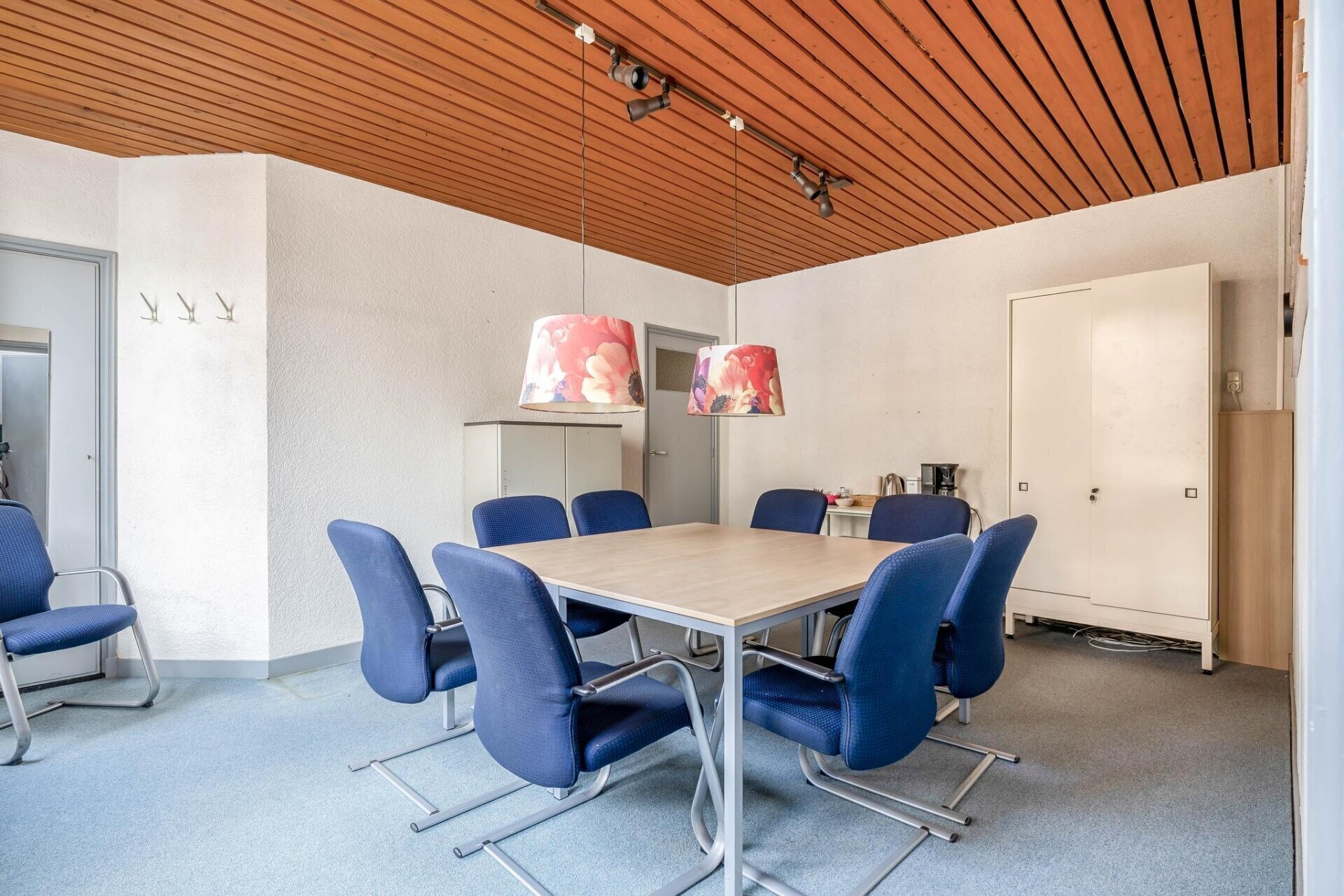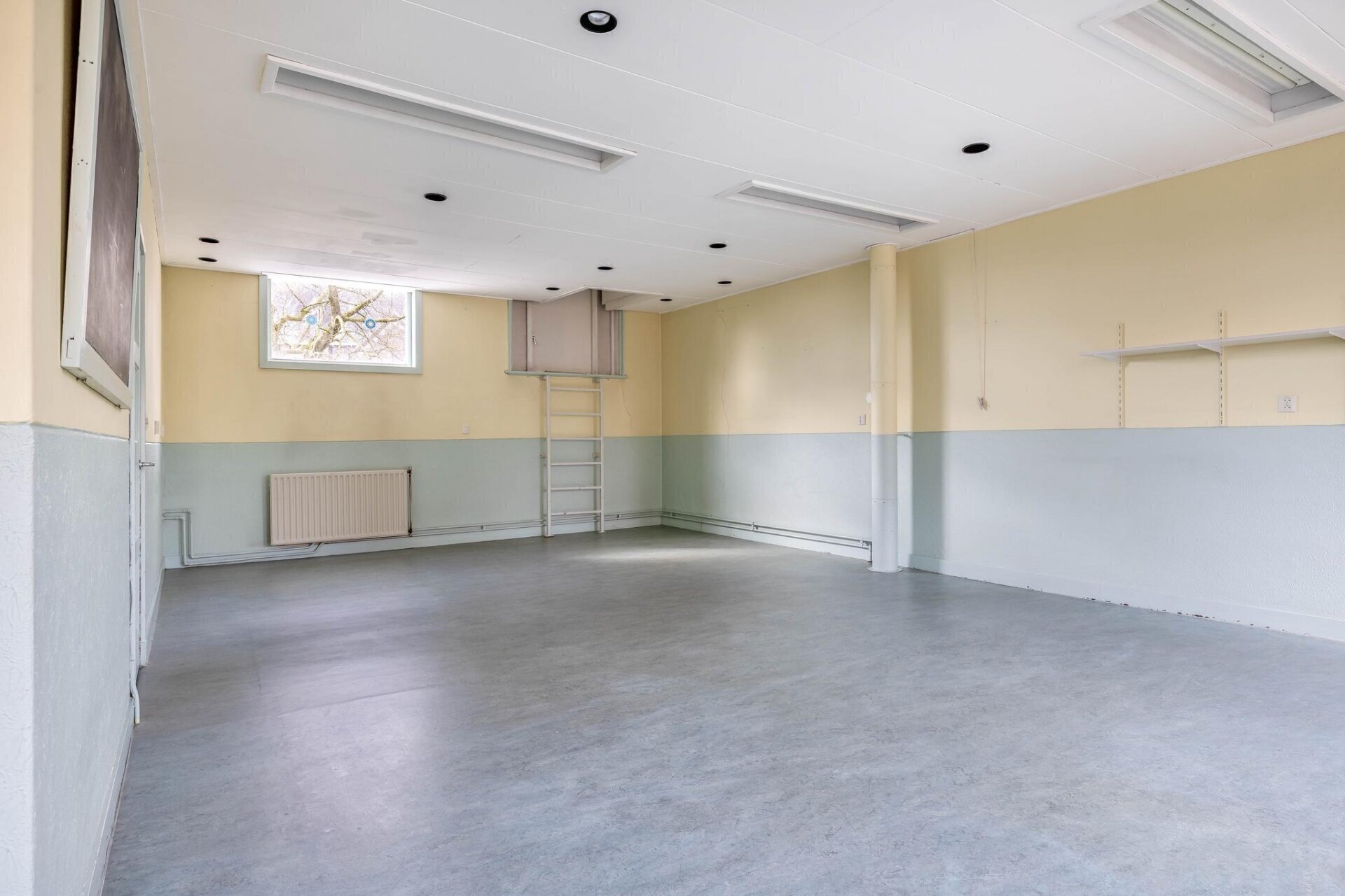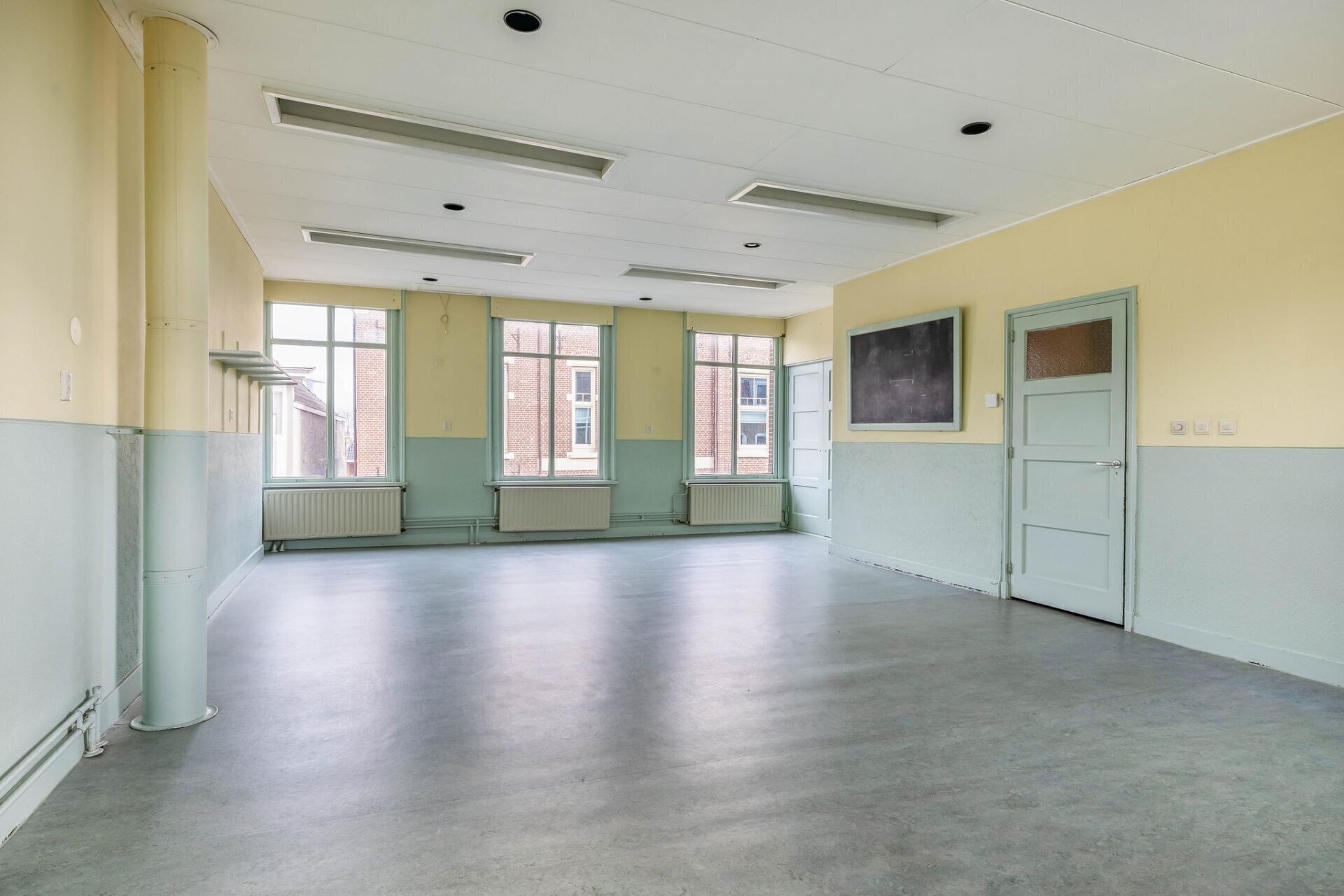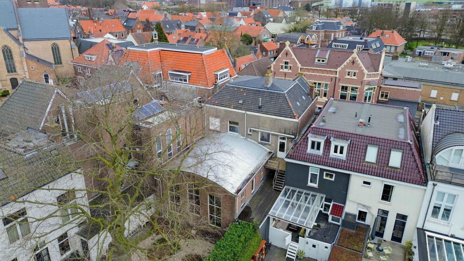 De achterzijde van het pand is uitgebouwd in 1955 waarbij een imposante ruimte gecreëerd is, gekenmerkt door hoge plafonds en authentieke details zoals glas-in-lood-elementen.