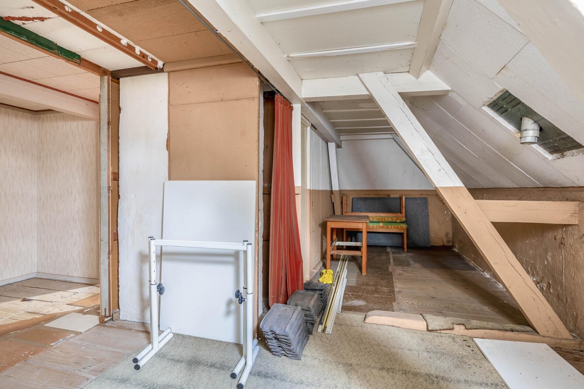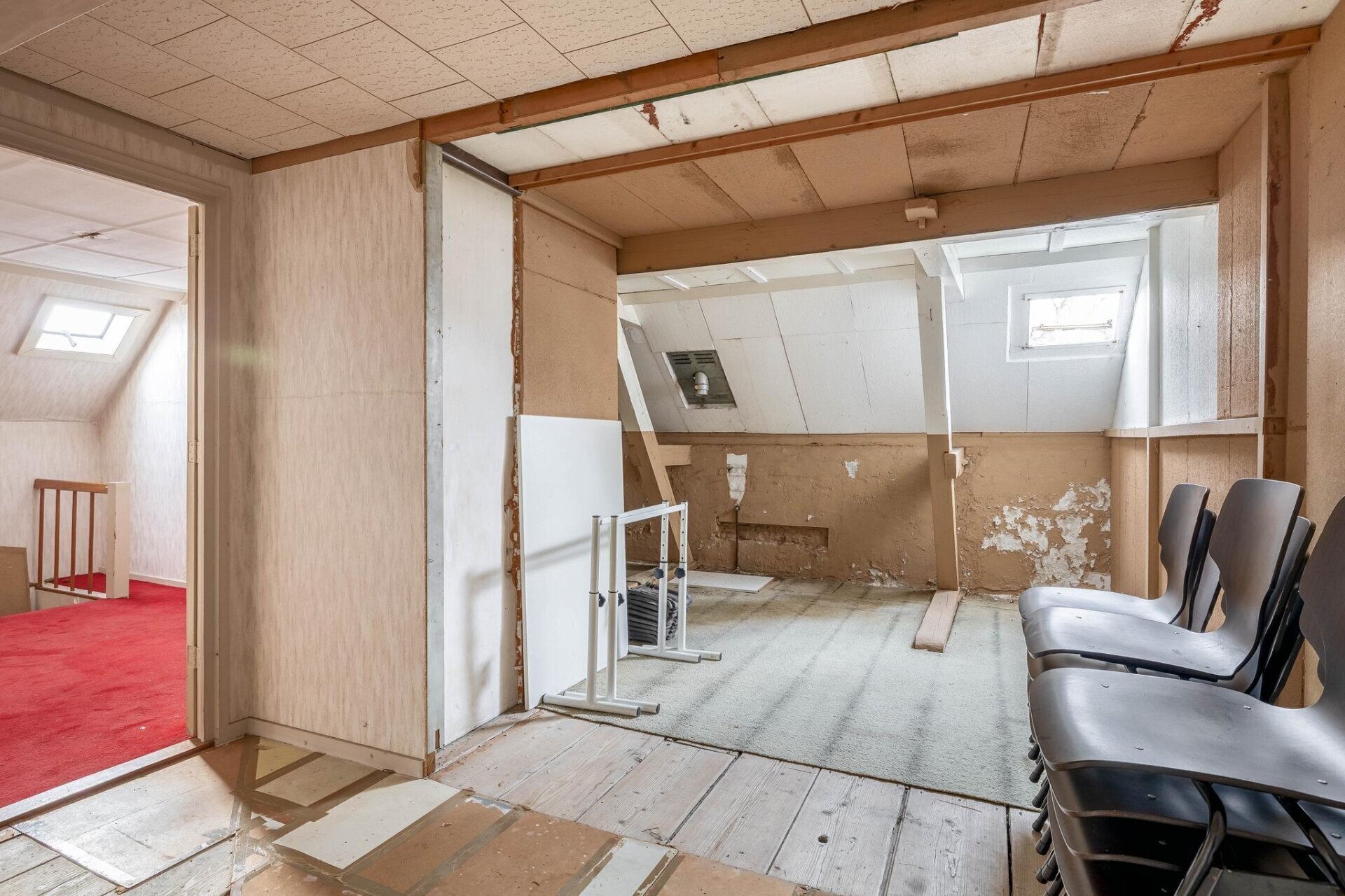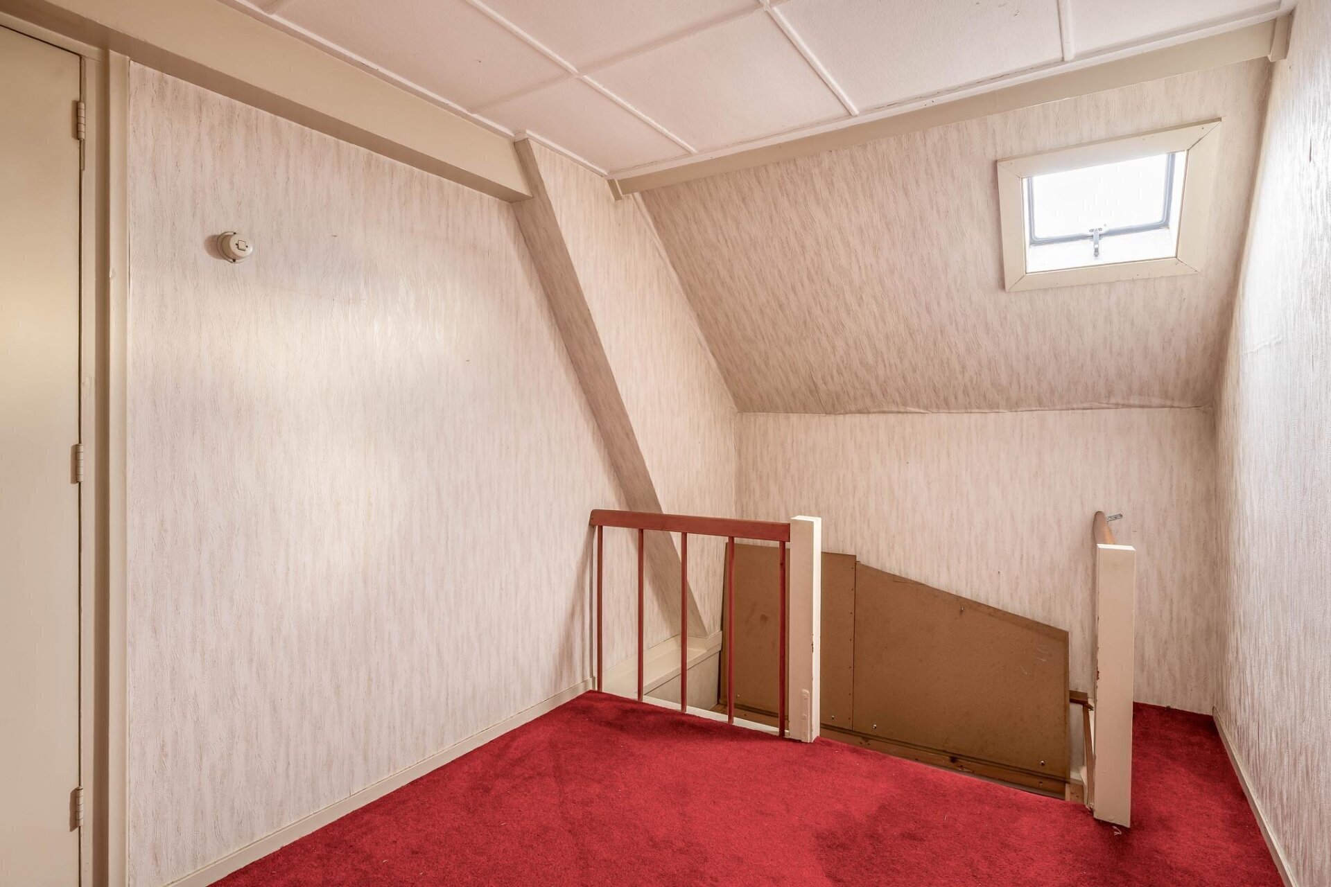 De overloop op de eerste verdieping geeft toegang tot een ruime kamer aan de rechterzijde van het pand, een toilet met fonteintje en een overloop/keuken.