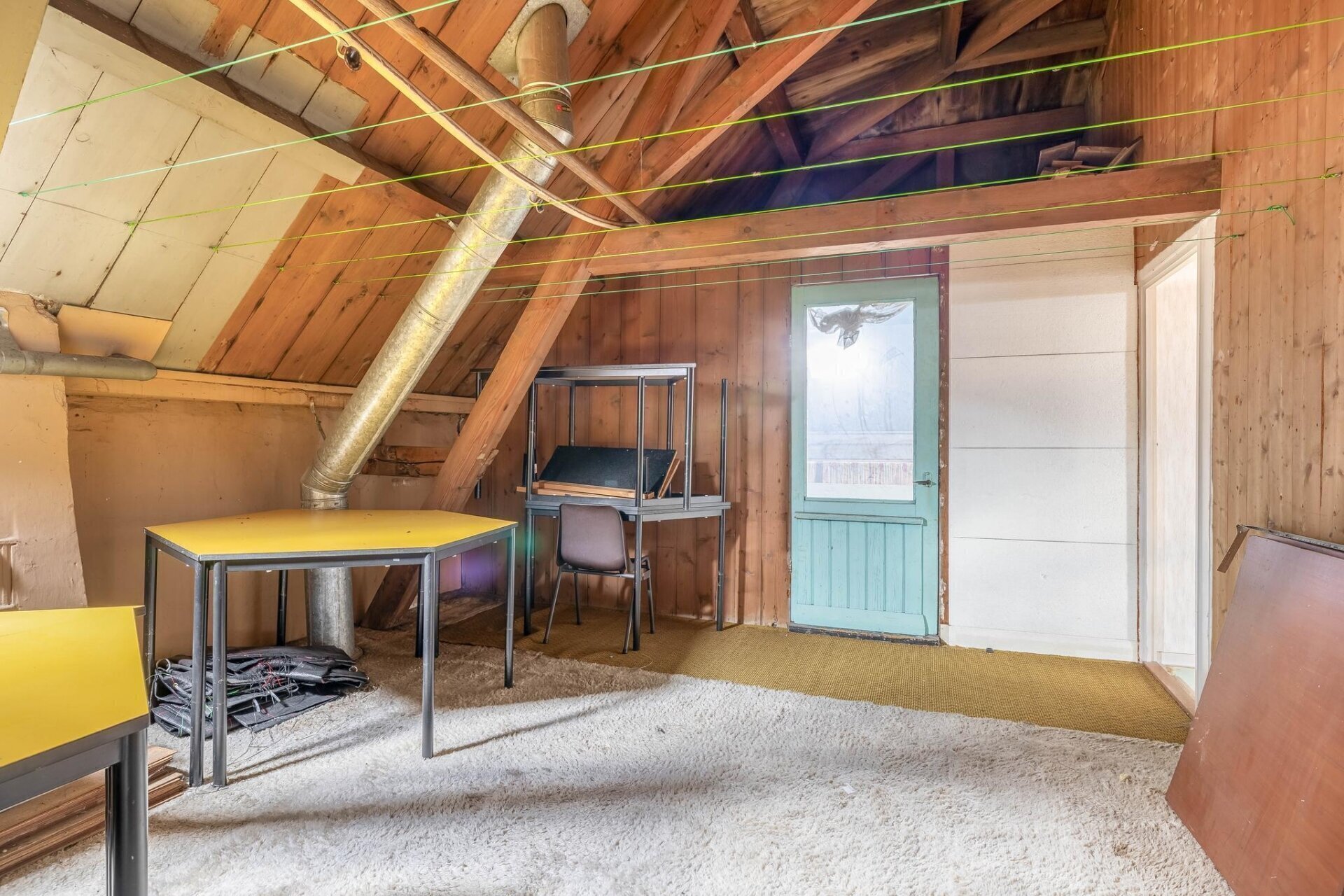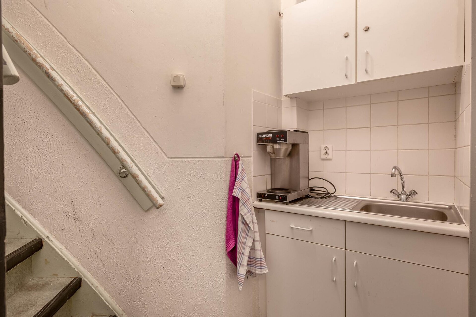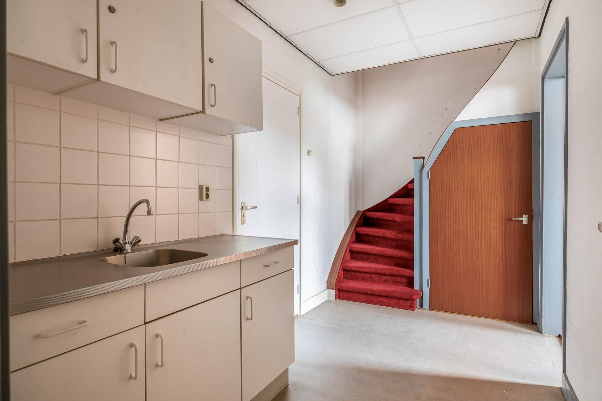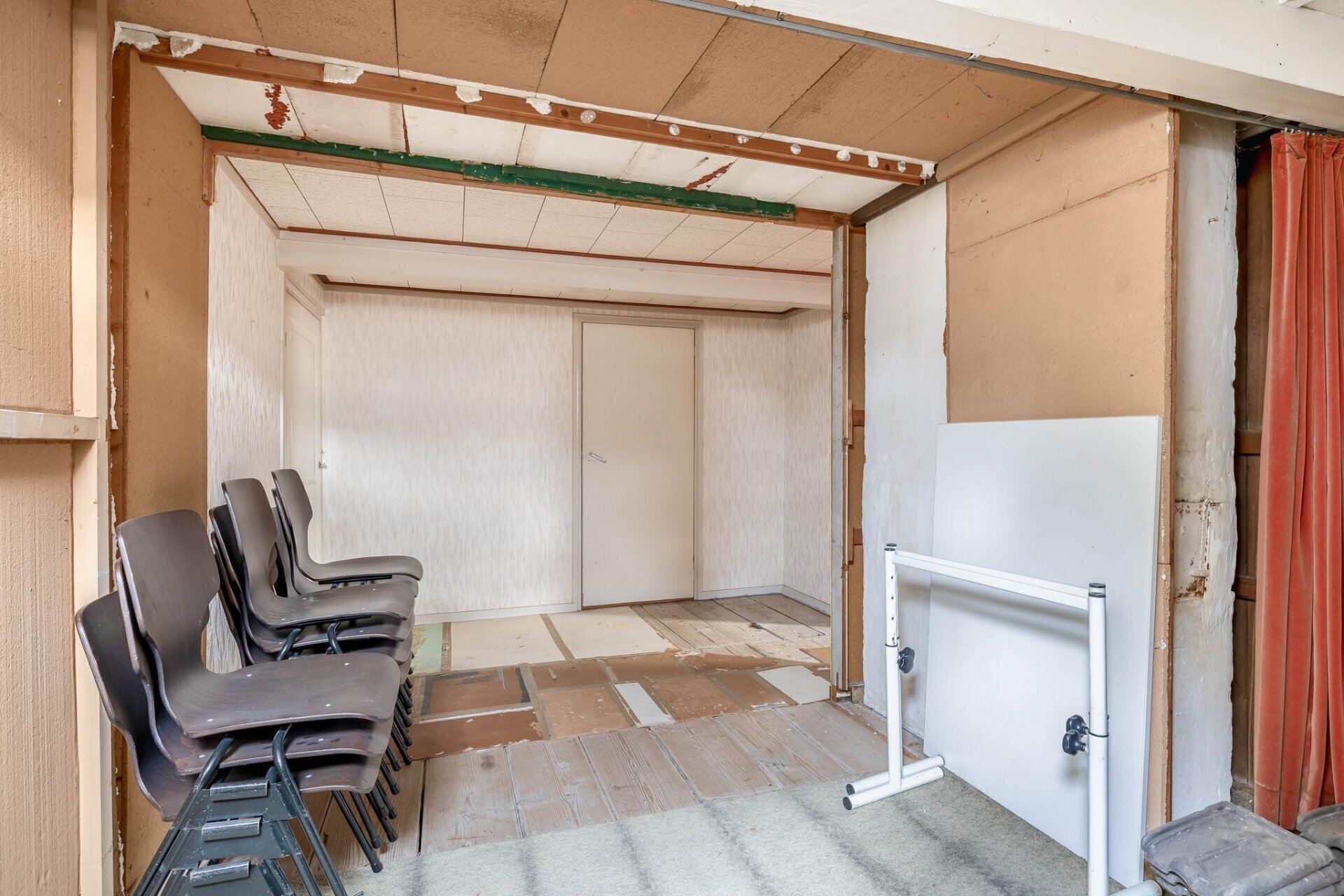 De overloop op de eerste verdieping geeft toegang tot een ruime kamer aan de rechterzijde van het pand, een toilet met fonteintje en een overloop/keuken.