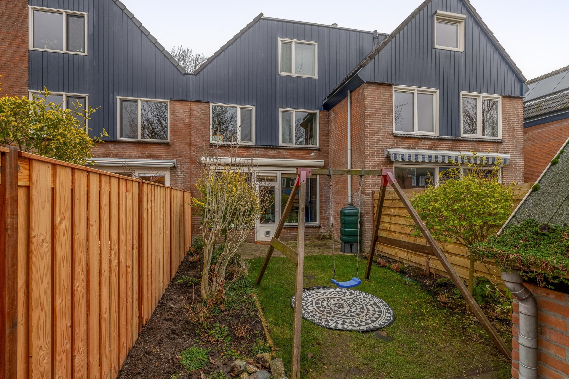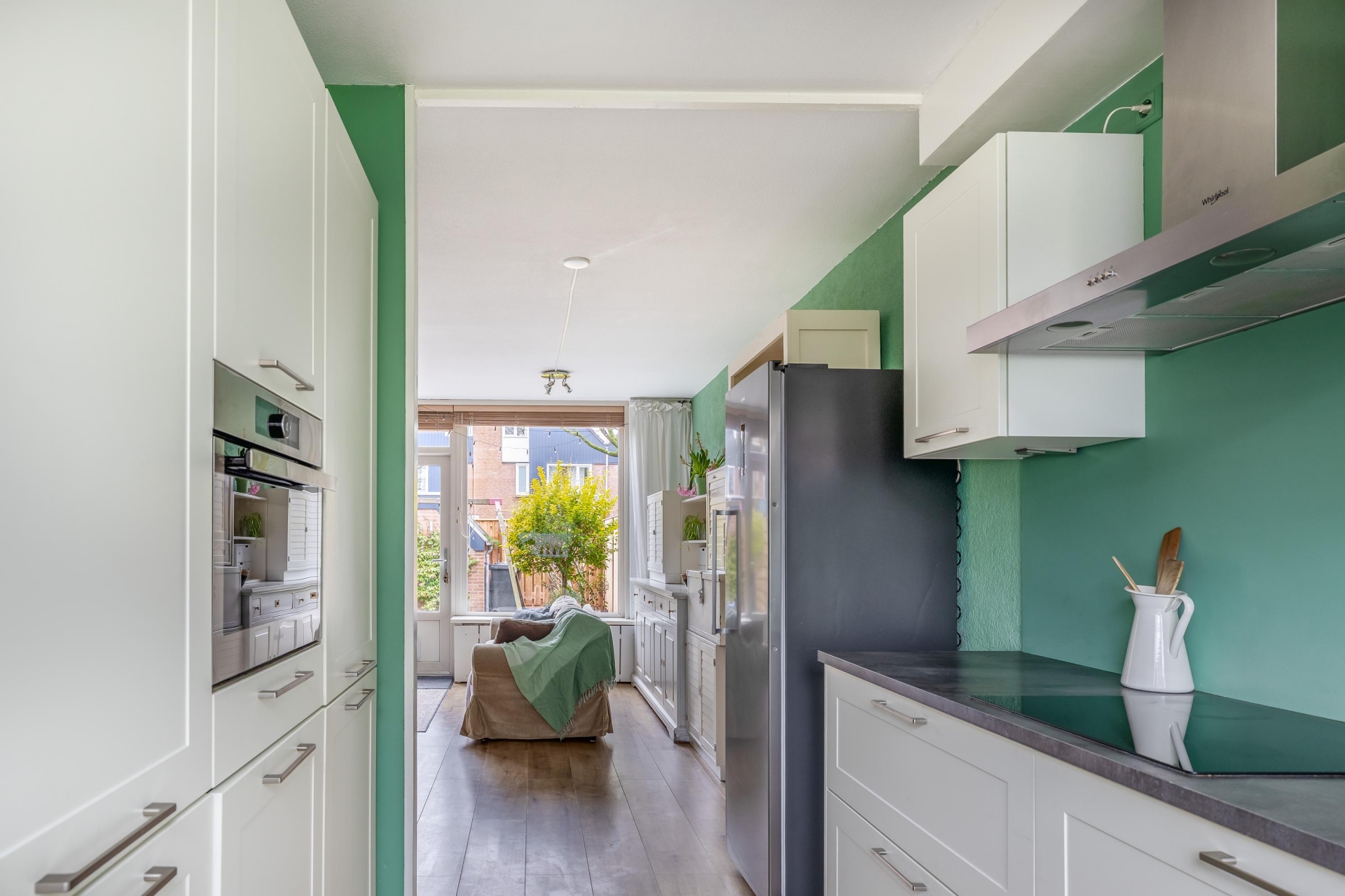 De woonkamer is tuingericht en dankzij de grote raampartij en deur naar buiten valt er veel daglicht binnen. Vanuit de zithoek kijk je zo de achtertuin in, wat zorgt voor een prettige, open sfeer.