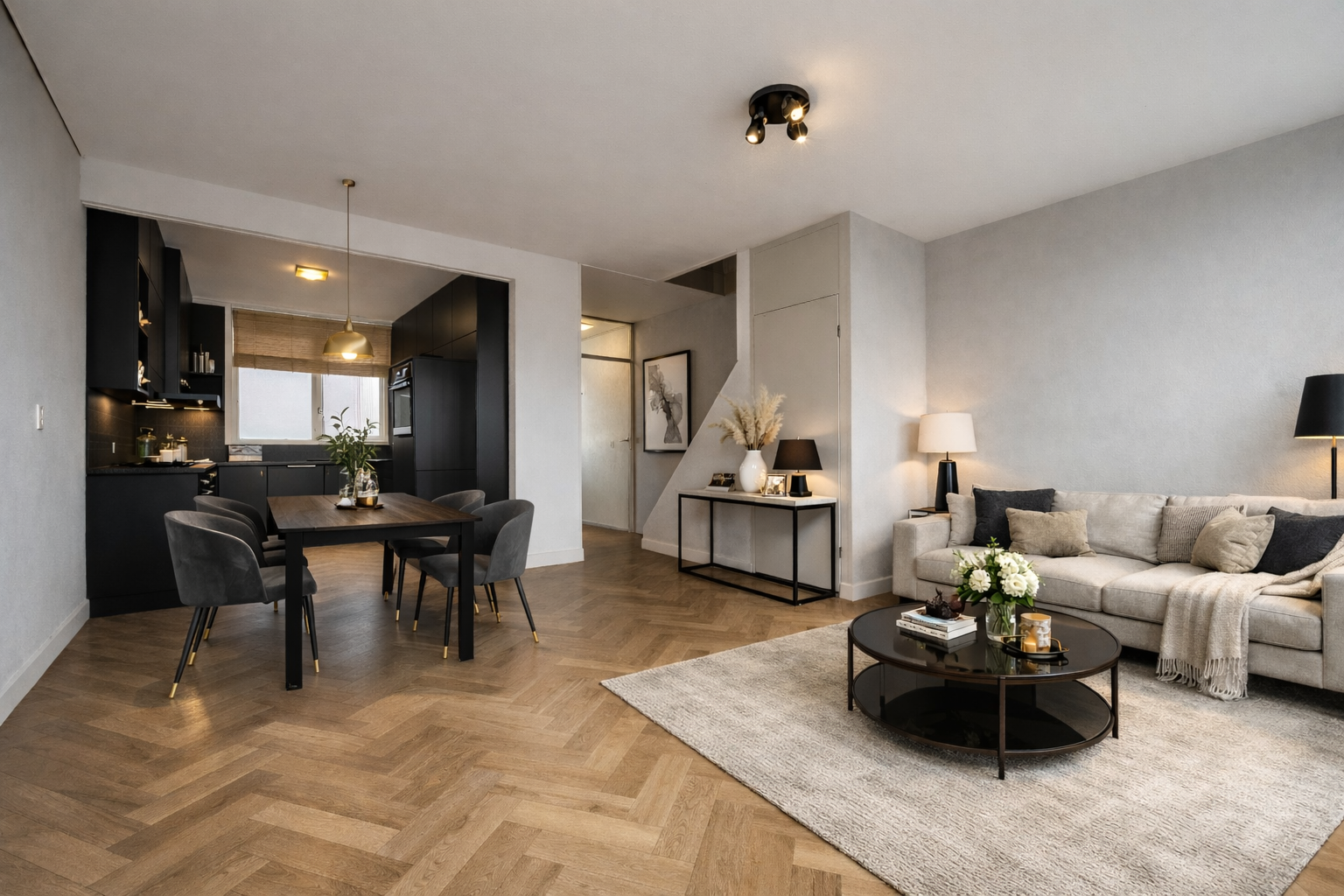 De begane grond begint met een nette entree en een modern toilet. Vanuit hier stap je de lichte en ruime woonkamer binnen, waar je meteen de ruimte en het daglicht opmerkt. Dankzij de brede raampartijen en de dubbele deuren naar het balkon voelt deze verdieping extra ruim aan. Op het balkon kun je lekker buiten zitten met een kop koffie of een goed boek.
