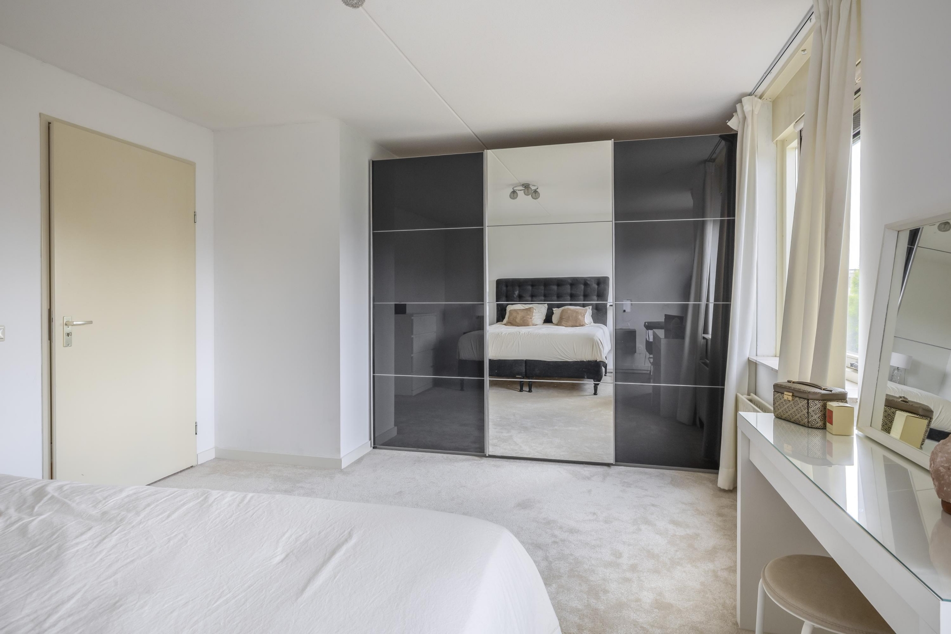 Op de bovenste verdieping vind je drie slaapkamers, waarvan de grootste aan de voorzijde ligt. Deze kamer biedt uitzicht op het water en de buurt – een fijne plek om ’s ochtends rustig wakker te worden. De twee andere kamers zijn ideaal als kinderkamer, werkkamer of logeerkamer. Alle slaapkamers zijn netjes afgewerkt met een gestoffeerde vloer en lichte wanden.
