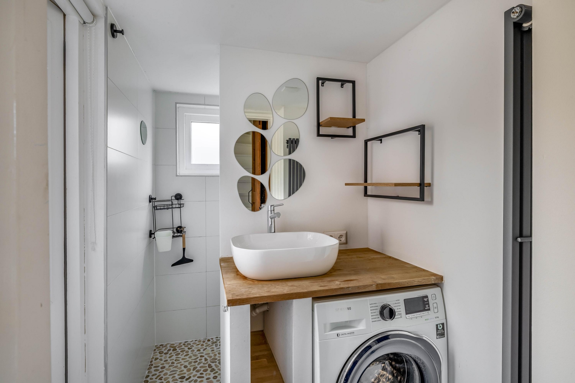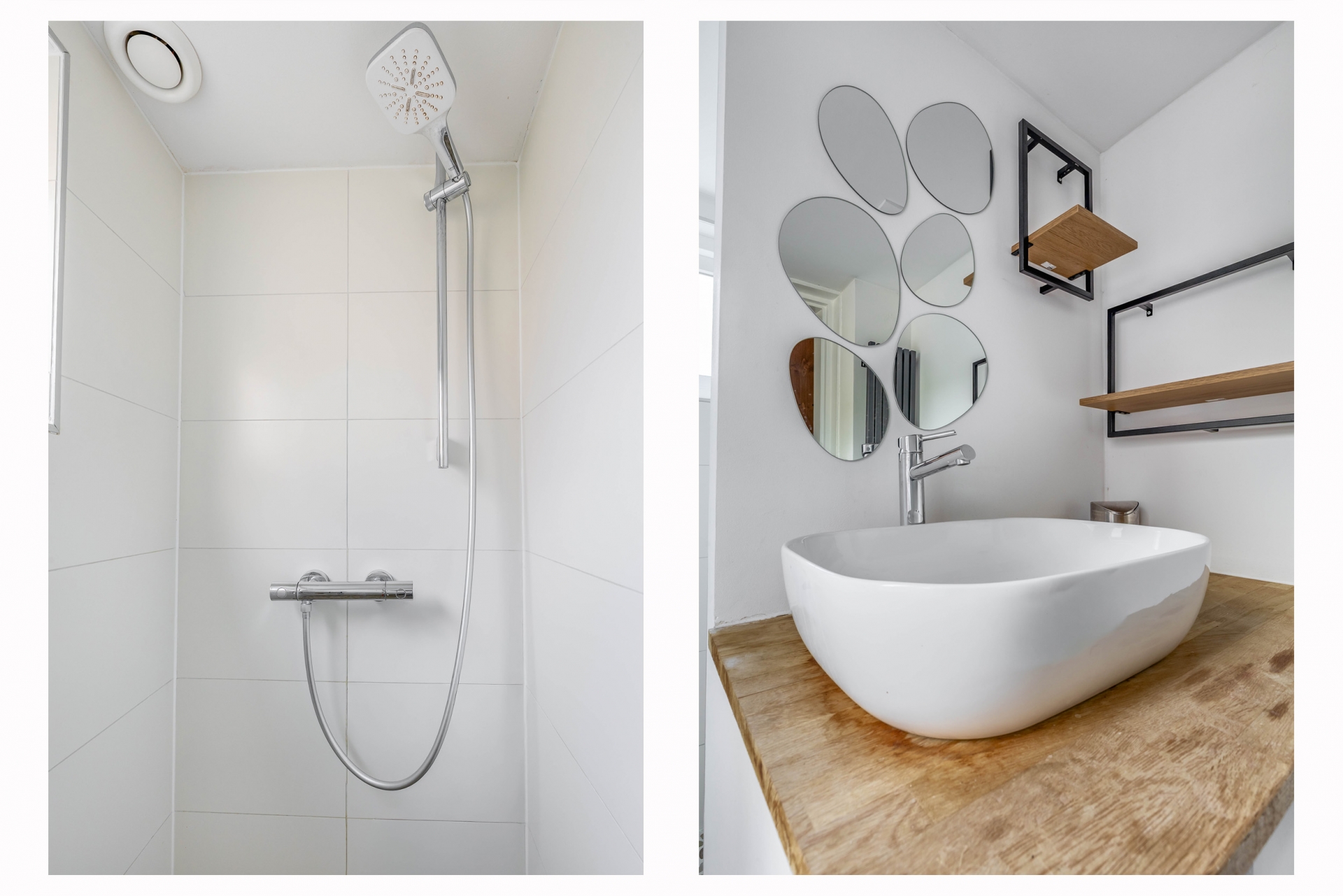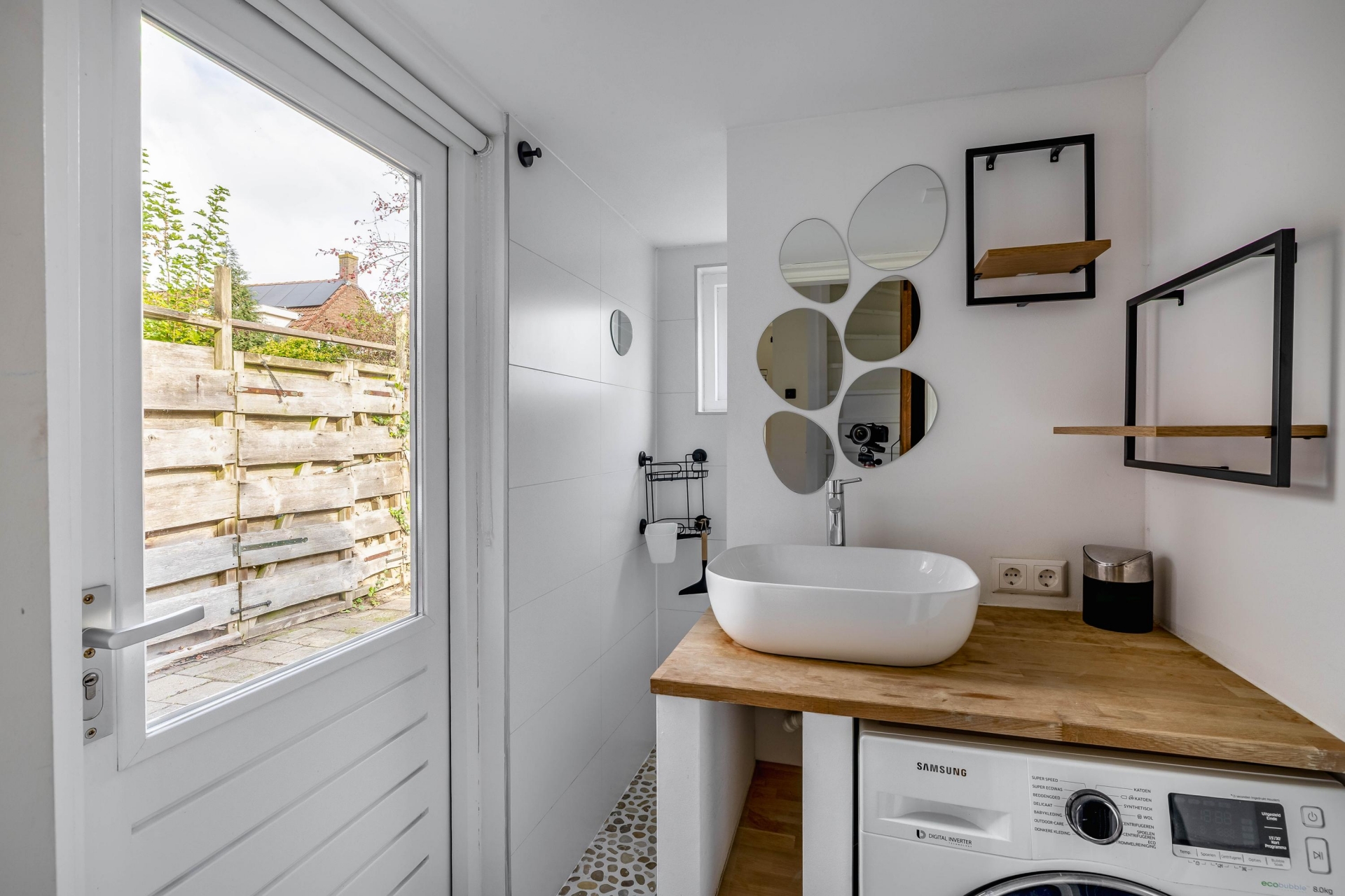 De badkamer is recent vernieuwd en stijlvol afgewerkt met een inloopdouche, wastafelmeubel en moderne tegels. Ook de aansluiting voor wasmachine en droger is hier netjes verwerkt. De combinatie van lichte kleuren, houten accenten en moderne details zorgt voor een frisse, eigentijdse uitstraling.