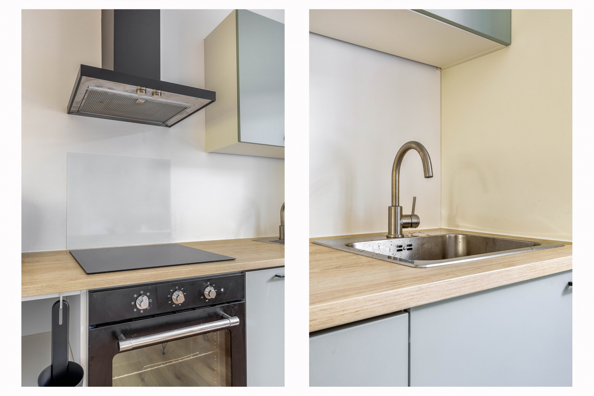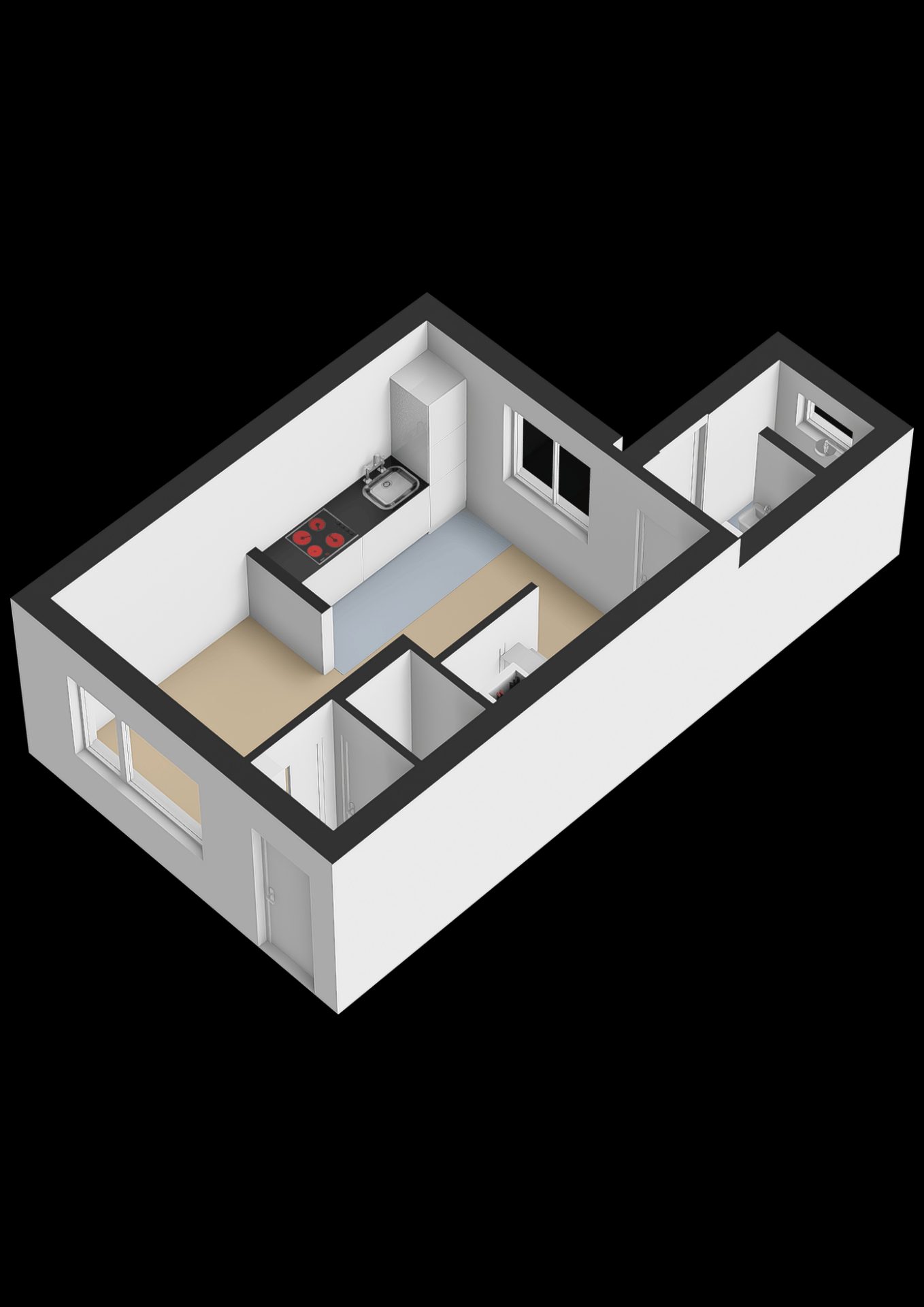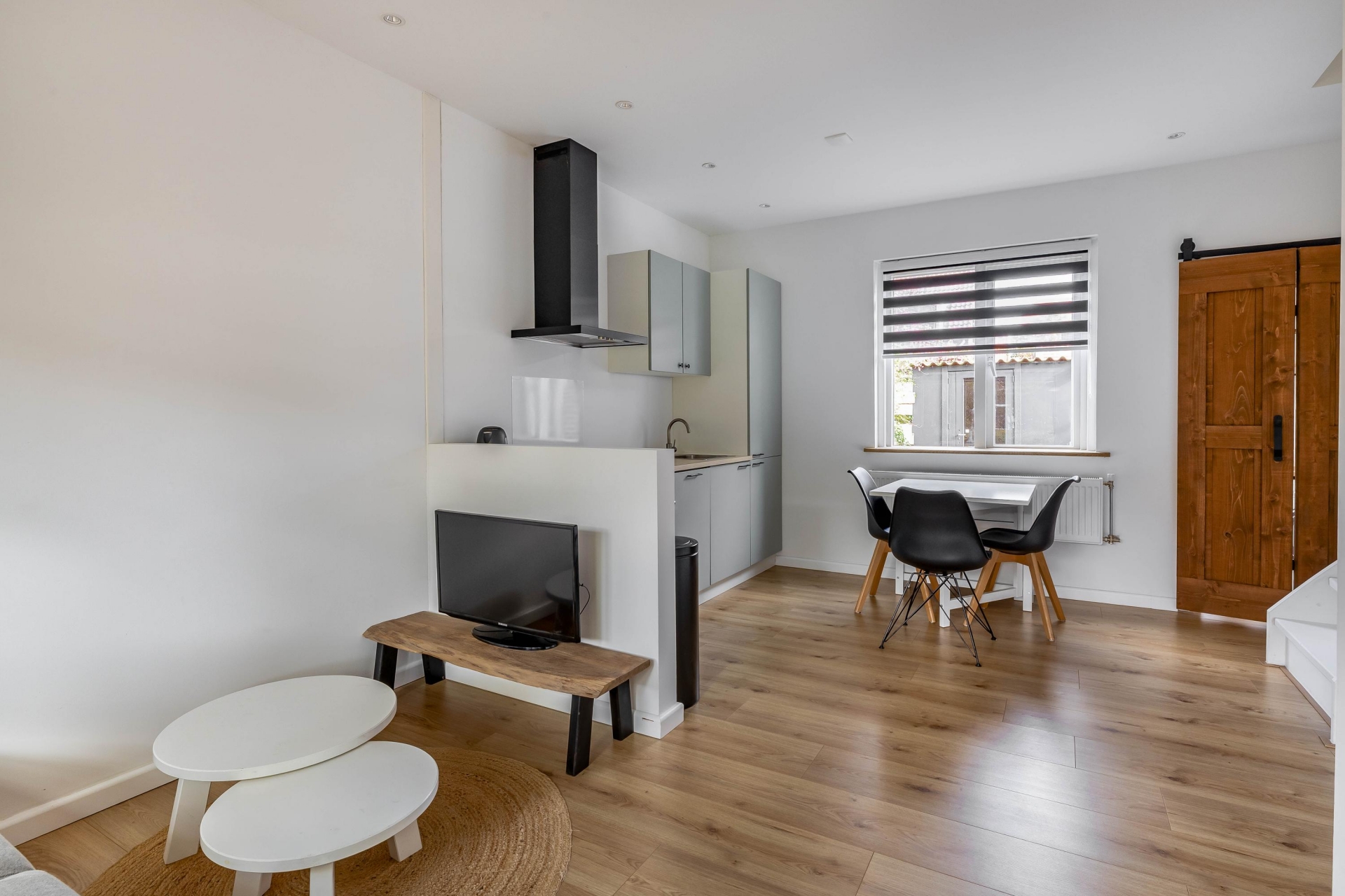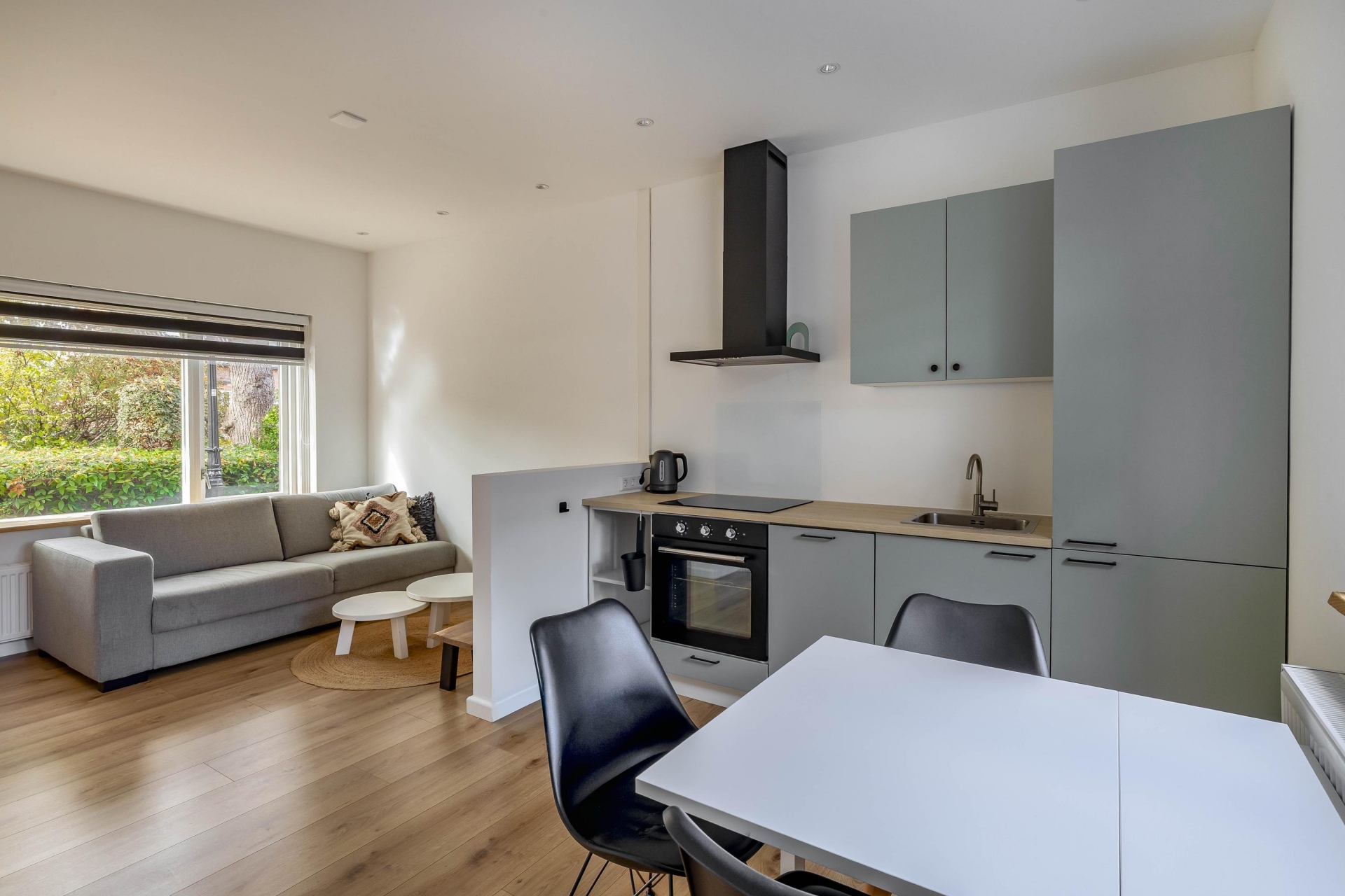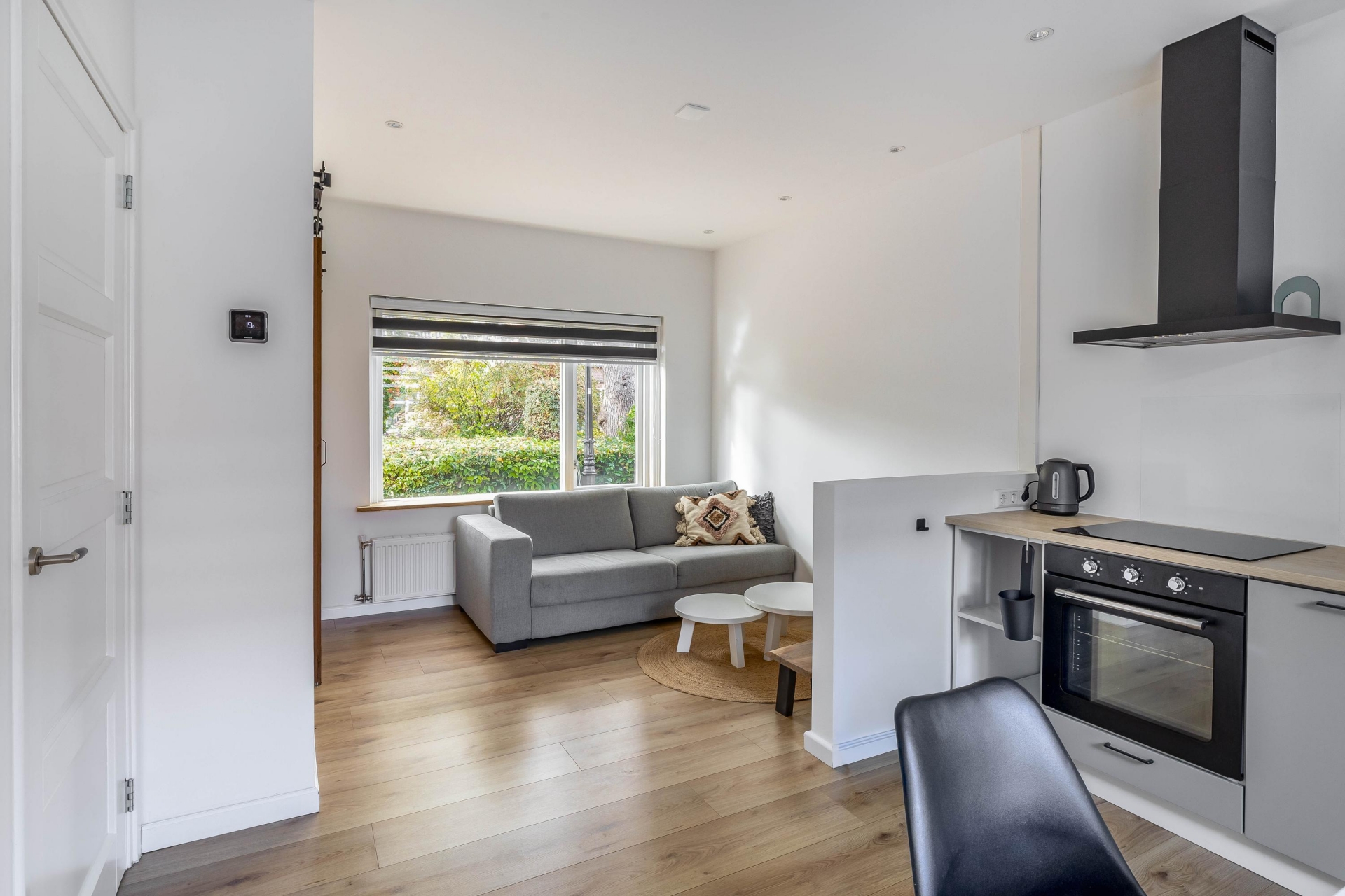 Binnenkomst is via een knusse entree alwaar een modern toilet. Eenmaal binnen valt direct de strakke afwerking op. De lichte woonkamer met laminaatvloer en grote raampartij biedt een fijne plek om te ontspannen. De open keuken is compact maar modern ingericht met een inductiekookplaat, afzuigkap, combi-oven en een koel-vriescombinatie. Alles wat je nodig hebt zit erin — en dat in een stijlvol, strak jasje.