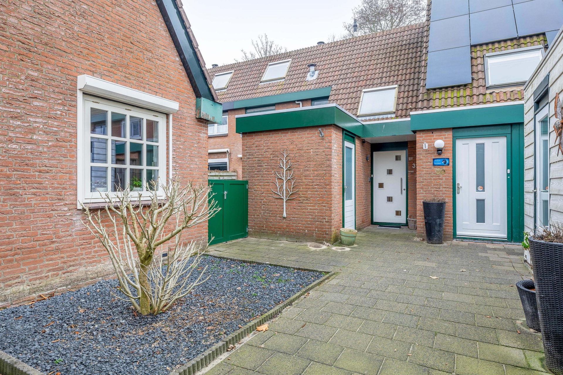 Aan de voorzijde parkeer je eenvoudig meerdere auto’s op eigen erf. De carport zorgt ervoor dat je altijd droog uitstapt. De entree ligt beschut en geeft toegang tot de hal met toilet en meterkast. Vanuit hier loop je direct de leefruimte in.