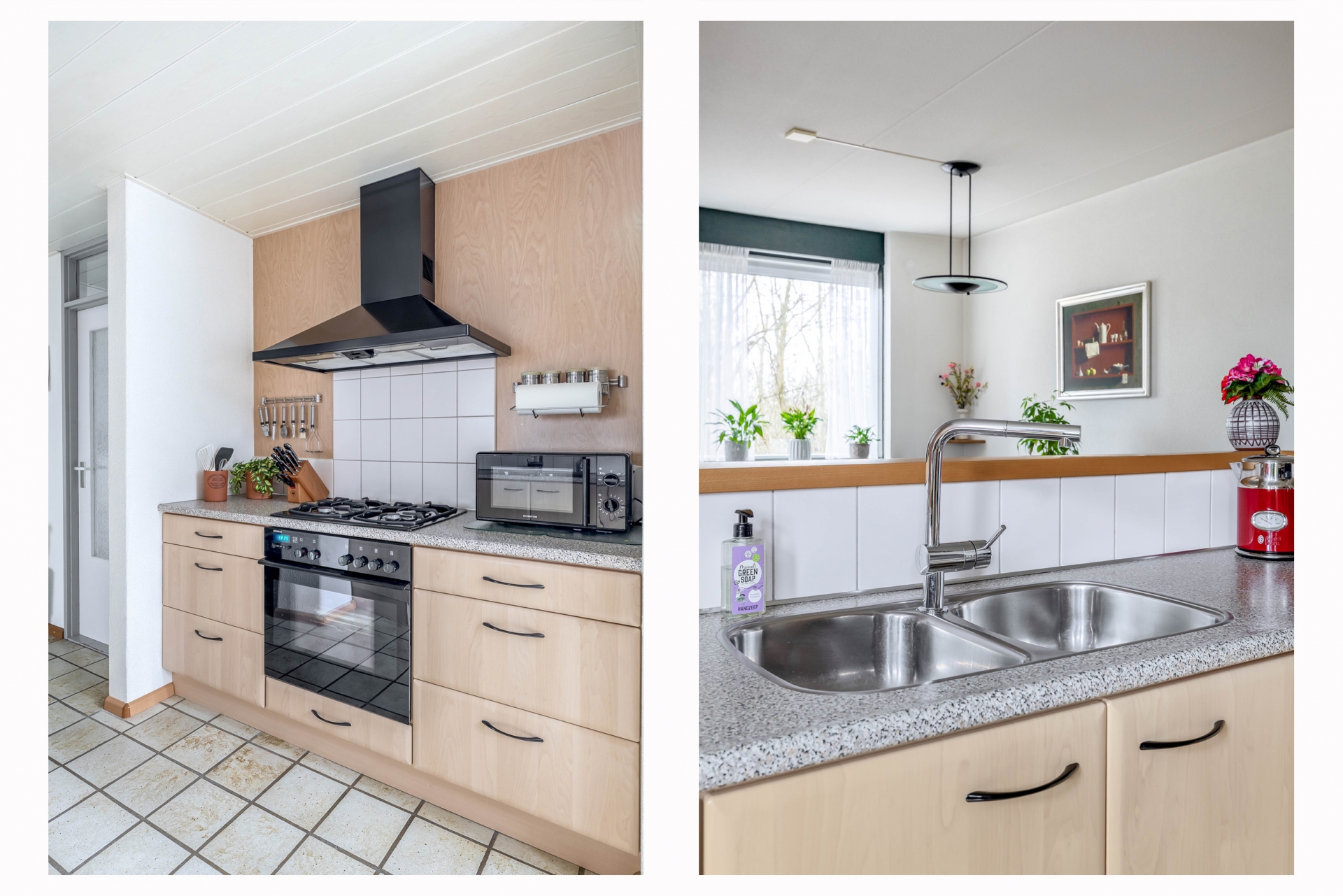 De halfopen keuken sluit aan op de leefruimte en is praktisch ingericht met voldoende werk- en bergruimte. Vanuit de keuken heb je zicht op de tuin en stap je zo naar buiten. Aangrenzend vind je de aangebouwde stenen berging met elektra, ideaal voor fietsen, gereedschap of extra opslag.
