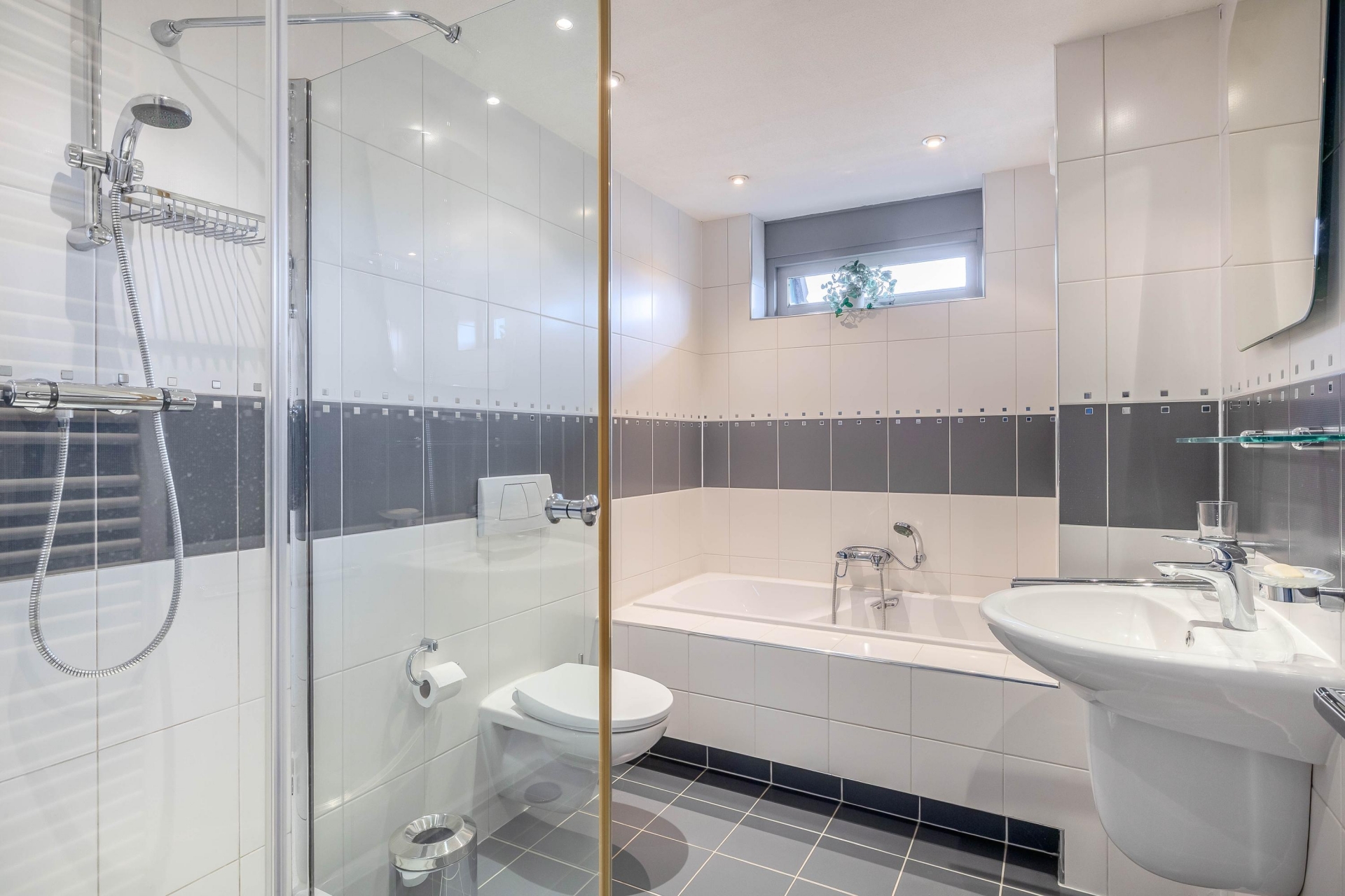 De badkamer is compleet uitgevoerd met een ligbad, separate douche, wastafel en tweede toilet. Dankzij het raam is er natuurlijke ventilatie en prettig daglicht.