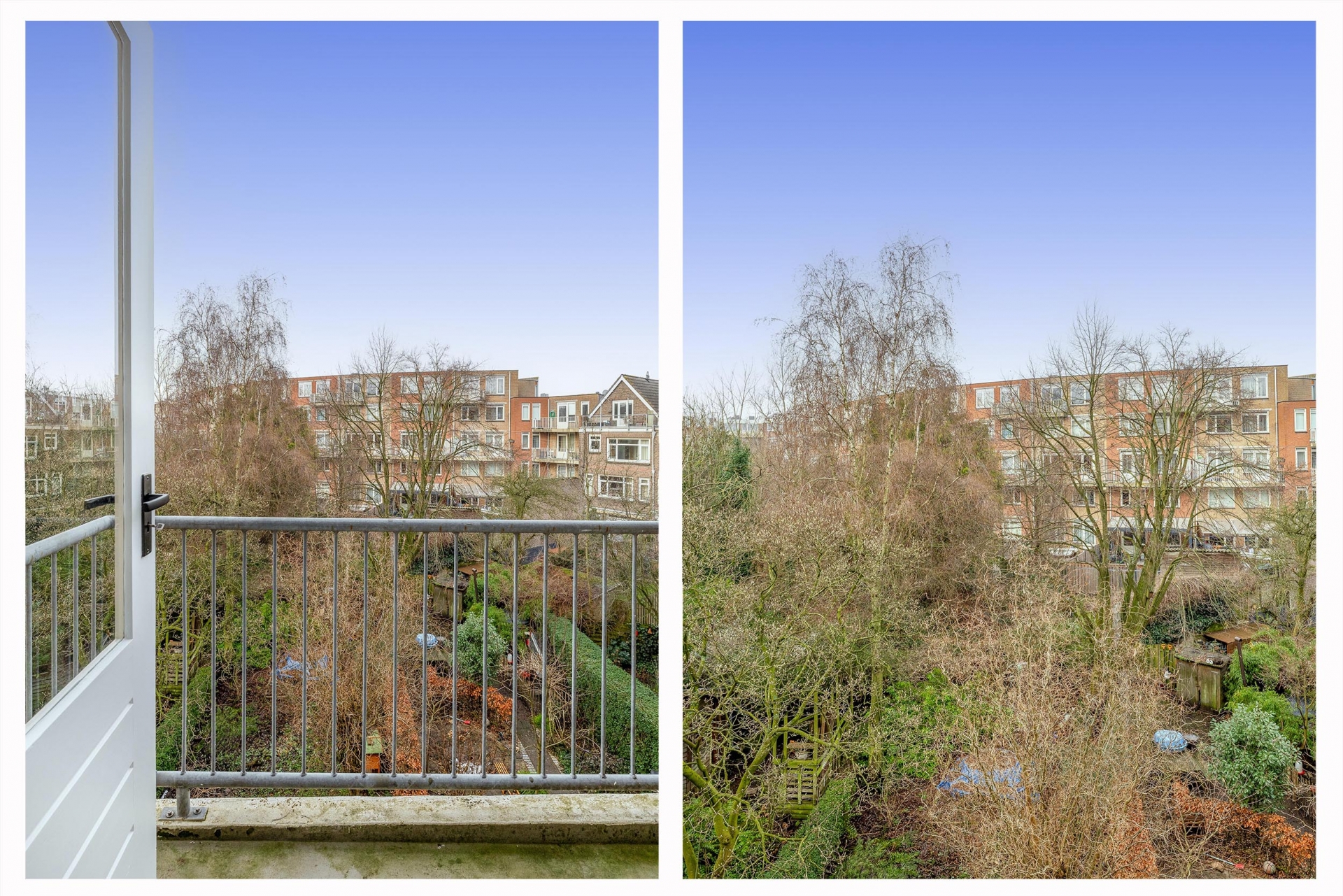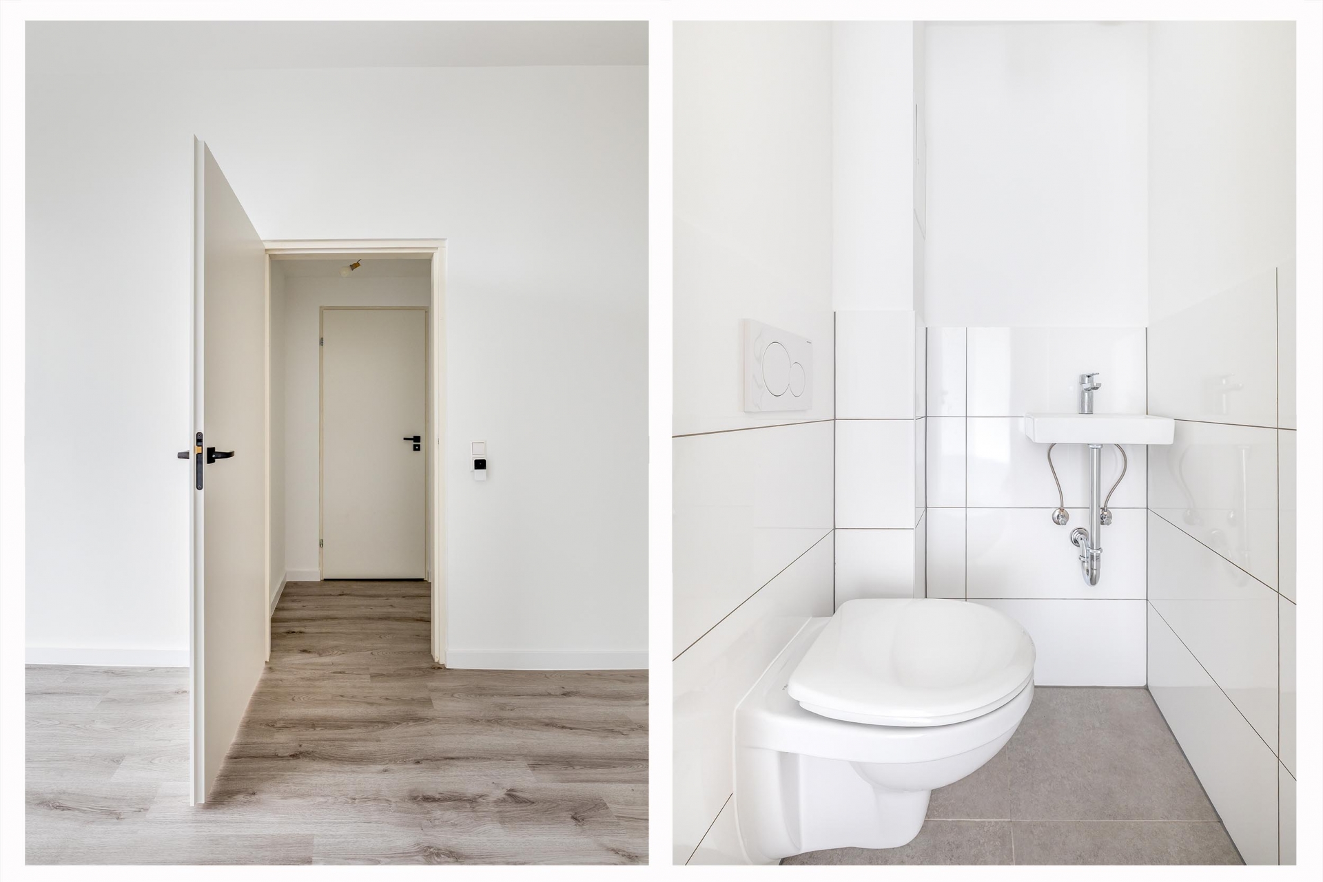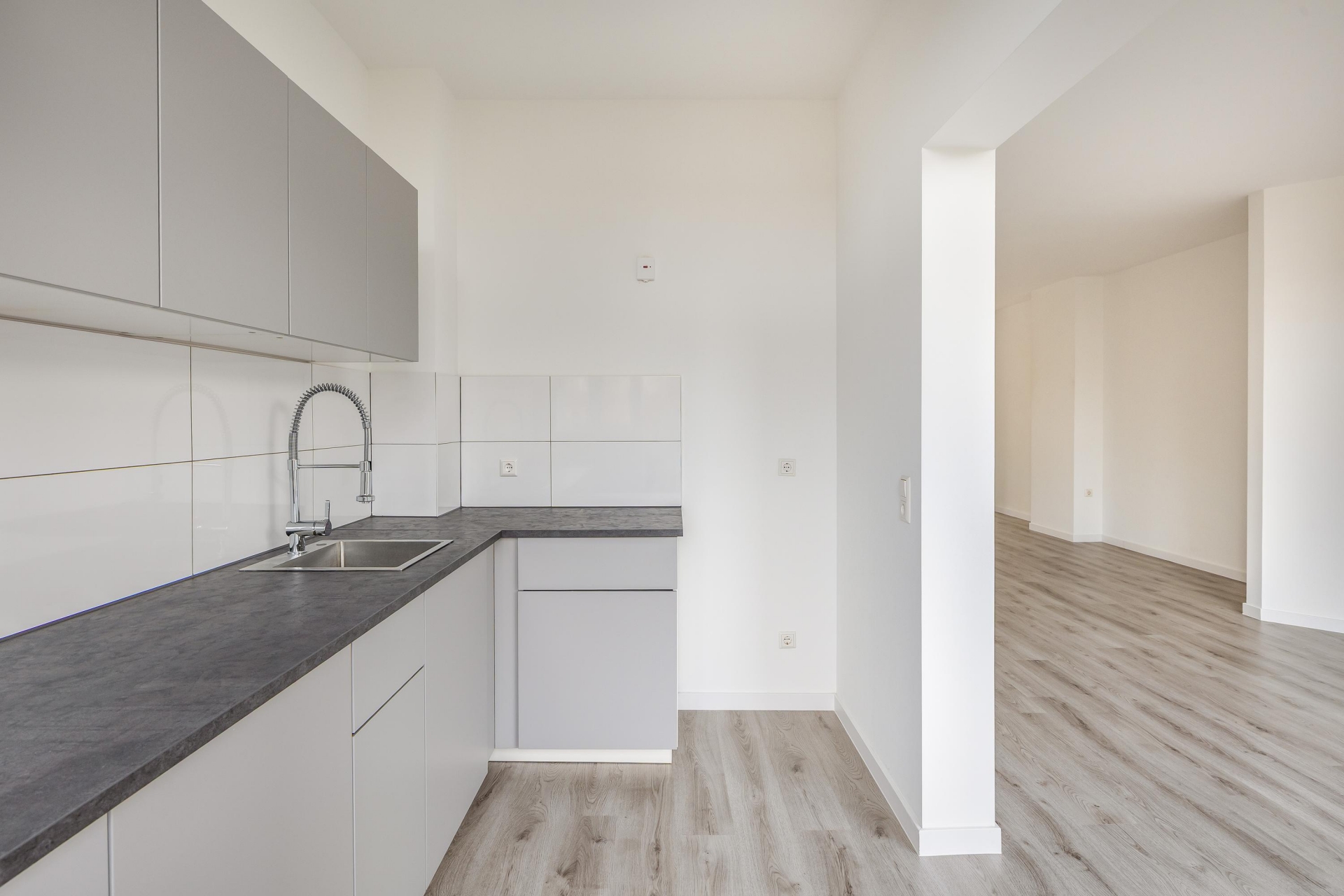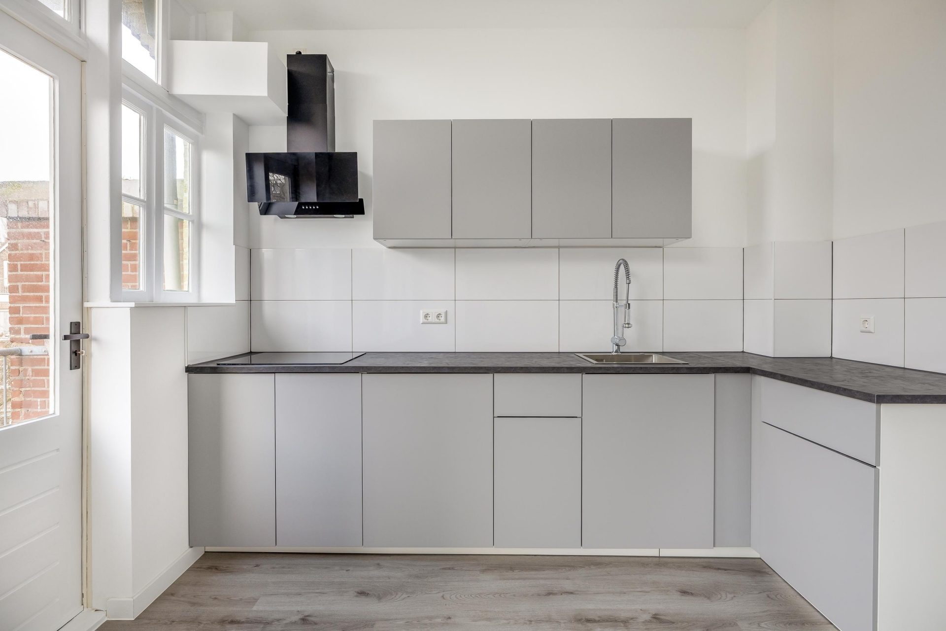 Aan de achterzijde van de woning ligt de open keuken. Een verzorgde en moderne keuken in hoekopstelling met inductiekookplaat, afzuigkap, ruimte voor koel-vriescombinatie en voldoende kastjes. Vanuit de keuken stap je zo het balkon op, waar je vanaf halverwege de middag tot in de avond van de zon geniet.