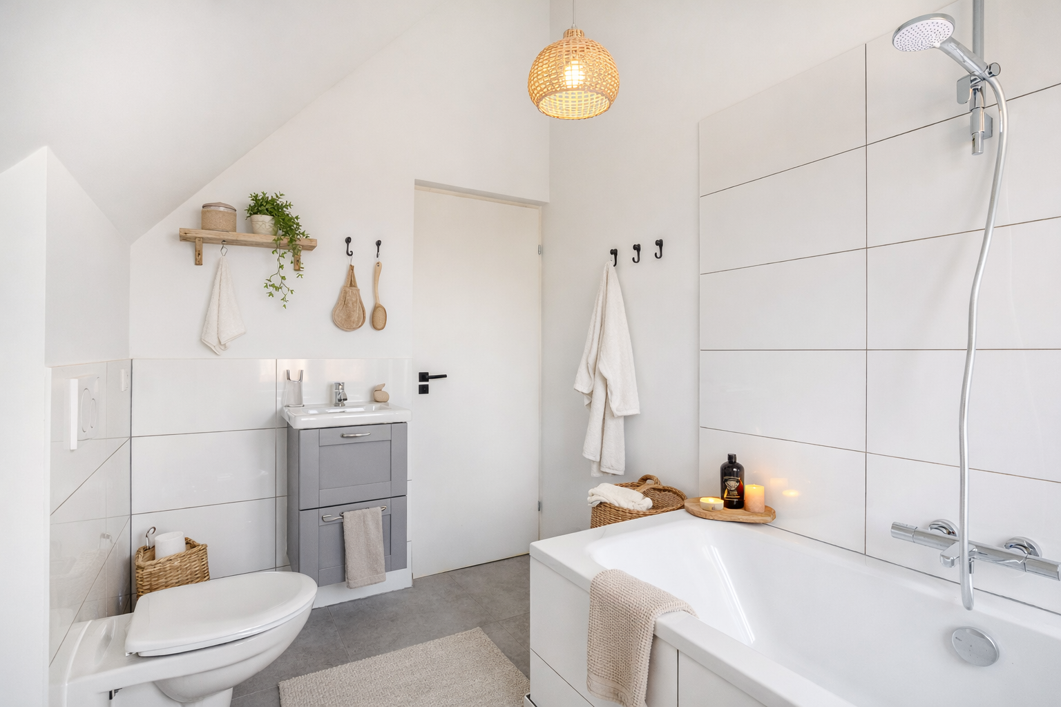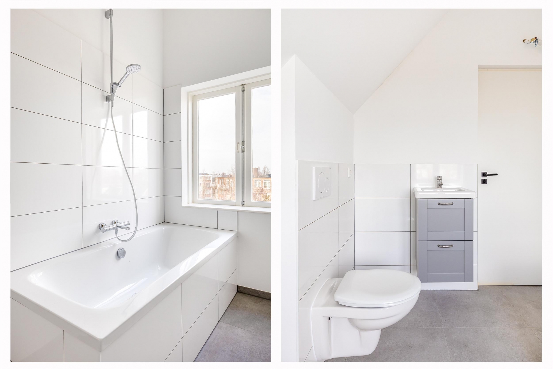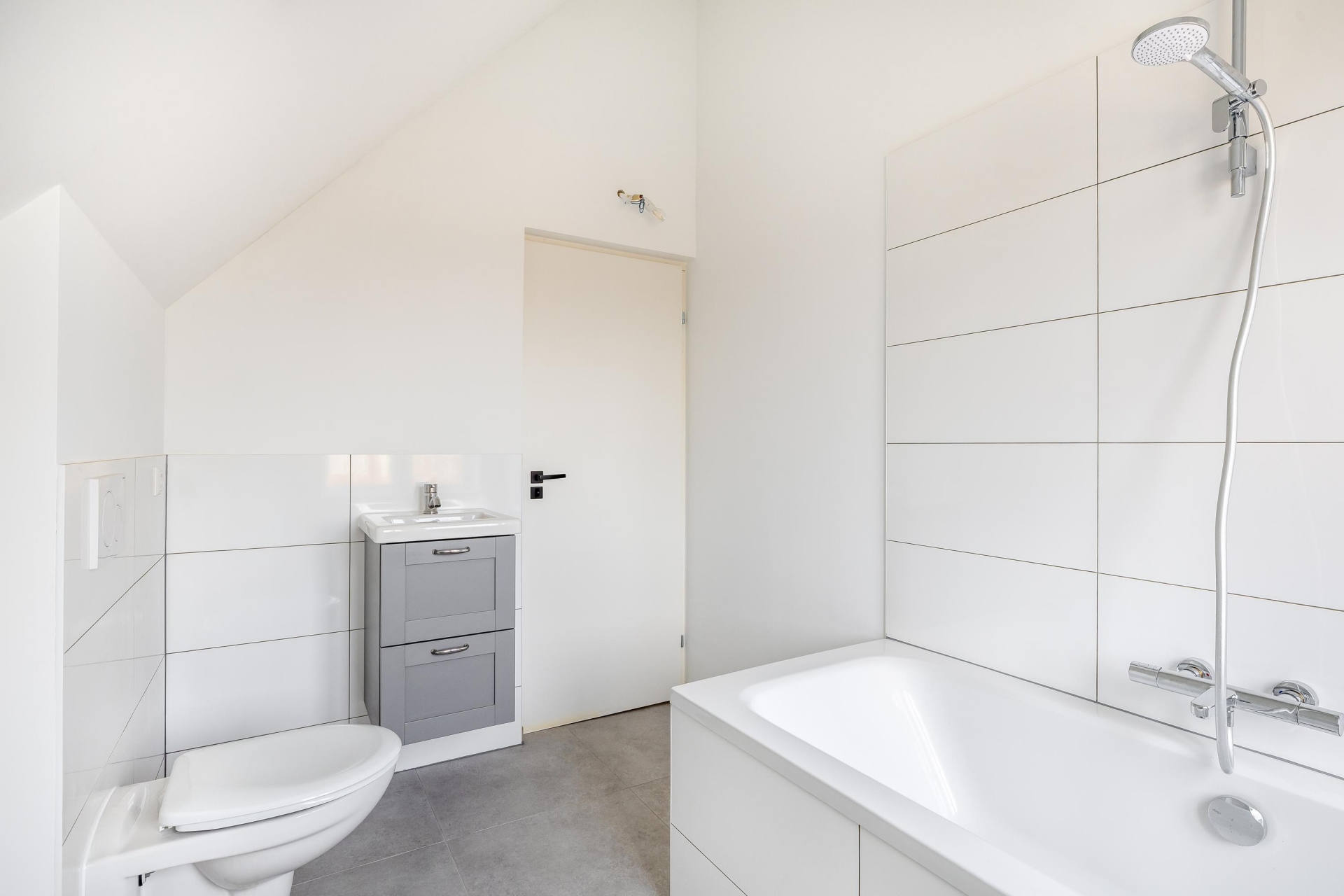 De badkamer is in 2025 vernieuwd en praktisch ingericht met ligbad-douchecombinatie, wastafelmeubel met bergruimte, designradiator en aansluiting voor wasmachine en droger. Ook op deze verdieping vind je de opstelplaats van de CV-ketel (2025).