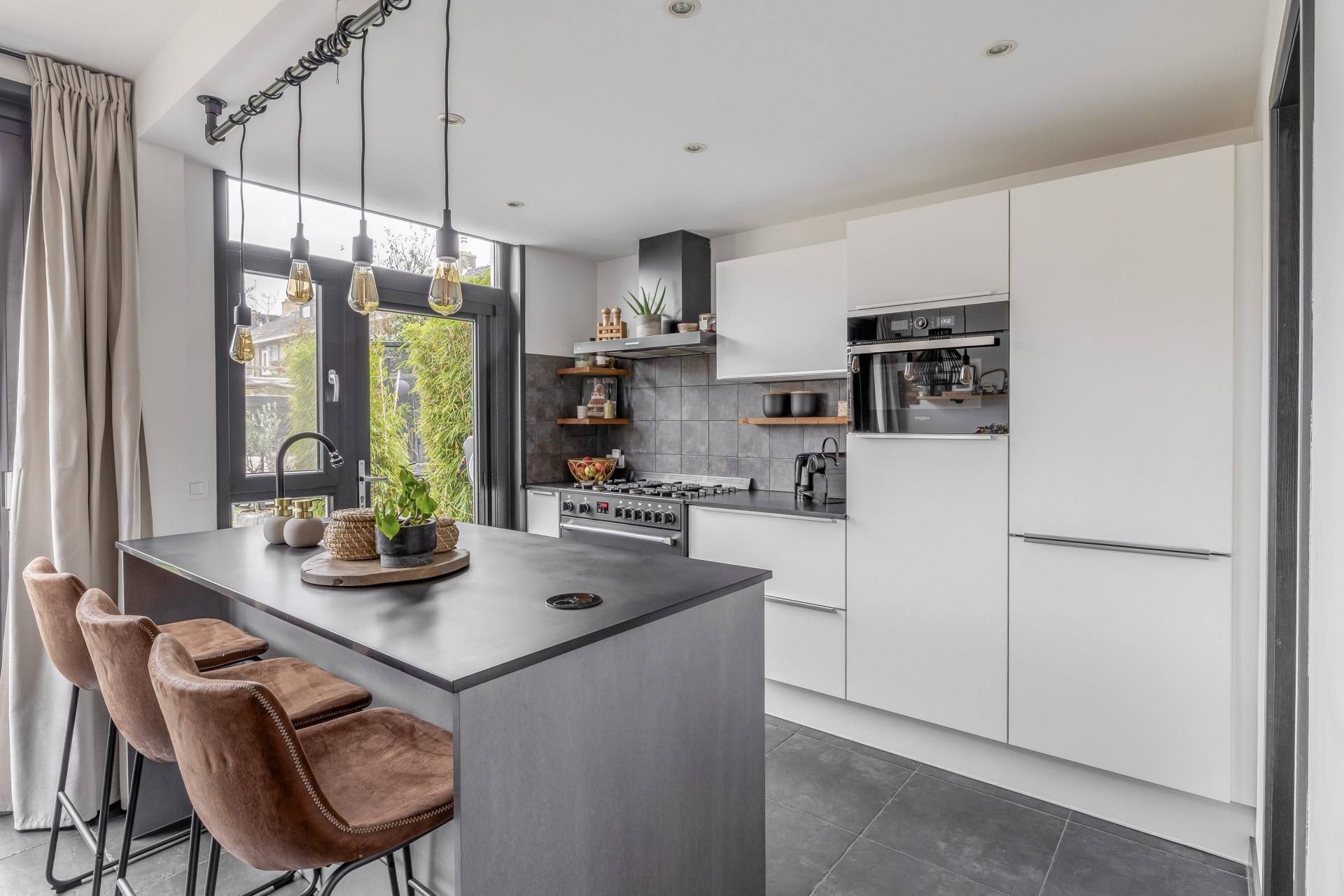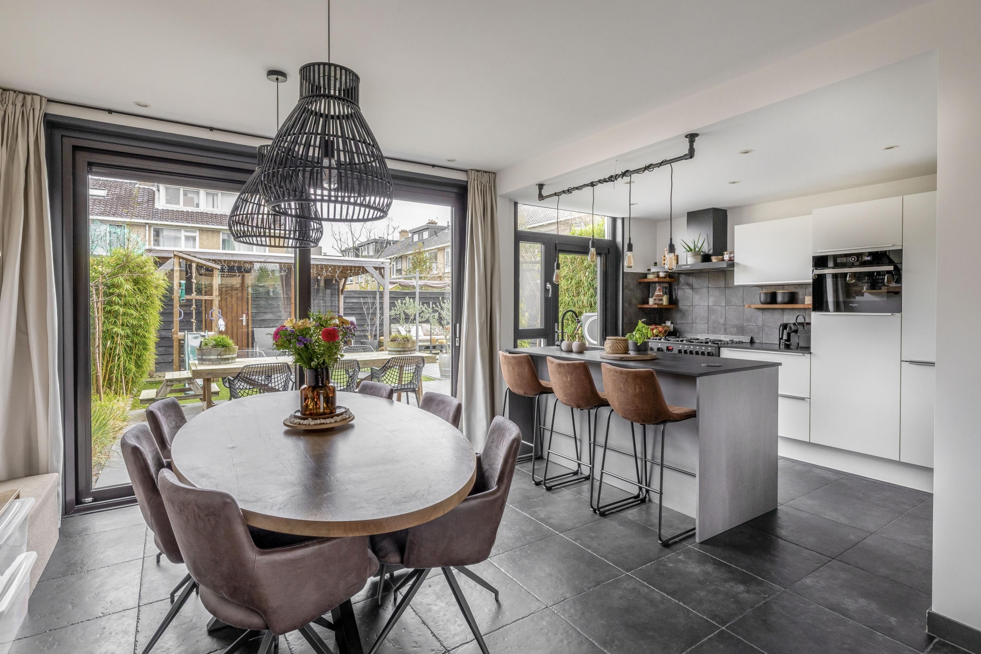 De begane grond is volledig ingericht op comfort en samenzijn. In de moderne open keuken, voorzien van strak keukenblok, spoeleiland met bar en veel werkruimte, bereid je moeiteloos een diner terwijl je gezellig contact houdt met het gezin of gasten. De keuken is volledig uitgerust met inbouwapparatuur en een schuifpui én tuindeur geven direct toegang tot de tuin.