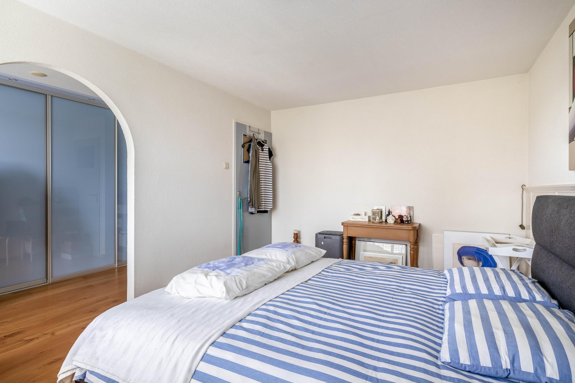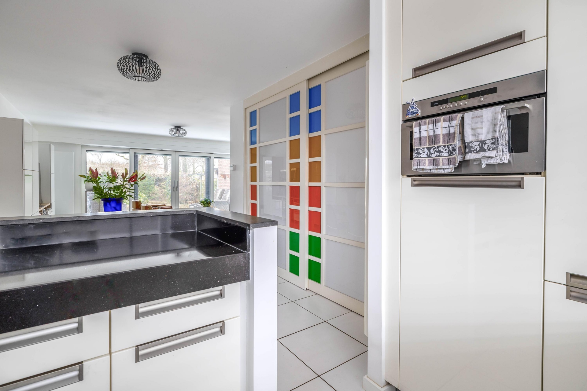 Zodra je binnenkomt, merk je dat dit huis goed onderhouden is. De hal is netjes afgewerkt en geeft toegang tot de woonkamer. De living is ruim opgezet en profiteert van grote raampartijen aan de achterzijde. Dankzij de schuifpui loopt binnen naadloos over in buiten – vooral op zonnige dagen is dat een groot pluspunt.