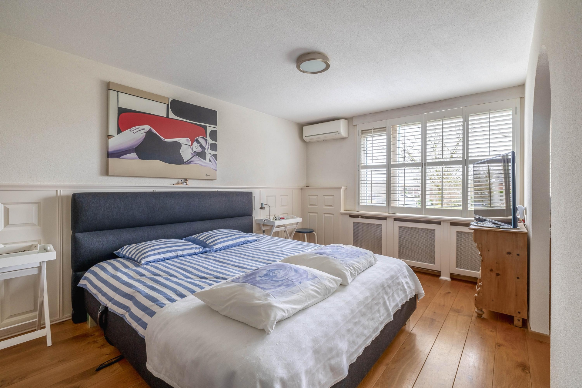 Op de eerste verdieping bevinden zich twee slaapkamers (voorheen 3). De grootste slaapkamer ligt aan de achterzijde en is voorzien van een inloopkast. Ook hier zorgen de ramen voor prettig daglicht. De tweede slaapkamer is ook voldoende ruim. Eventueel is de inloopkast weer om te bouwen tot slaapkamer, wat het voorheen ook was.