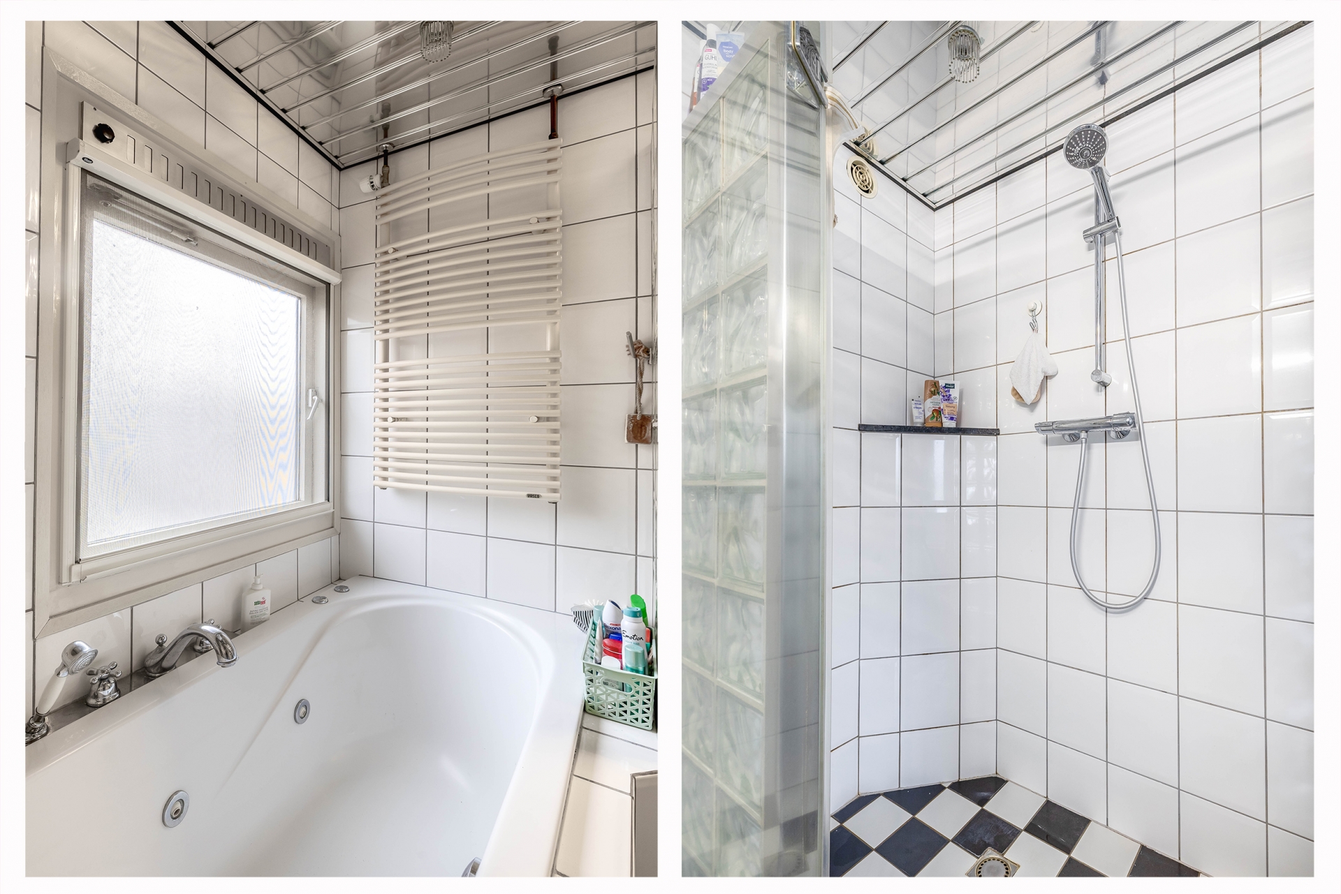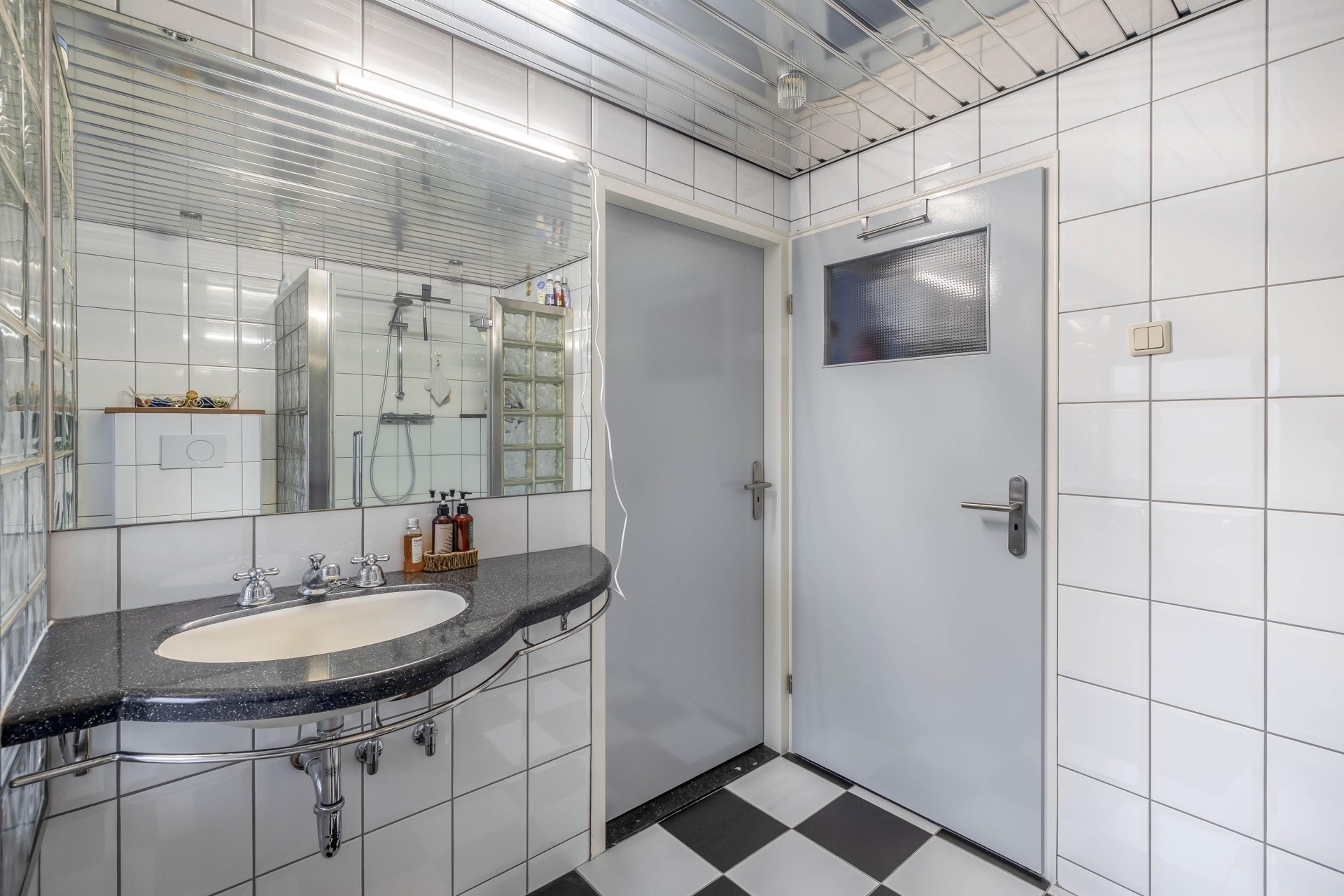 De badkamer is ruim, luxe- en praktisch ingericht.