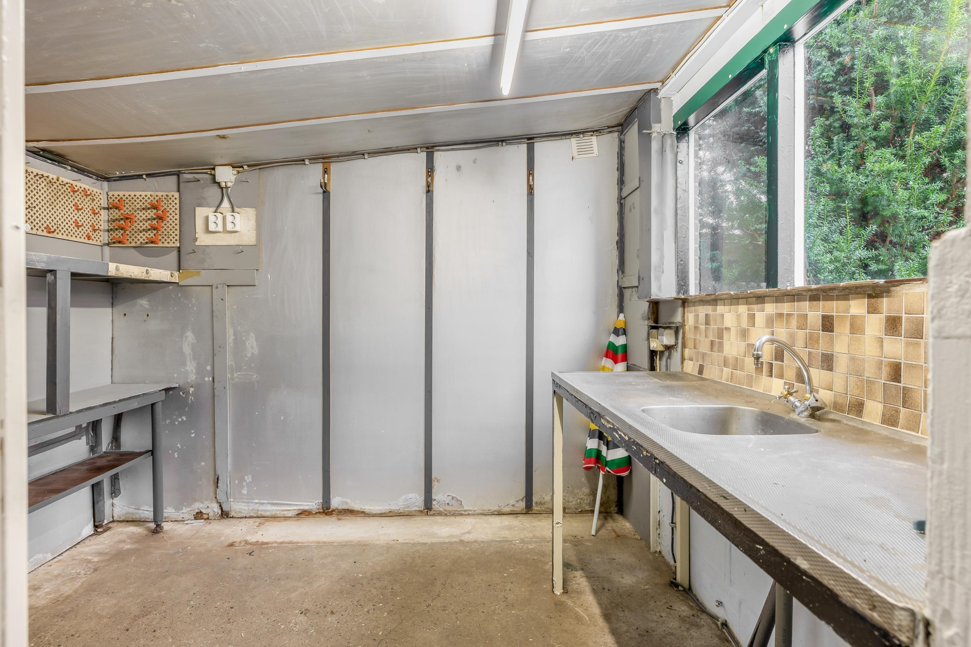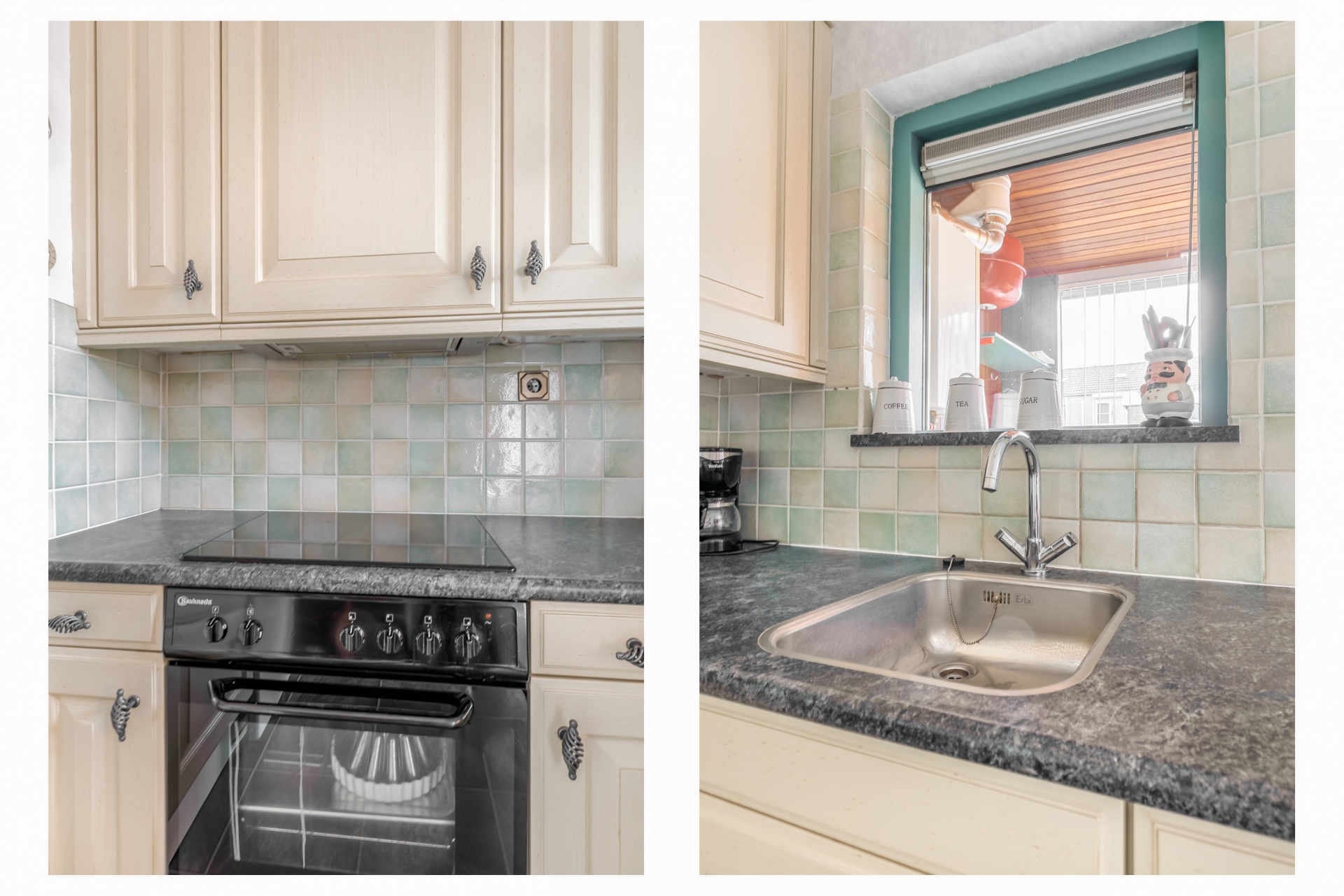 Aan de achterzijde vind je een halfopen keuken met landelijke uitstraling. De opstelling in L-vorm zorgt voor veel werkruimte én opbergruimte, en de neutrale kleuren sluiten goed aan bij verschillende interieurstijlen. Er is een oven, kookplaat, afzuigkap en koelkast aanwezig. Vanuit de keuken stap je zo de bijkeuken in. Ook hier valt het daglicht prettig naar binnen dankzij het raam boven het aanrecht.