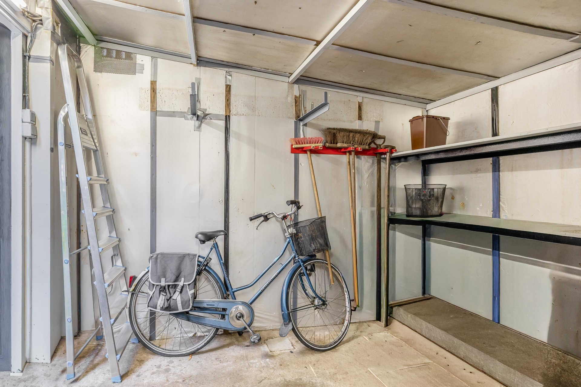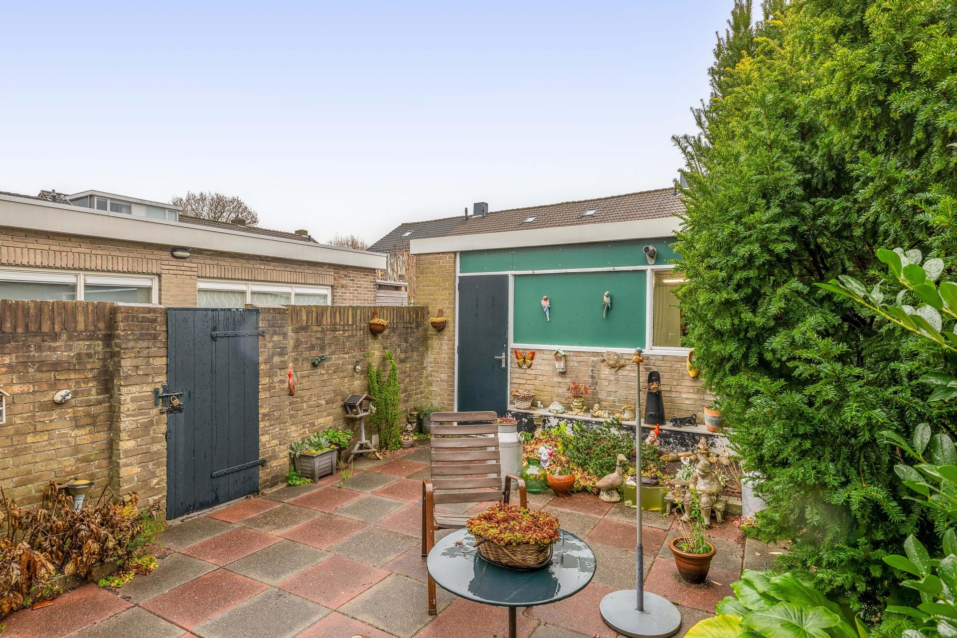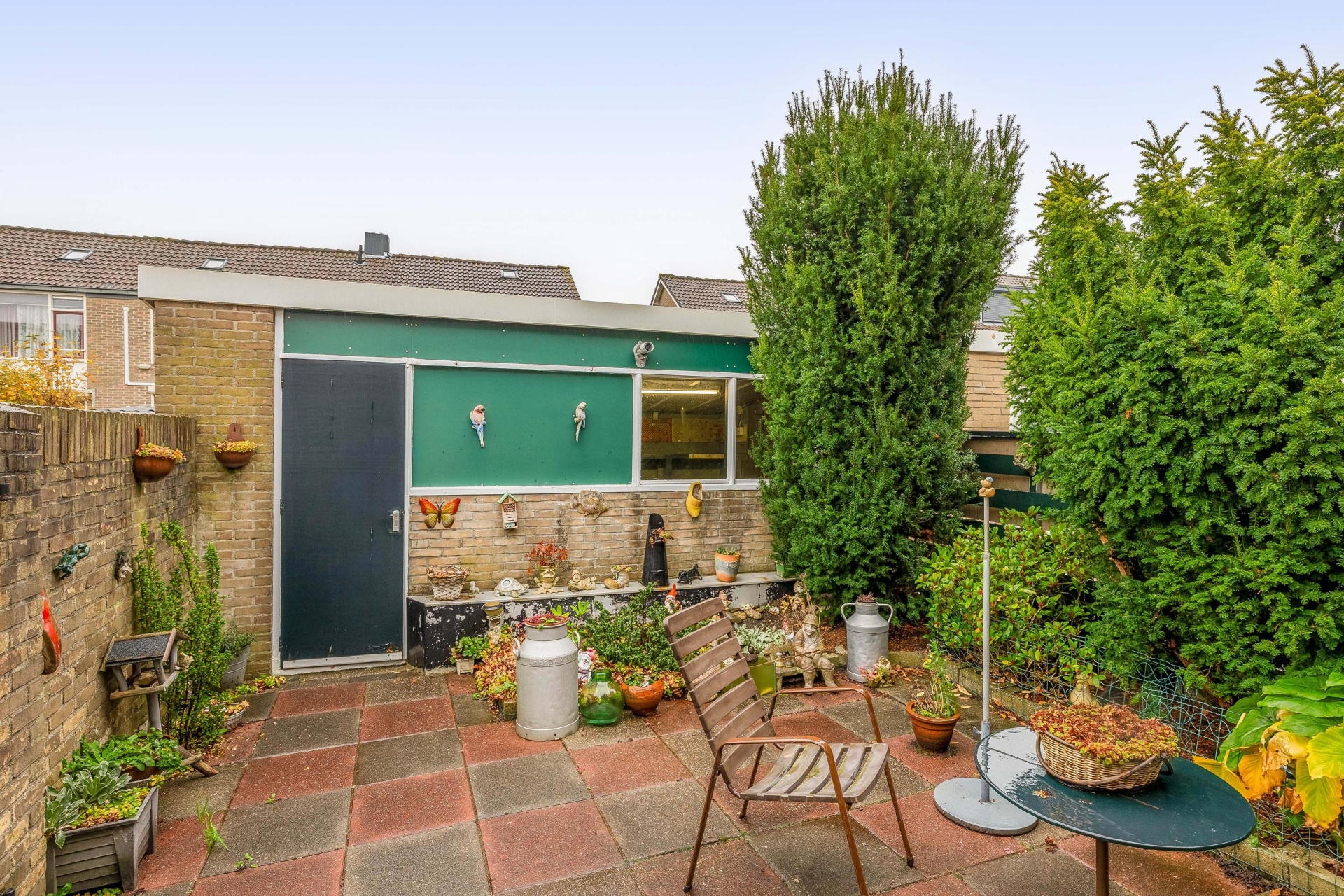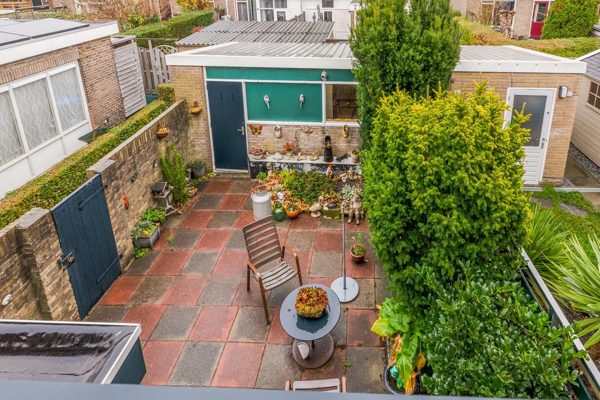 De achtertuin ligt op het oosten en is grotendeels bestraat, met aan weerszijden borders en beplanting. Hier kun je al vroeg op de dag van de zon genieten. Achterin de tuin staat een verrassend ruime hobbyschuur — perfect voor klussers, creatieve hobby’s of als opslagruimte. De tuin is onderhoudsvriendelijk en biedt veel privacy door de ligging aan de zijkant van de rij. Met een paar sfeervolle meubels en een parasol is dit in de zomer jouw favoriete plekje!