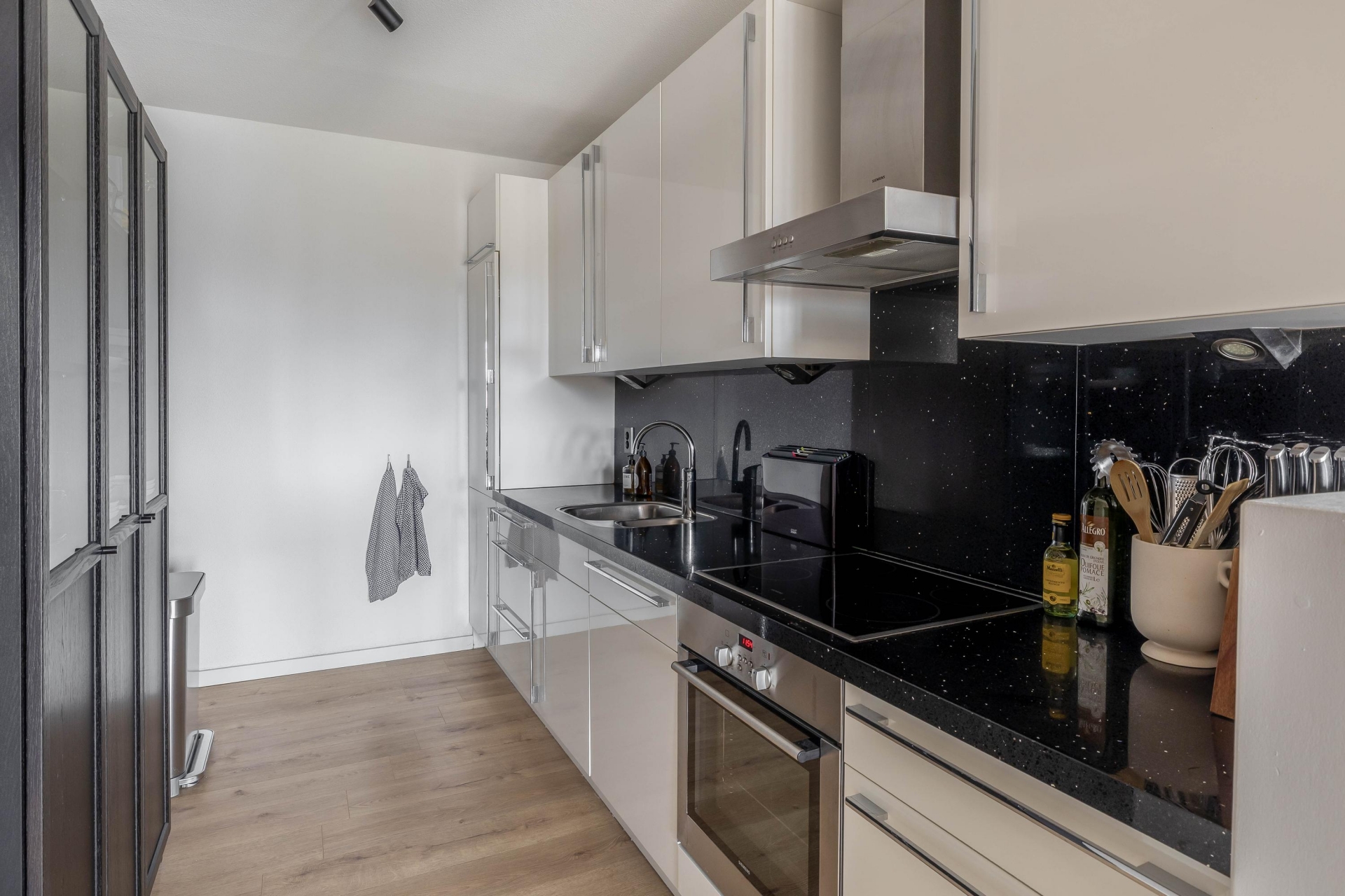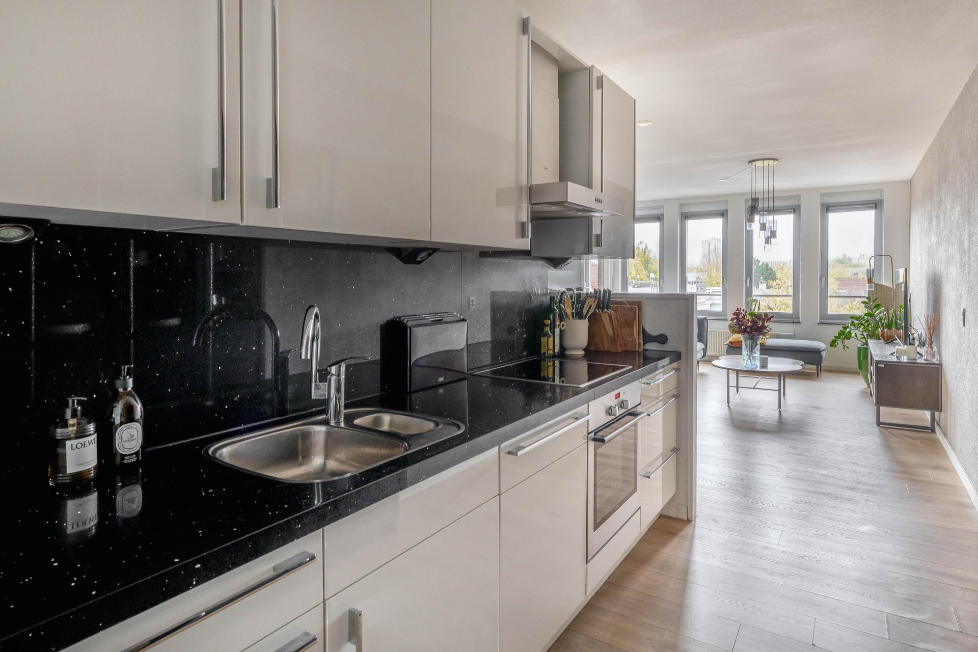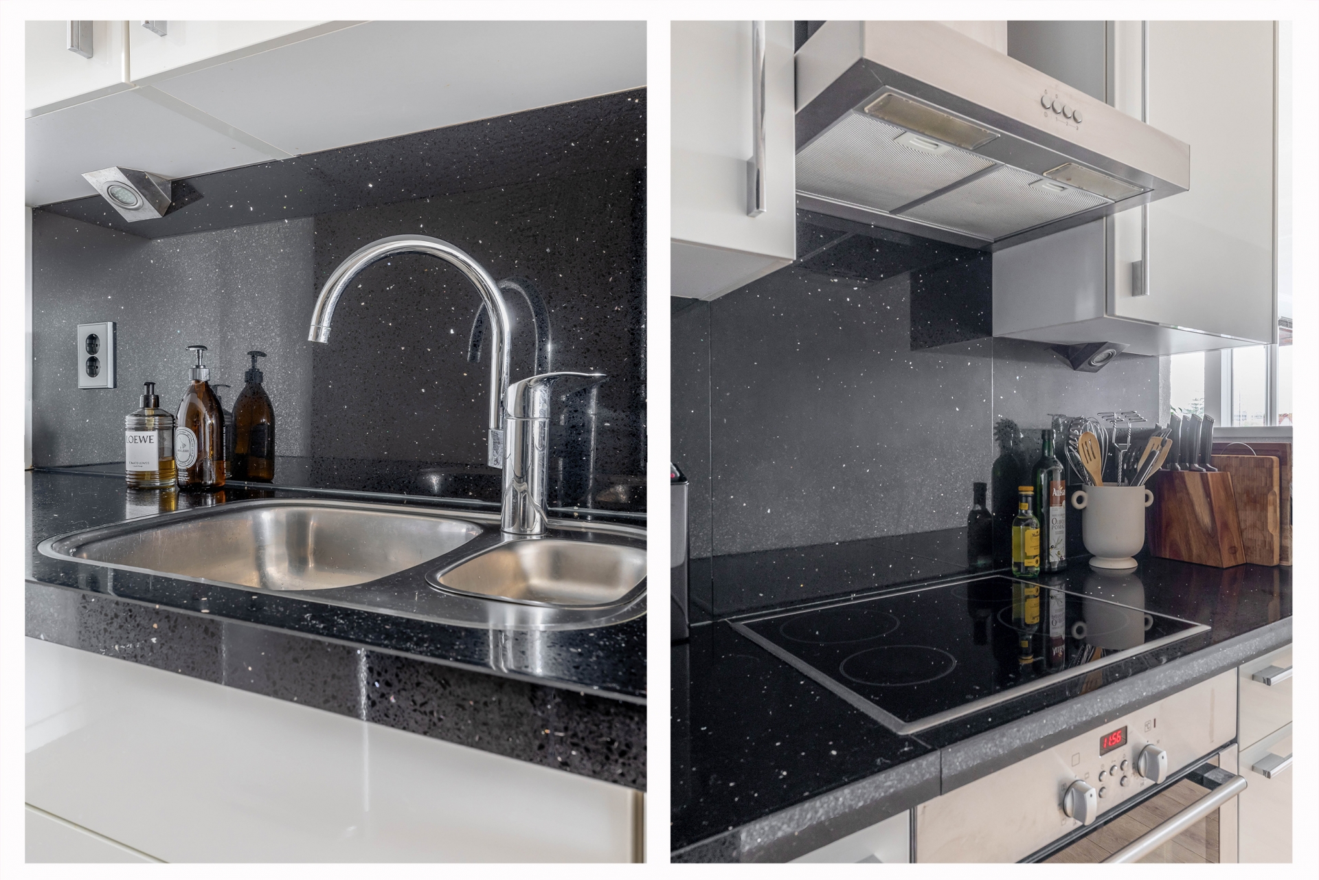 De open keuken is geplaatst in een rechte opstelling en heeft een strak zwart werkblad. Je hebt hier alles bij de hand: een keramische kookplaat, oven, afzuigkap, vaatwasser en een koel-vriescombinatie. De opstelling is praktisch en ruim genoeg om ook met meerdere personen tegelijk te koken.
