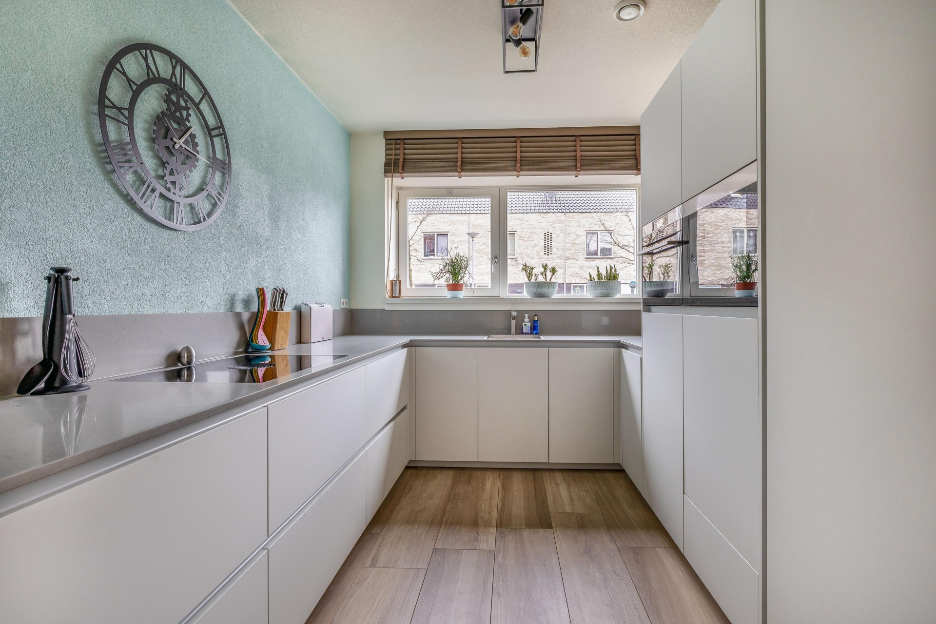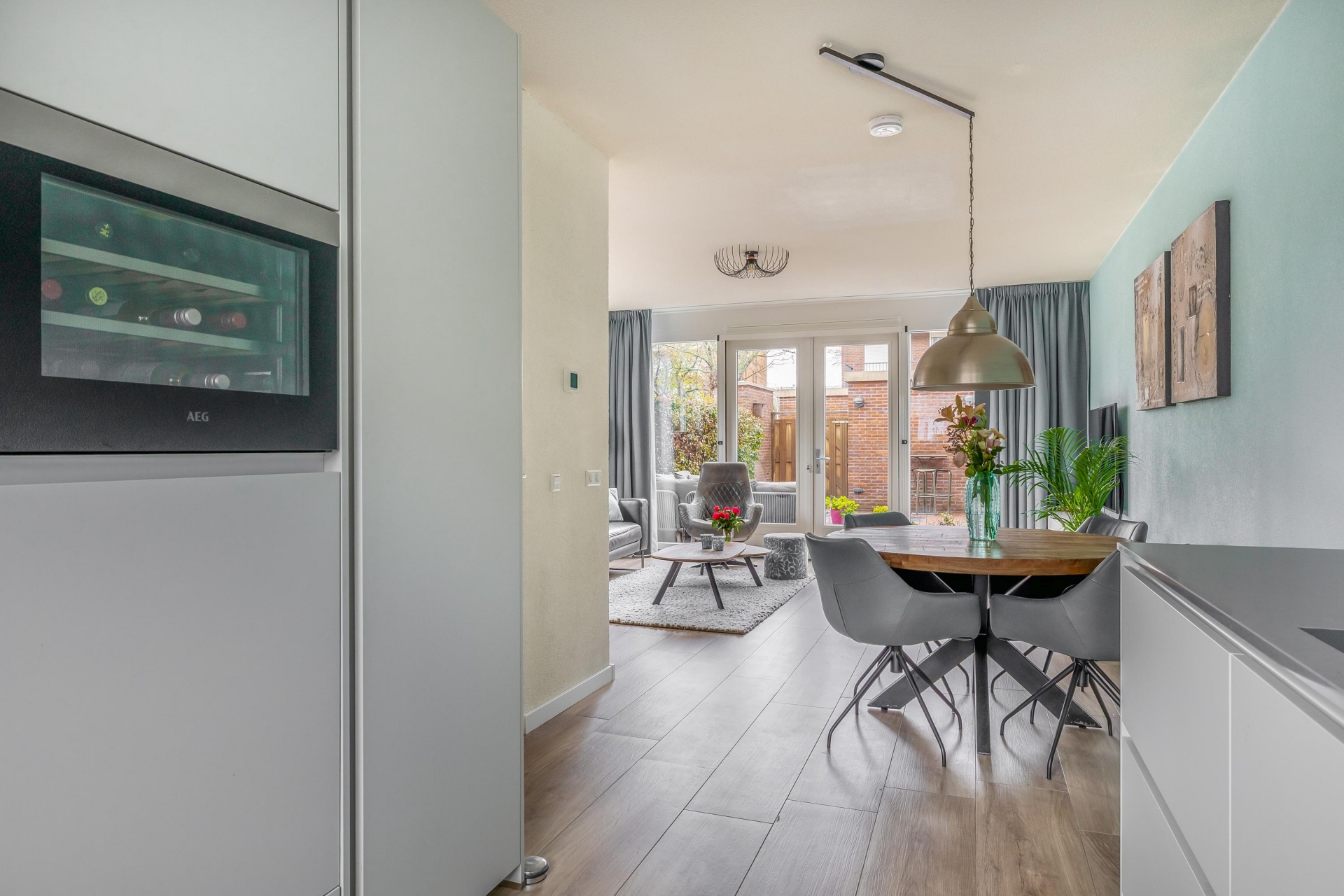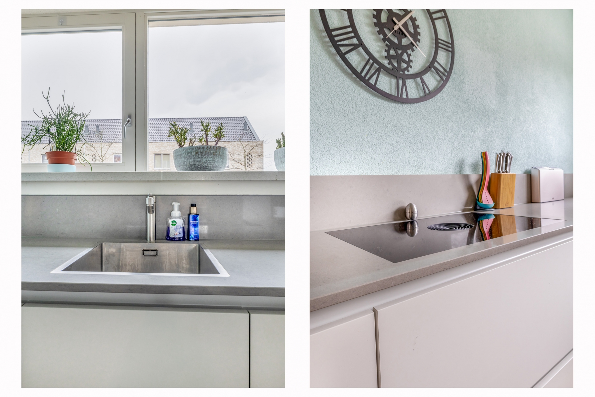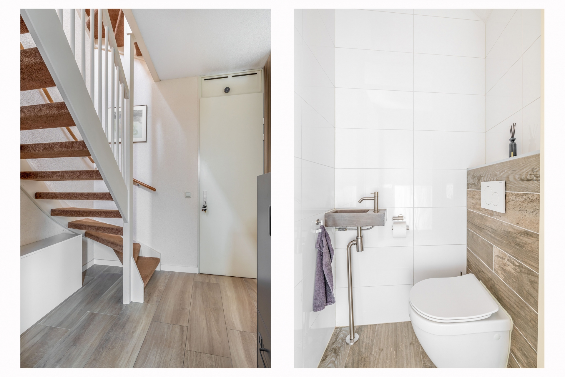Op de begane grond zorgt de slimme indeling voor een fijne leefruimte. De woonkamer met dubbele tuindeuren en strakke afwerking is heerlijk licht en biedt volop ruimte voor een comfortabele zithoek. De keuken aan de voorzijde is modern, strak en voorzien van inbouwapparatuur. Denk aan een inductiekookplaat met geïntrigeerde afzuigkap, combi-oven, vaatwasser en veel bergruimte. De open opstelling zorgt voor een sociale verbinding tussen koken en wonen. De hal beschikt over een modern toilet, trapopgang en meterkast.