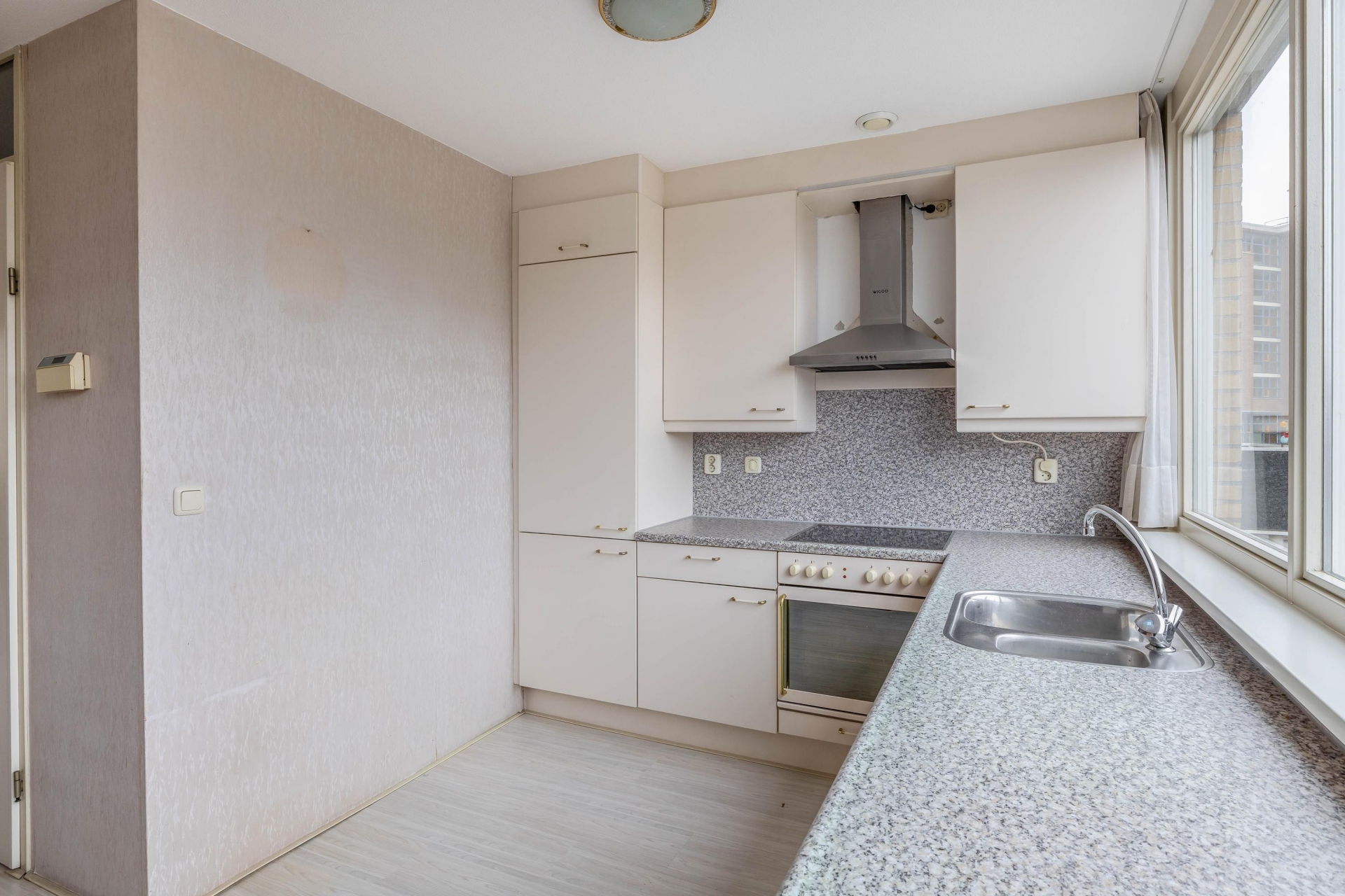 De keuken in L-opstelling is voorzien van diverse inbouw apparatuur (afzuigkap, keramische kookplaat, koel-vriescombinatie, spoelbak en vaatwasser).