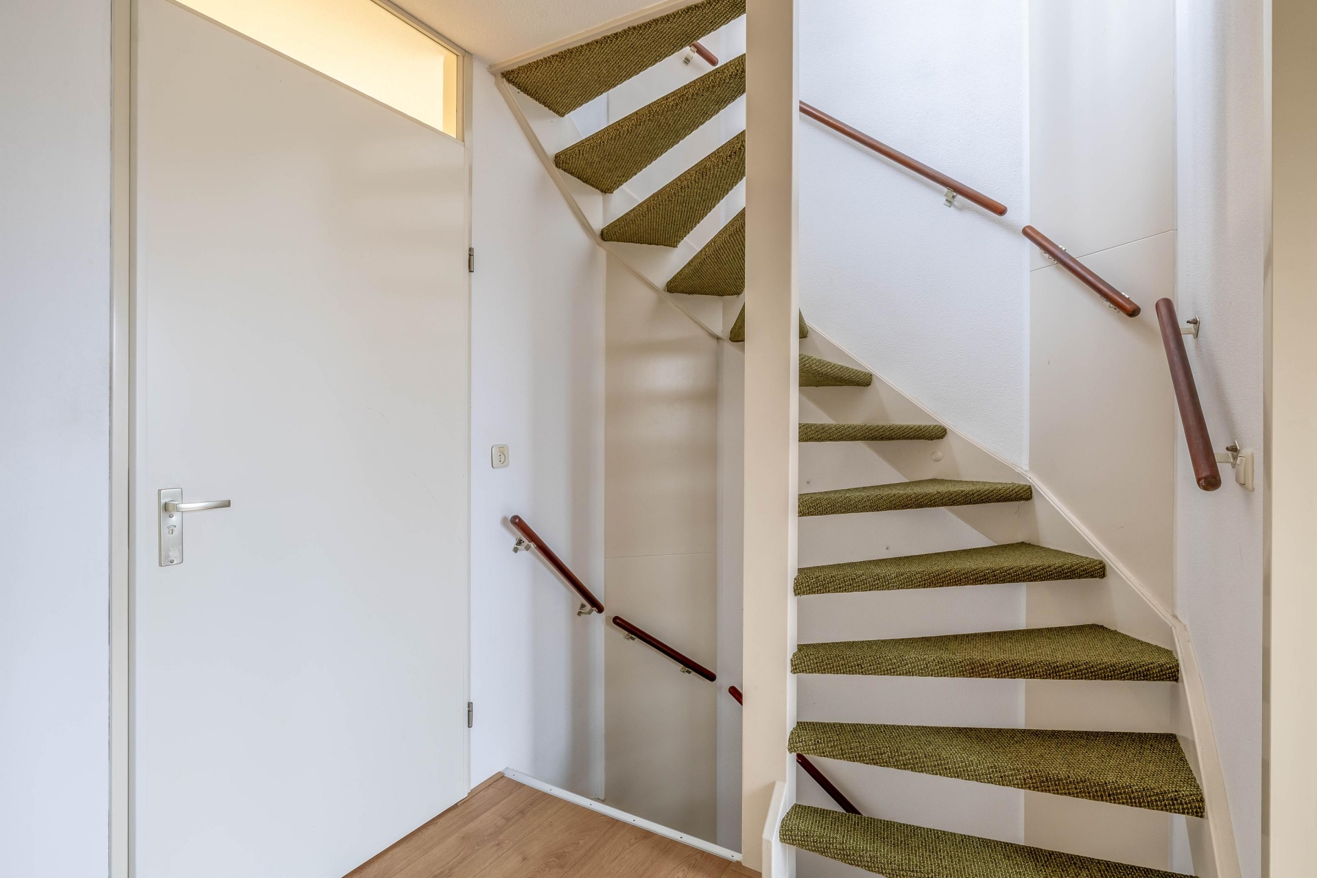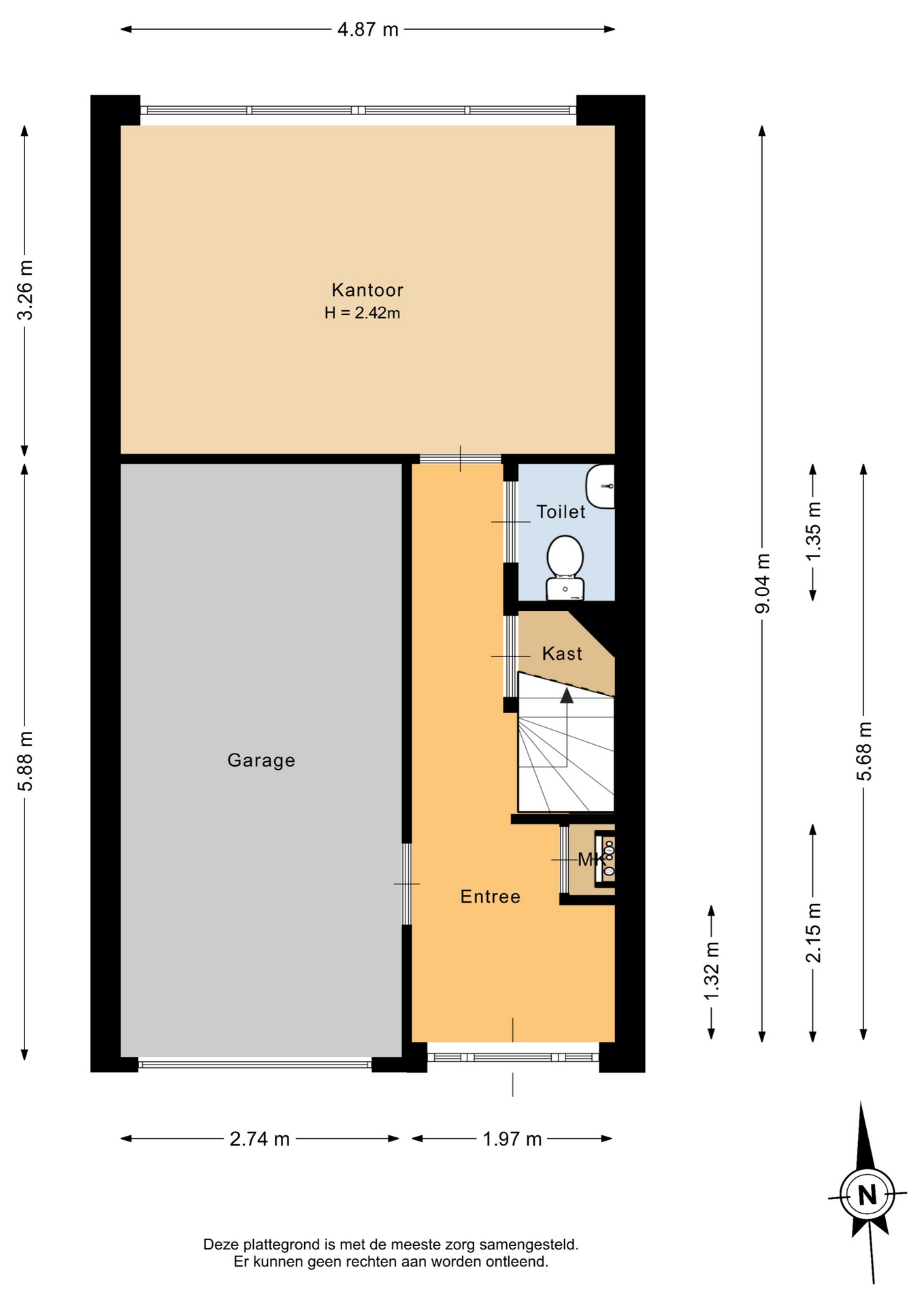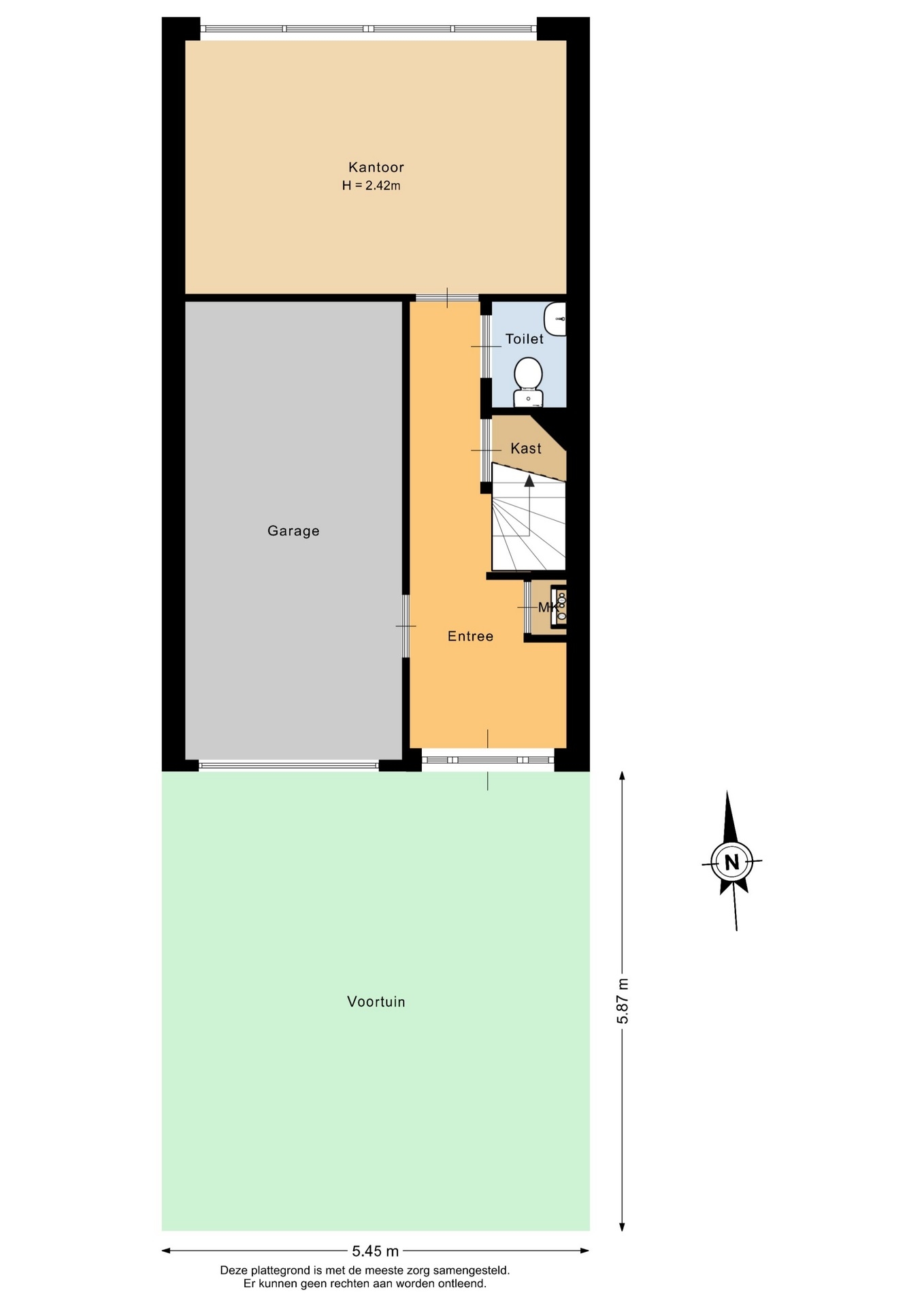 Entree met ruime hal (7.5m²), waar vandaan toegang tot meterkast, trapkast, trap opgang, toilet, garage en kantoor (15.9m²).
