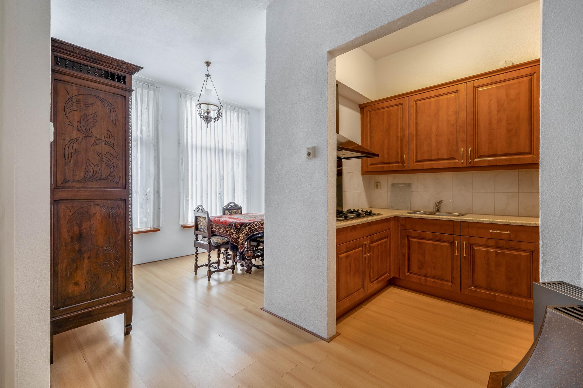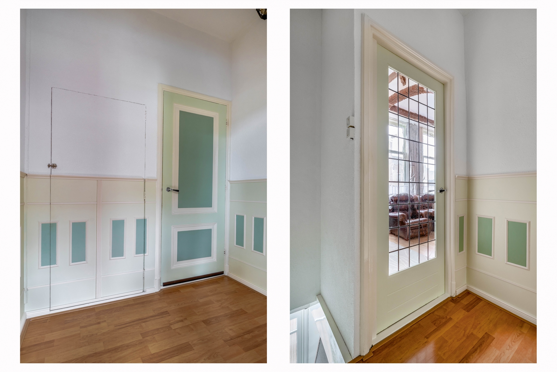 De woning straalt historie uit, met prachtige hoge plafonds, houten balken en klassieke raampartijen die het daglicht royaal binnenlaten. De woonkamer aan de voorzijde is sfeervol ingericht met originele details zoals de fraaie toog, houten kozijnen en brede raampartijen. Hier is de tijd op een mooie manier stil blijven staan, maar met voldoende ruimte om het geheel naar eigen smaak en comfort te moderniseren.