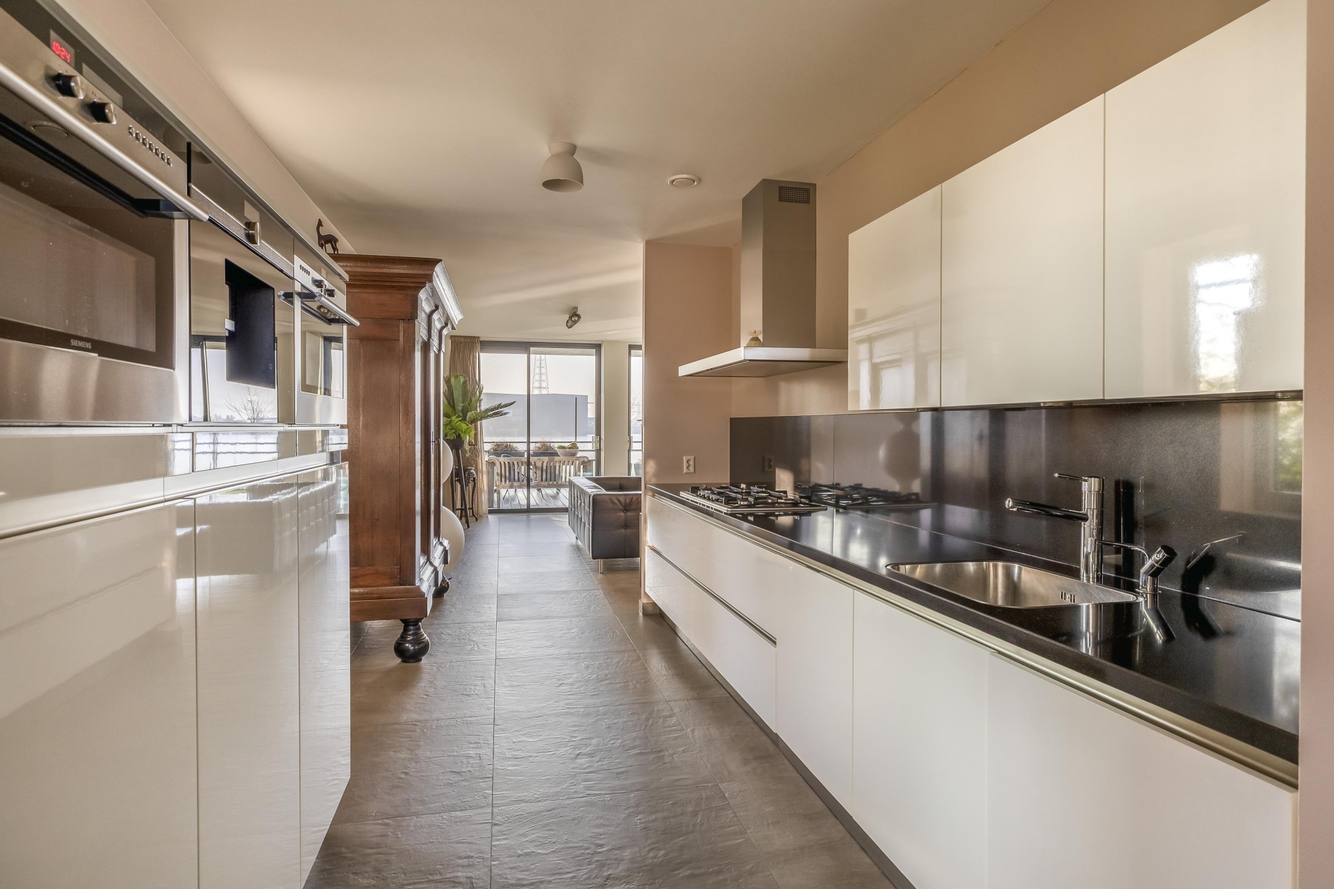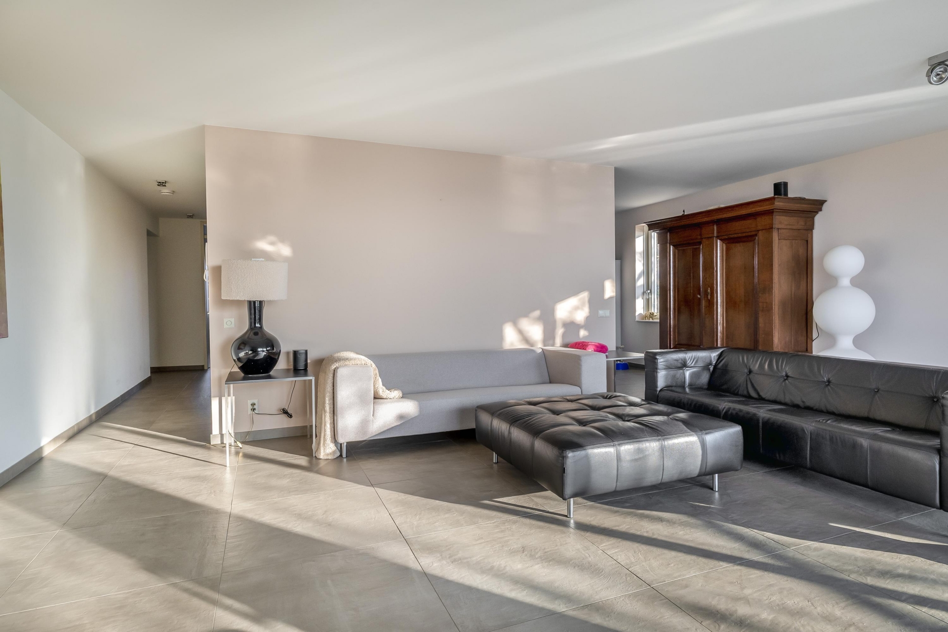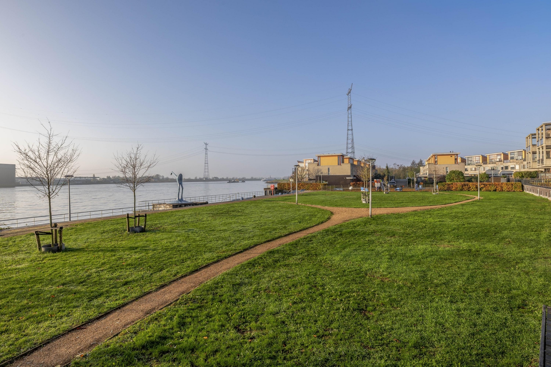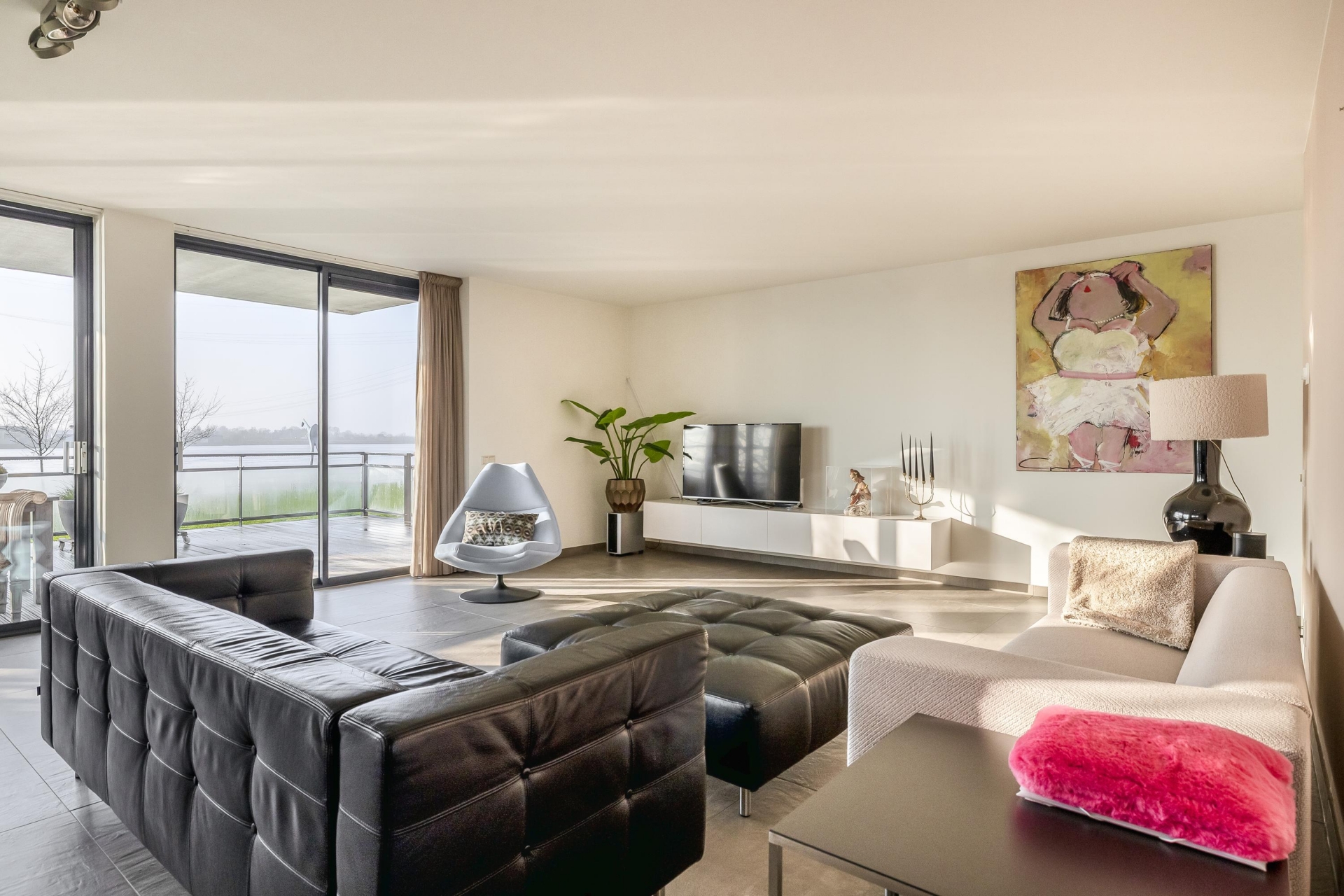 De afwerking is strak en warm tegelijk: grote vloertegels, een ingetogen kleurenpalet en nette wandafwerking zorgen voor een luxe uitstraling. Dankzij de directe verbinding met het terras en het uitzicht op de rivier leef je hier net zo goed buiten als binnen.
