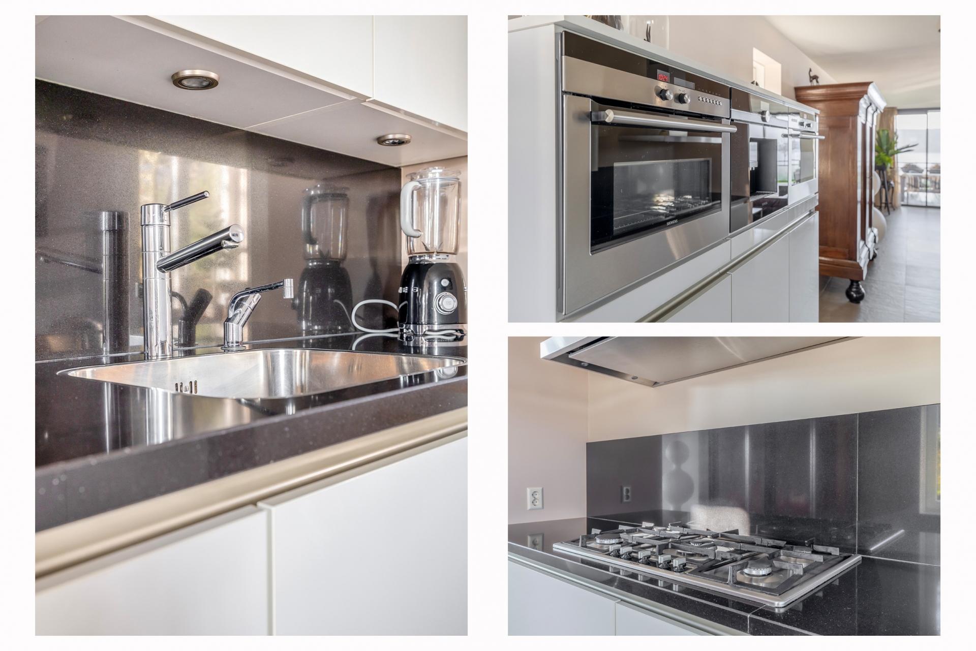 De keuken is modern uitgevoerd in een stijlvolle hoogglans opstelling met strakke lijnen, greeploze fronten en een donker werkblad. Alles wat je nodig hebt is aanwezig: een gaskookplaat met afzuiging, combimagnetron, oven, vaatwasser, koel-vriescombinatie, koffie-apparaat en een grote spoelbak. Het geheel sluit naadloos aan op het zit- en eetgedeelte, waardoor je tijdens het koken altijd in contact bent met je gezelschap.